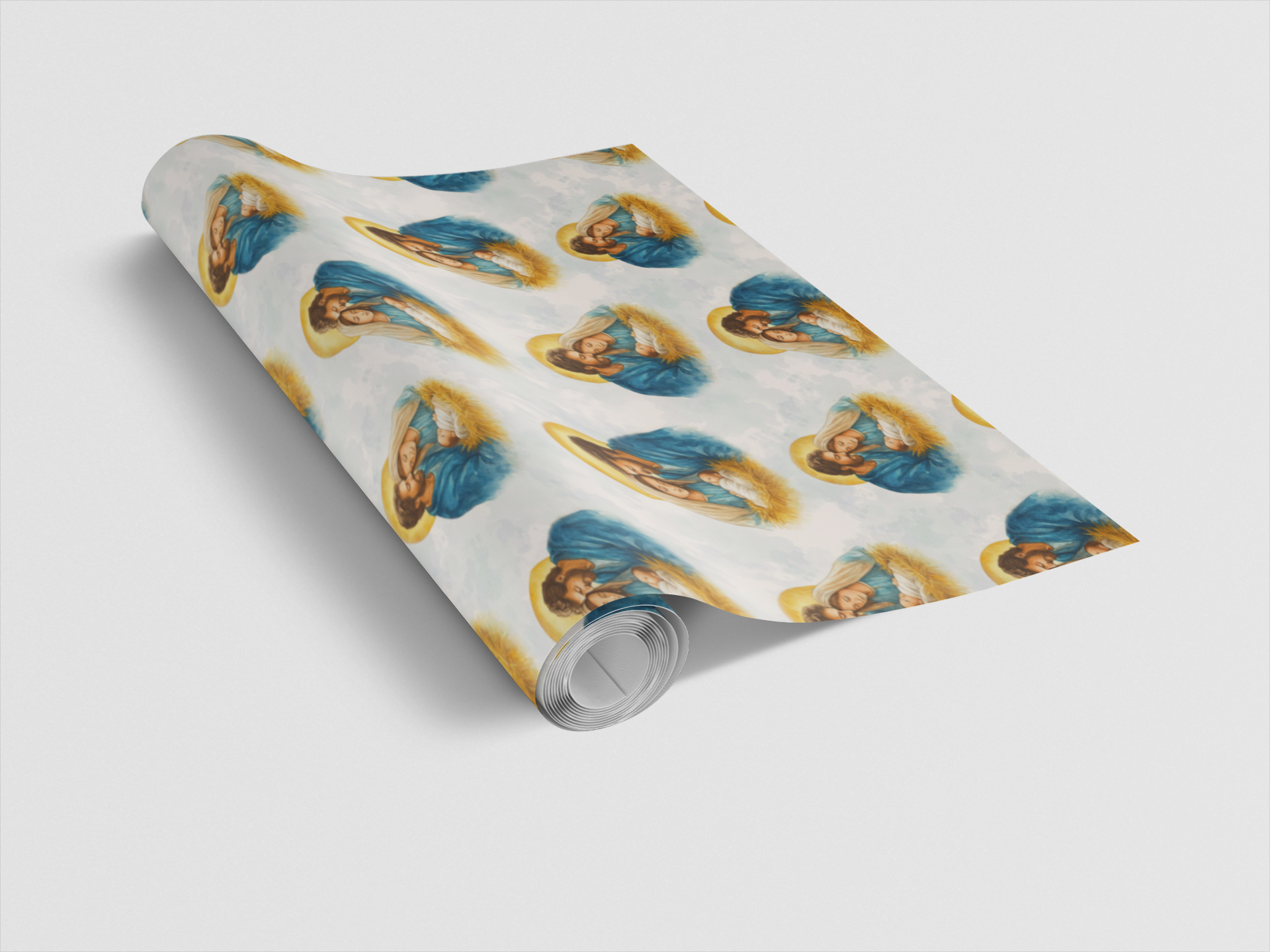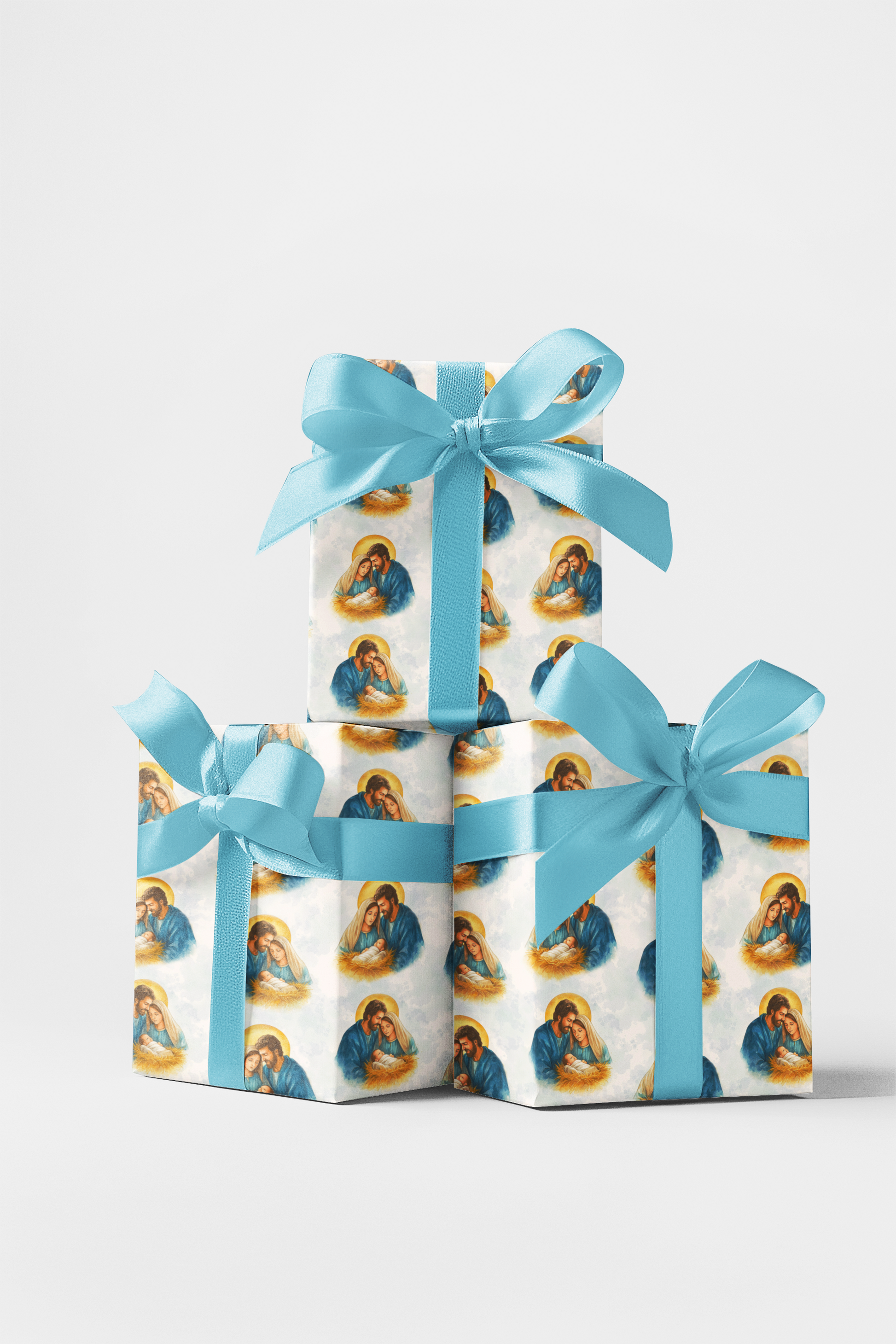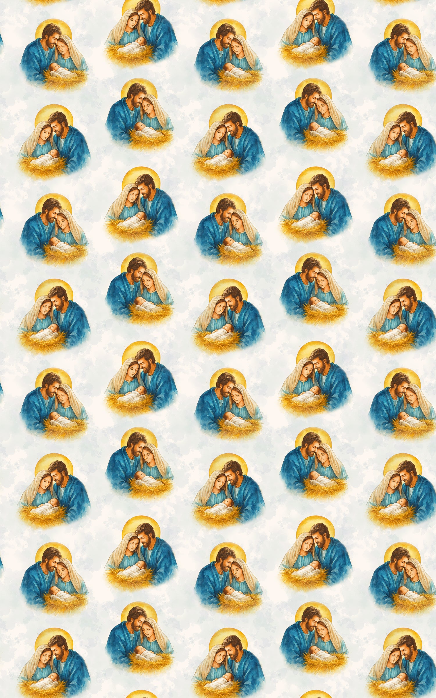 Celebrate the heart of Christmas with our Holy Family Halo design. This elegant pattern features a stylized depiction of Mary, Joseph, and baby Jesus surrounded by glowing halos in warm, radiant tones. The gentle palette and graceful illustration evoke peace, love, and devotion, making it perfect for Christmas wrapping, cards, and décor that honor the season’s sacred beauty.