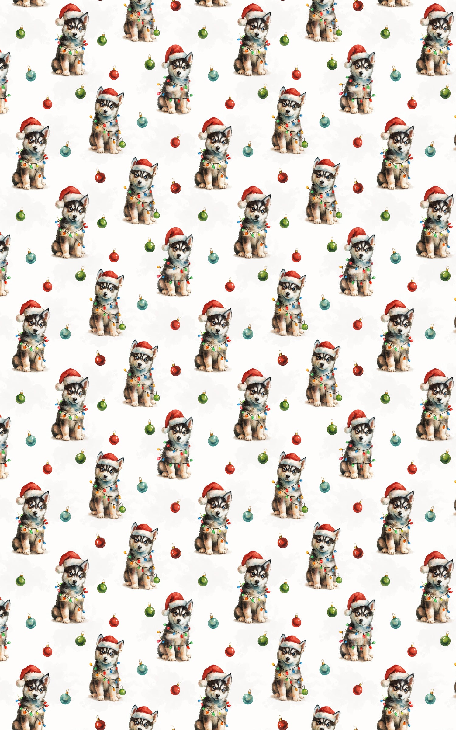 Celebrate the magic of the season with this heartwarming wrapping paper featuring playful Husky pups decked out in Santa hats and twinkling Christmas lights. Illustrated in watercolor and set against a crisp white background, this seamless pattern captures the cozy charm of winter festivities. Perfectly spaced for an elegant finish, it’s ideal for wrapping gifts, crafting holiday décor, or bringing a cheerful sparkle to your celebrations.