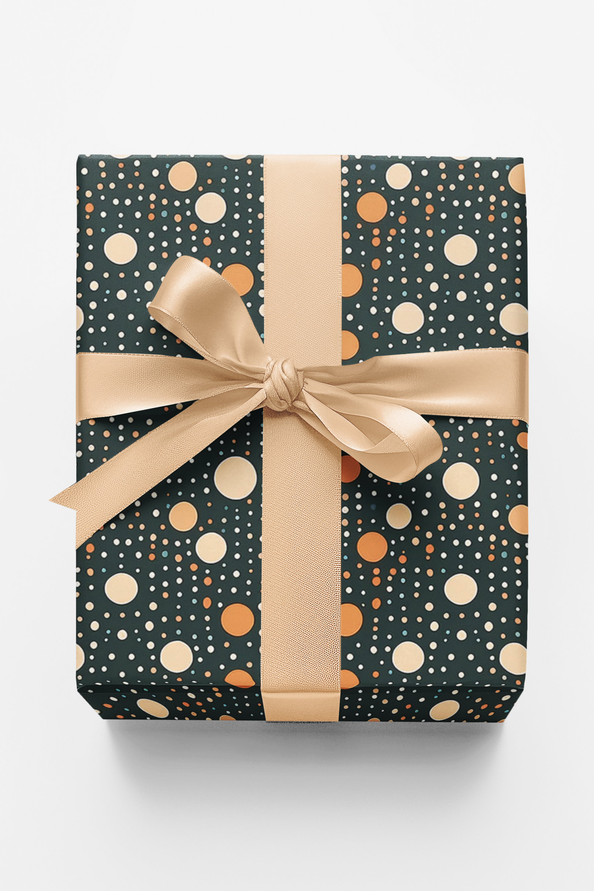 Dive into a galaxy of color with our Inky Polka Paper wrapping paper. This whimsical, contemporary design features a dynamic scattering of polka dots in varied sizes, with many exhibiting a charming, hand-drawn spiral texture. Set against a dramatic deep navy background, the dots pop in a vibrant palette of creamy white, soothing teal, and energetic burnt orange. Perfect for modern birthdays, baby showers, or any gift that needs a touch of bold, artistic fun. It’s a clean yet imaginative take on the classic polka dot pattern.
