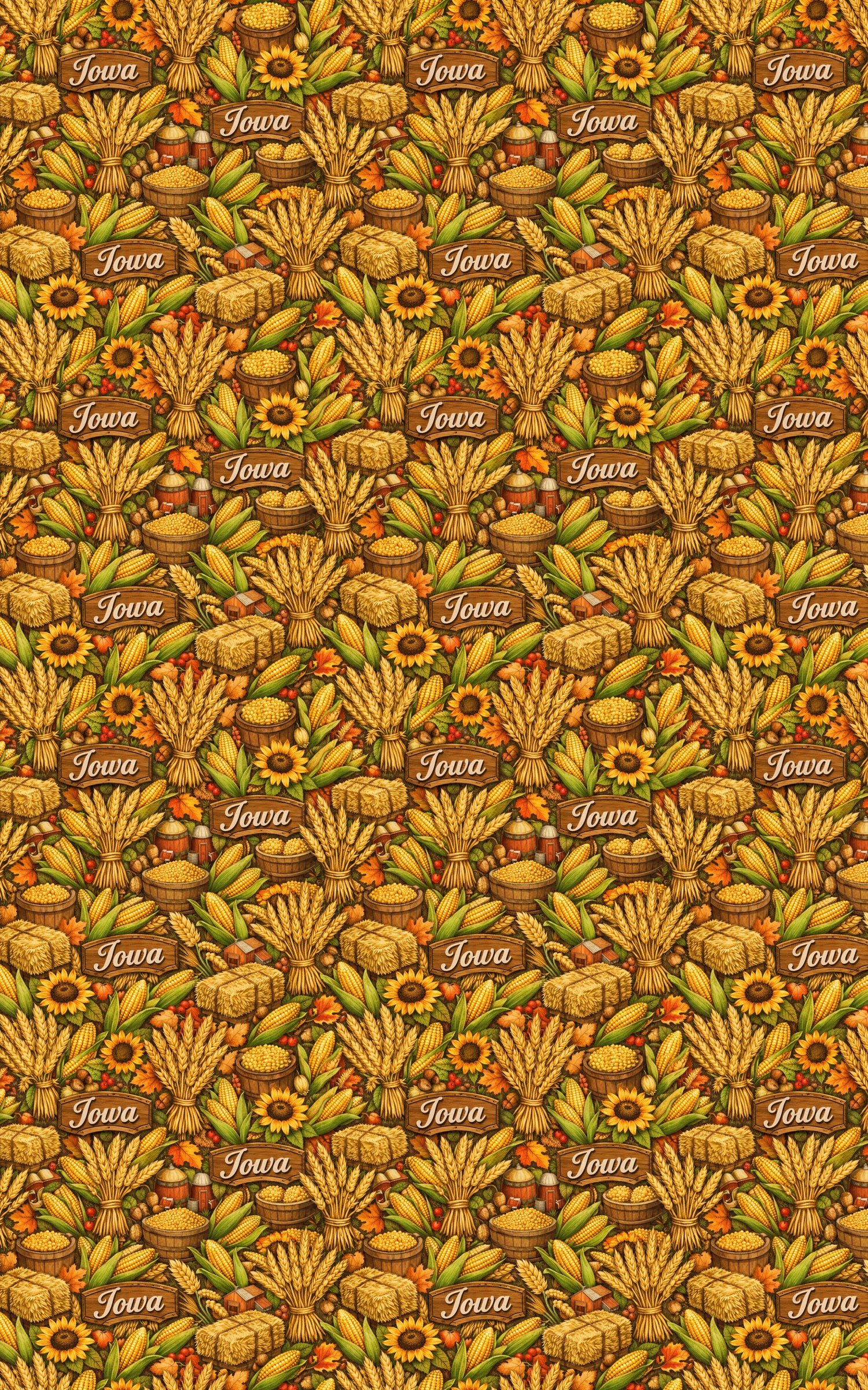 Rich with abundance and rustic charm, Iowa Harvest Grain rises from the heart of the Midwest in warm, golden layers. Stalks of wheat, ears of corn, and sunflowers weave together in a celebration of growth, nourishment, and hard-earned bounty. The palette feels grounded and generous—earthy, vibrant, and full of life. This design honors Iowa’s agricultural legacy, where the land provides in steady rhythm and every fold carries the strength, warmth, and richness of a harvest in full yield.