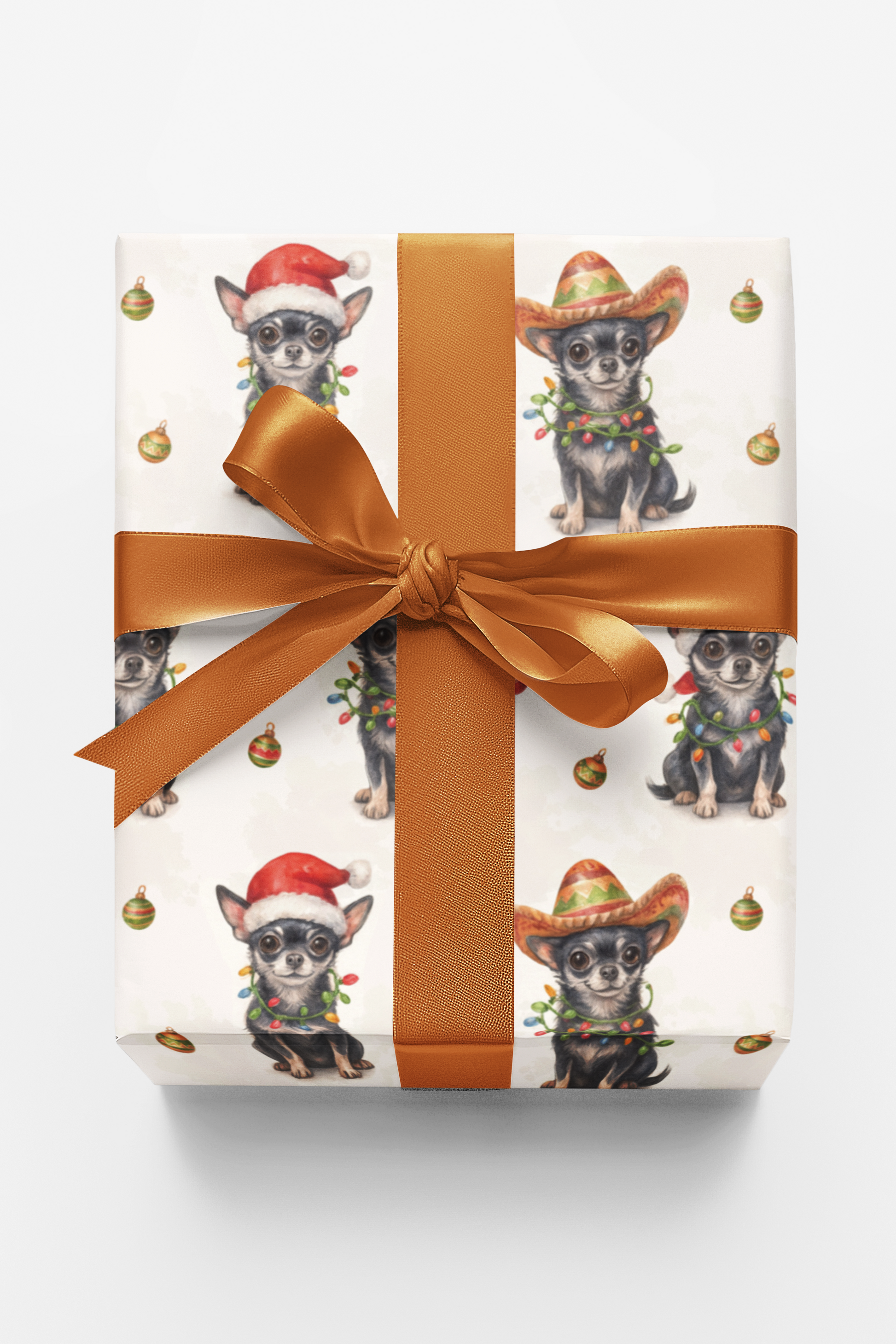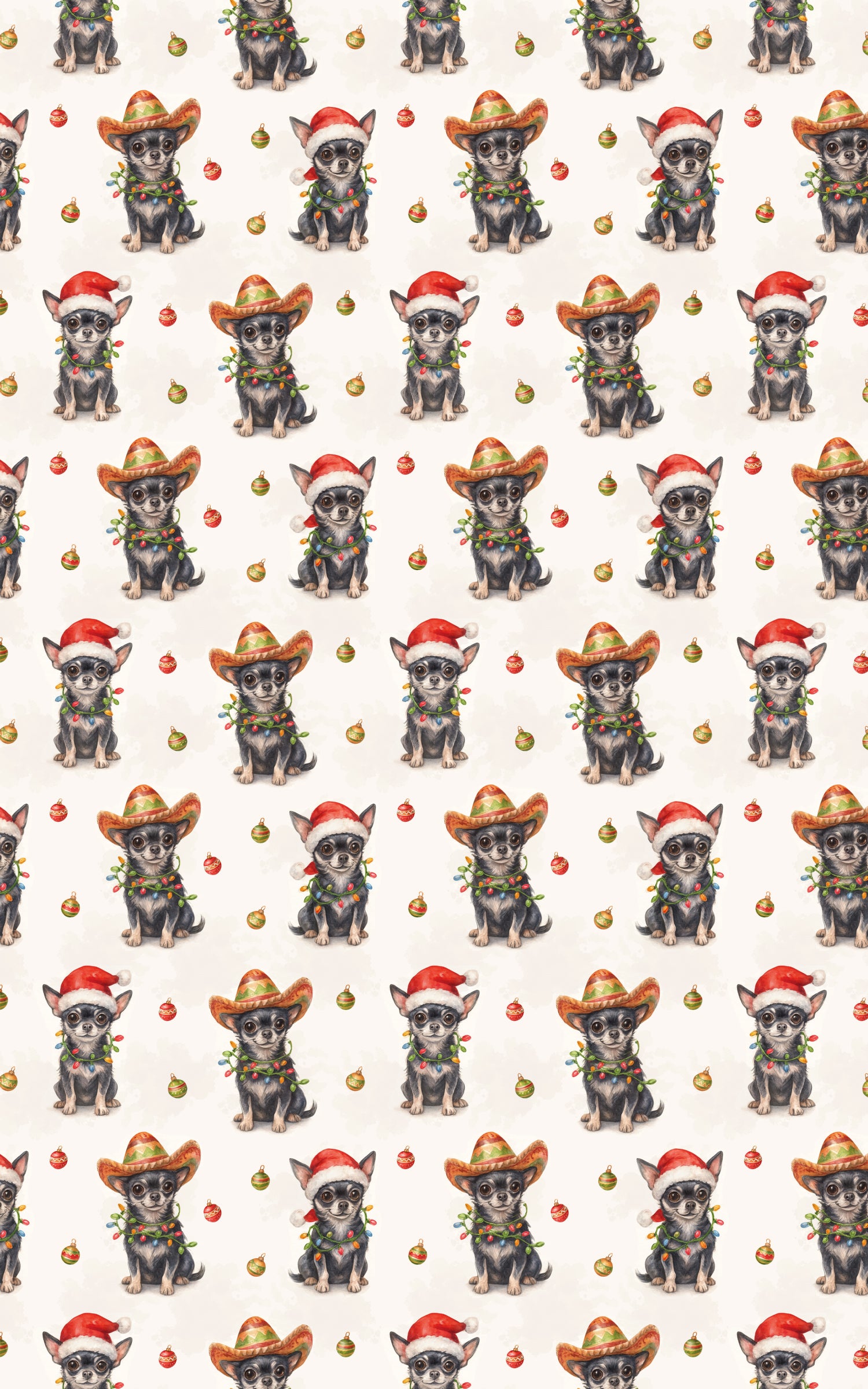 Bring a festive flair to your celebrations with this charming wrapping paper featuring cheerful Chihuahuas dressed in Santa hats and sombreros, twinkling with colorful Christmas lights. Illustrated in watercolor and set against a soft neutral background, this seamless pattern blends holiday warmth with a playful fiesta spirit. Perfectly spaced for a polished look, it’s ideal for holiday gifts, seasonal décor, or adding a joyful touch to any celebration.