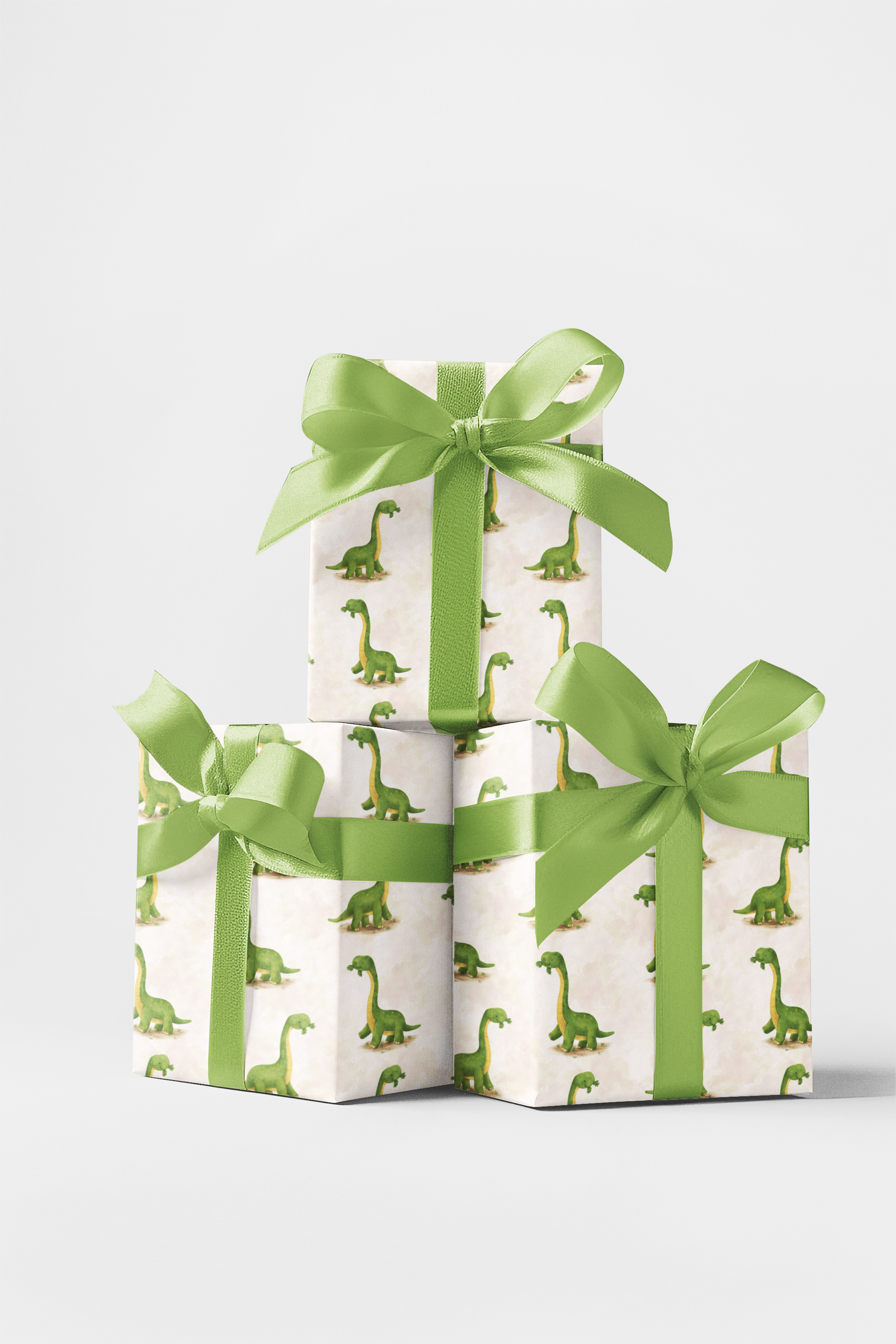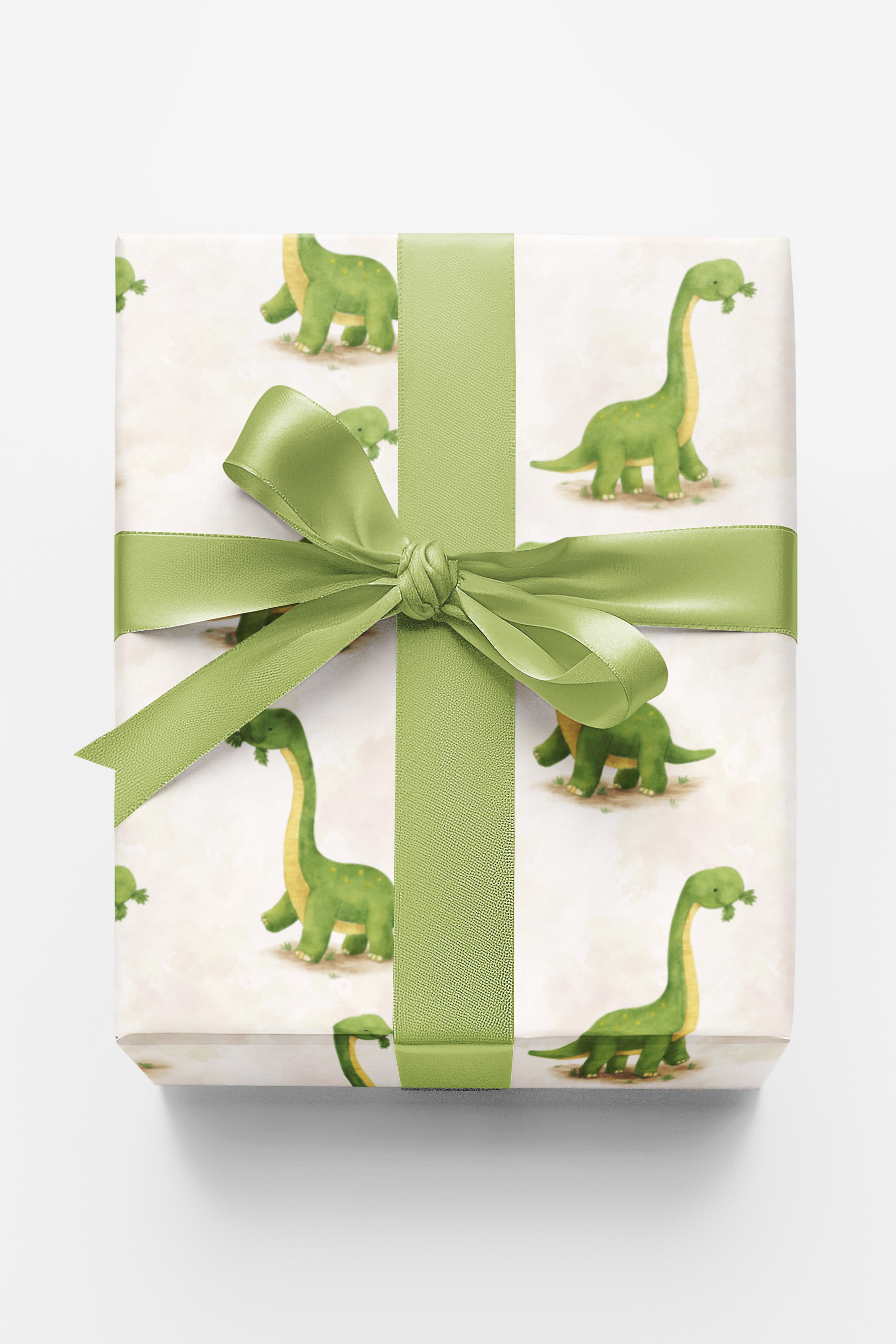 Adorable and serene, the Brontosaurus brings peaceful prehistoric charm to this captivating wrapping paper design. Shown enjoying a mouthful of fresh greenery, its gentle spirit and timeless presence shine through, adding both warmth and wonder to every gift. Perfect for dinosaur lovers and any occasion, this design celebrates the beauty and individuality of this remarkable creature.