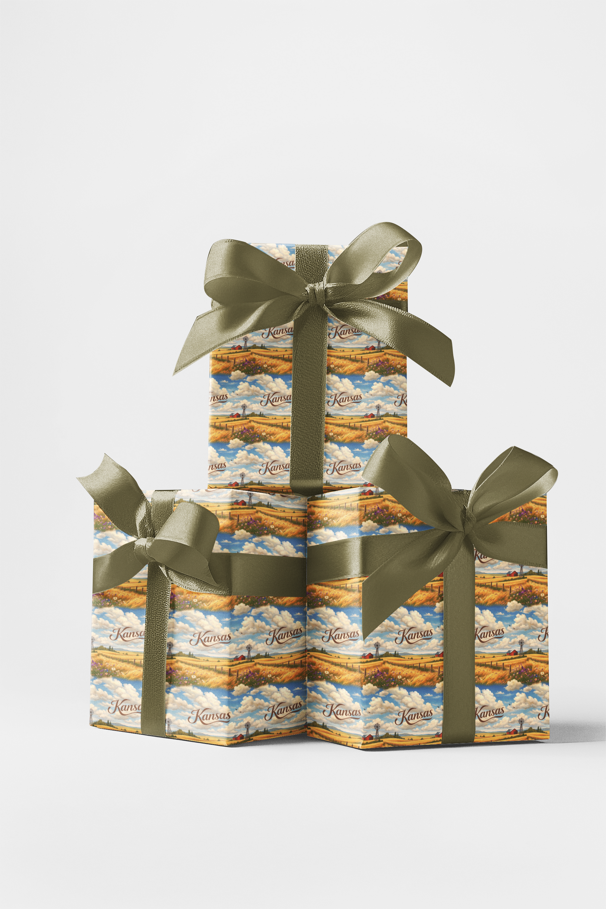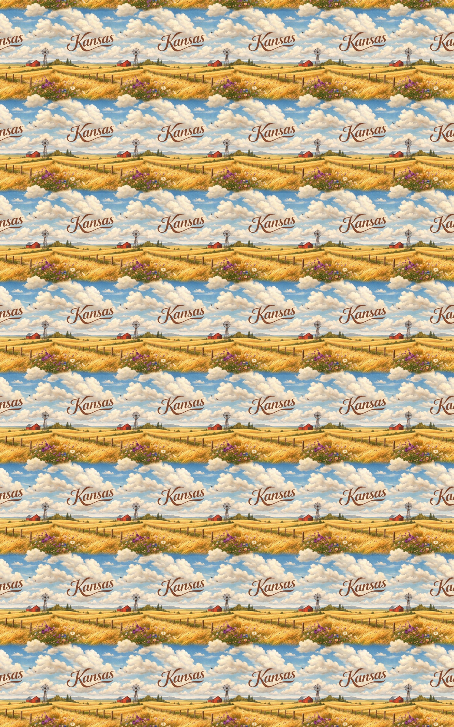 Open and expansive, Kansas Endless Plains stretches beneath wide skies filled with drifting clouds and golden light. Rolling fields of wheat ripple toward the horizon, punctuated by quiet barns and steadfast windmills that echo resilience and simplicity. The scene feels calm yet powerful—rooted in space, sky, and steady rhythm. This design celebrates Kansas’s boundless landscape, where the plains unfold without end and every fold carries the peaceful strength and enduring beauty of the American heartland.