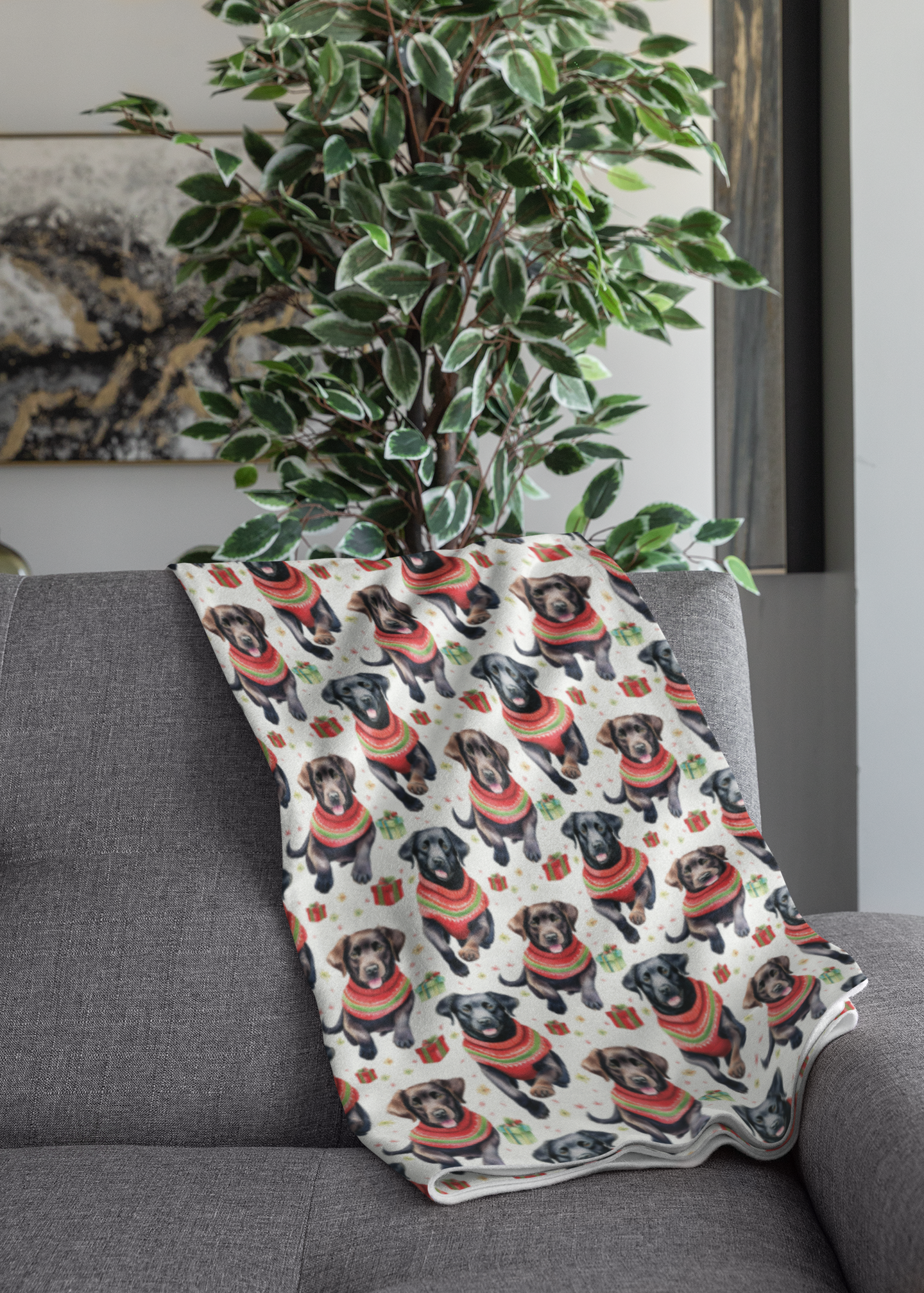 Celebrate the season with the loyal and loving spirit of our Labrador Holiday Sweaters Sherpa blanket. This festive design features a cheerful lineup of both black and chocolate Labradors, all dressed up in their favorite patterned Christmas sweaters and surrounded by tiny holiday gift boxes. Set against a clean, warm background, it perfectly captures the joyful energy of the breed during the holidays. Crafted with a silky-soft micro fleece face to showcase the vibrant details and a plush, cloud like Sherpa lining for ultimate comfort, this blanket is a must-have for every Lab lover. Whether it is for chilly nights by the fire or a thoughtful gift for a fellow retriever enthusiast, this blanket brings boutique charm and maximum warmth to your home.