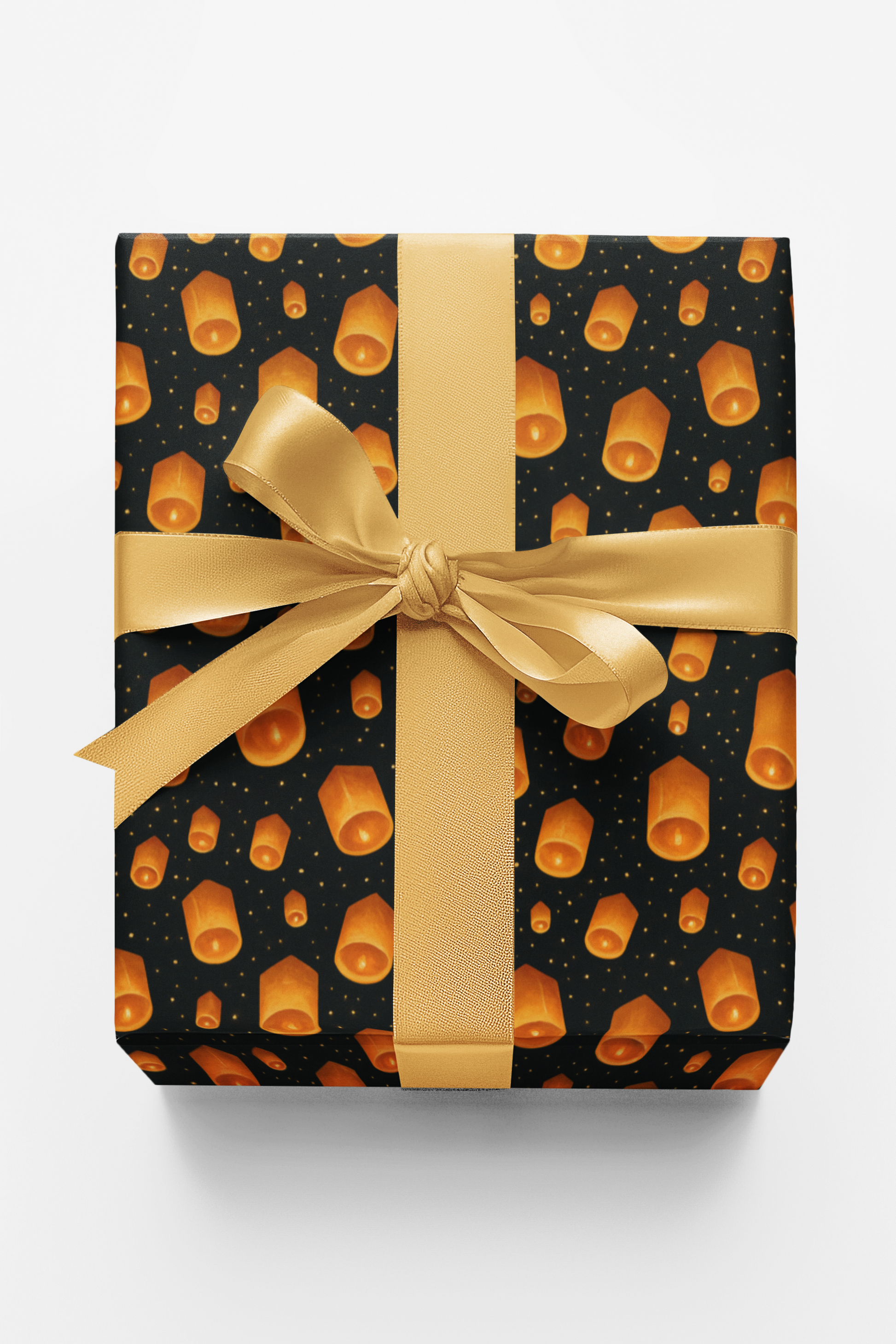 Add a touch of magic to your gifts with this stunning wrapping paper featuring softly glowing lanterns floating across a starry night sky. Radiating warmth and wonder, the golden hues create a mesmerizing contrast against the deep black backdrop, evoking feelings of hope, joy, and celebration. Perfect for birthdays, weddings, New Year’s, or any occasion where you want your gift to shine, this luminous design pairs beautifully with gold, black, or copper ribbons for a radiant, luxurious finish.
