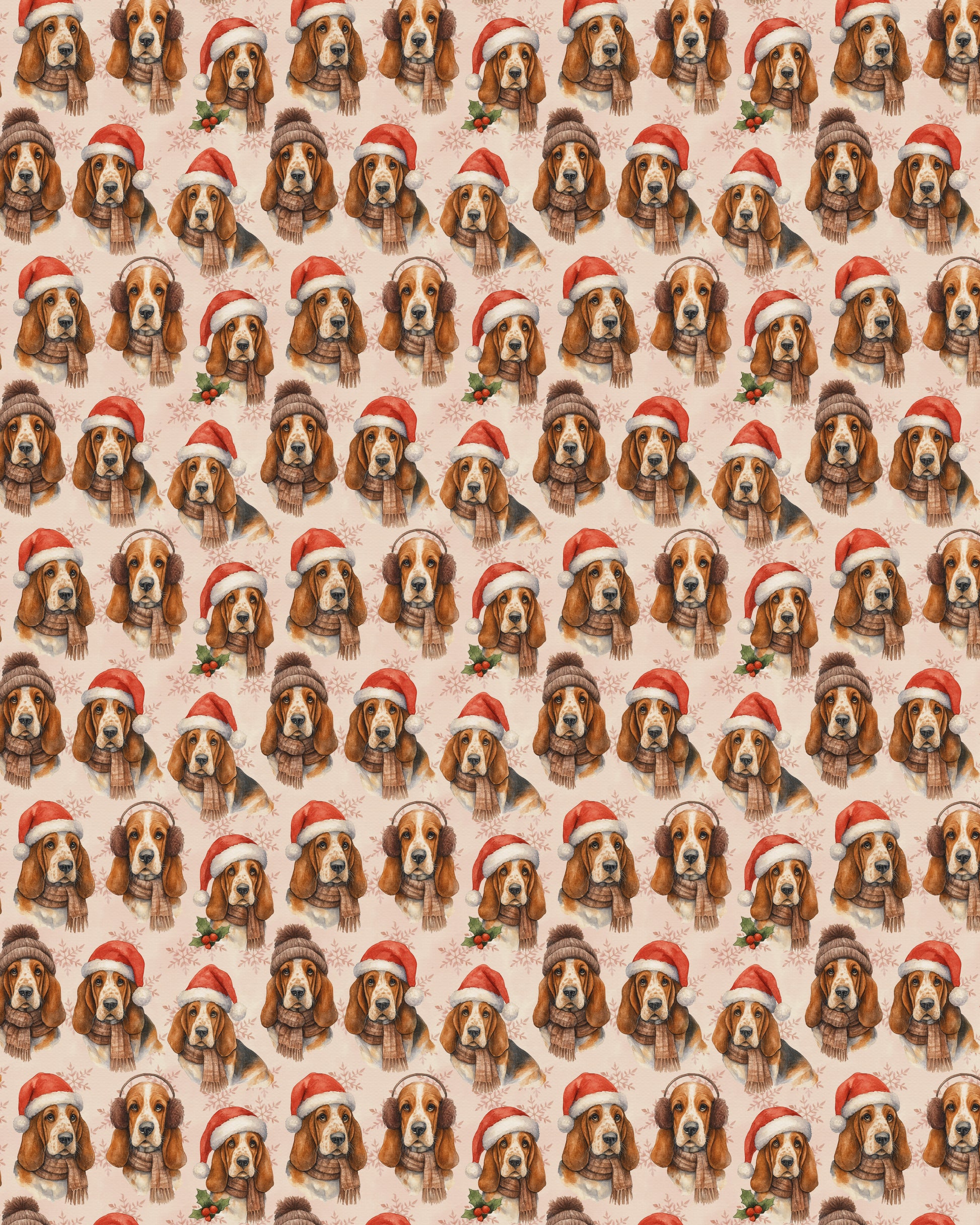 Rich brown, tan, and white tones highlight the basset hound’s signature droopy ears and gentle expression, while festive red and soft neutral hues bring a subtle holiday glow to the design. The result is a comforting, inviting aesthetic that feels both playful and refined—perfect for winter lounging, holiday décor, or gifting a fellow dog lover.