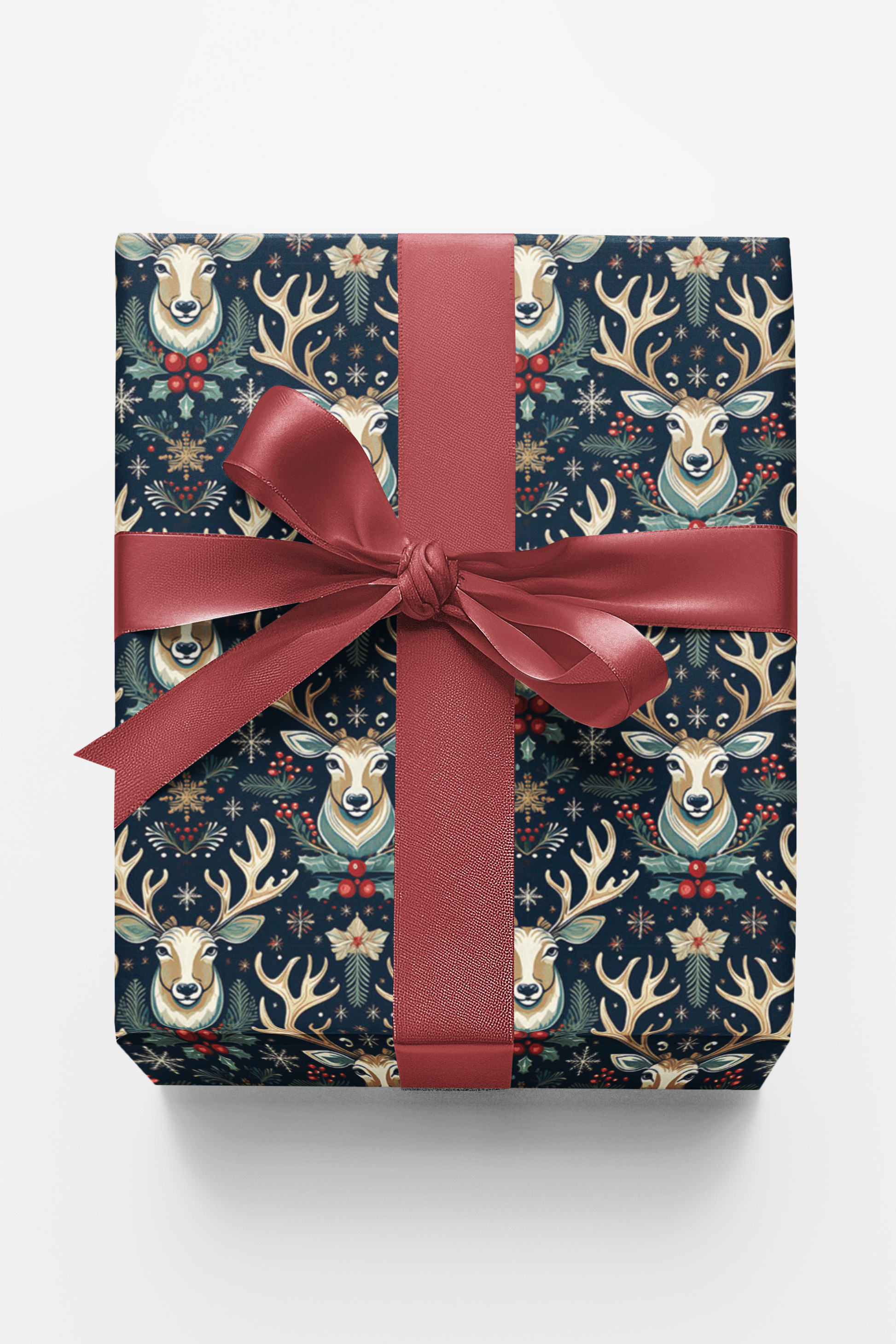 Bring the magic of a winter forest to your gifts with our Majestic Antlers wrapping paper! Featuring elegant stags and reindeer with golden antlers, holly, and sparkling snowflakes on a dark blue background, it’s perfect for Christmas, winter weddings, or any festive occasion.