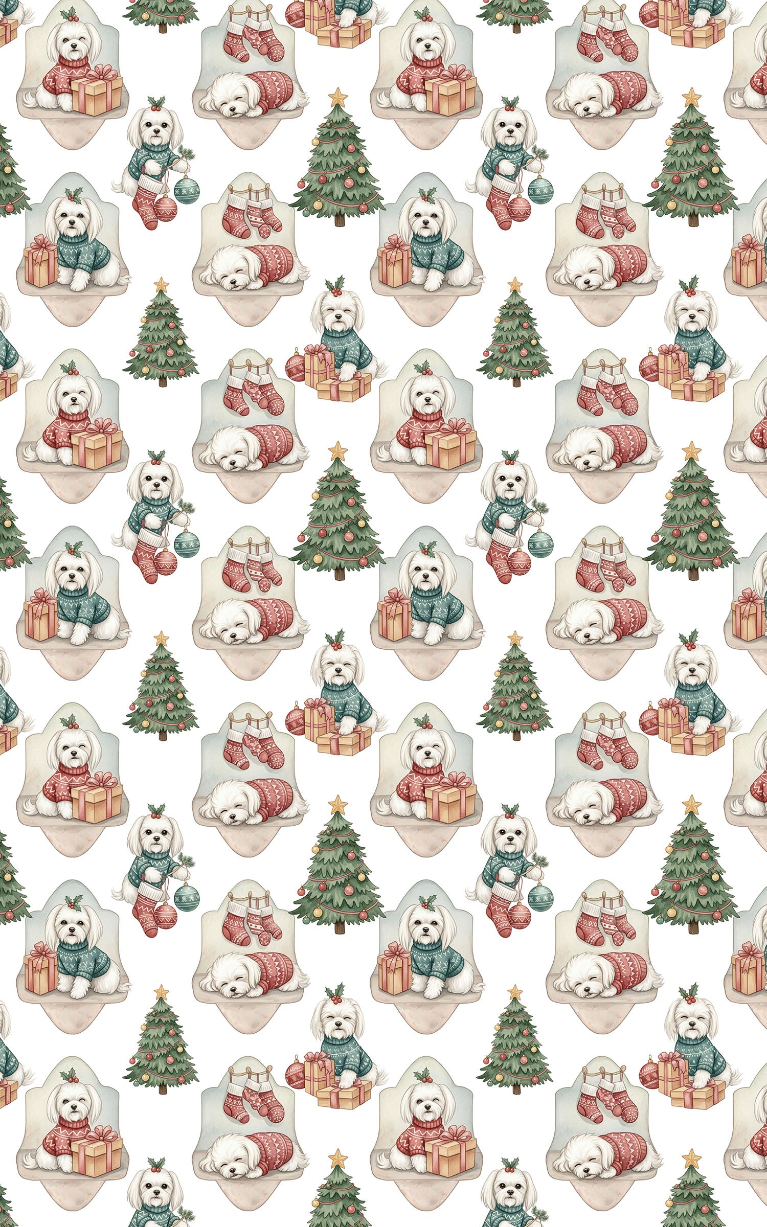 Celebrate the season with our Maltese Holiday Sweaters, featuring adorable Maltese dogs dressed in festive sweaters surrounded by cheerful holiday socks and twinkling Christmas trees. Hand-painted in soft watercolor tones, this charming pattern captures the warmth and joy of the holidays. Perfect for gift wrapping, crafts, or seasonal décor, it adds a touch of playful elegance to every present under the tree.
