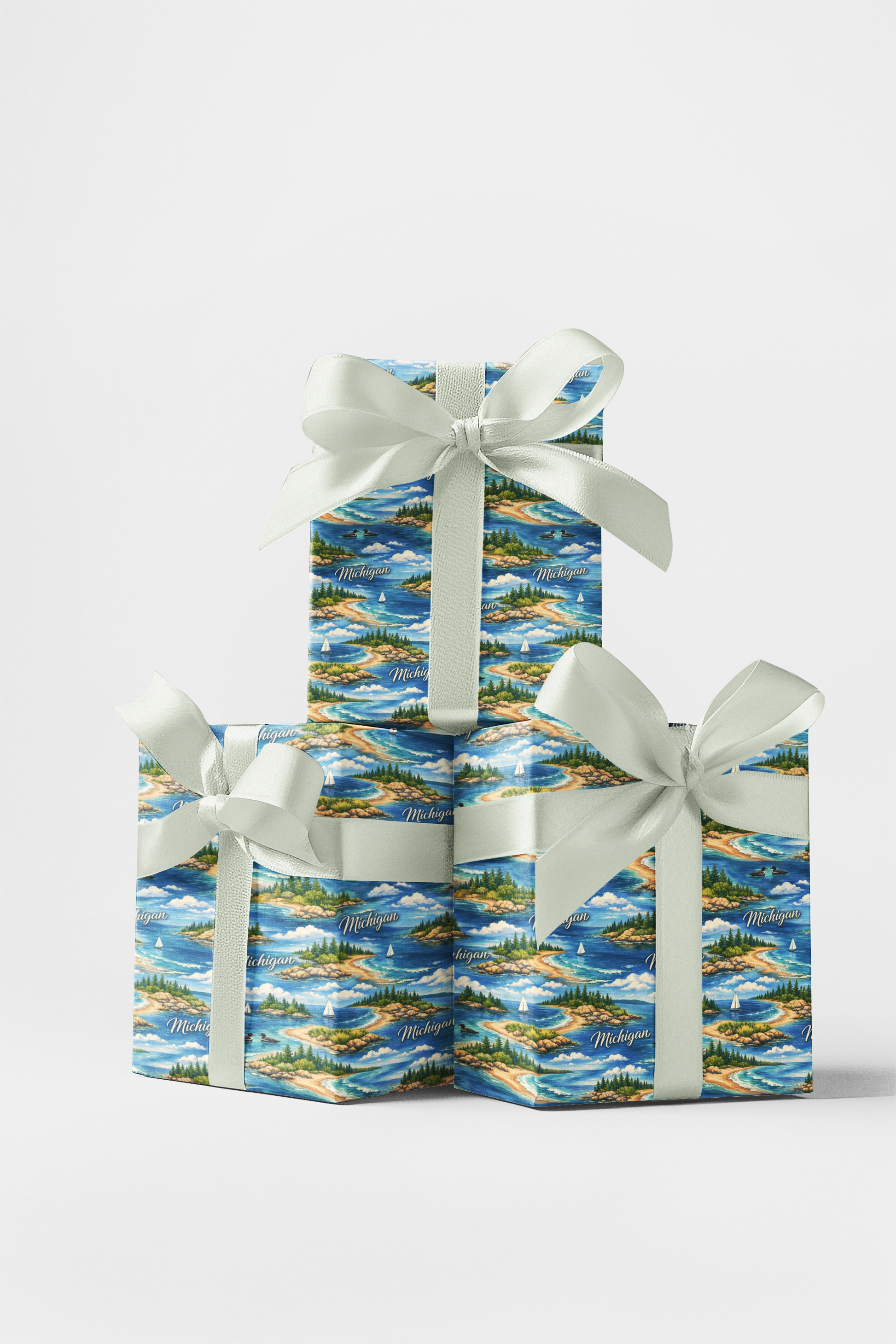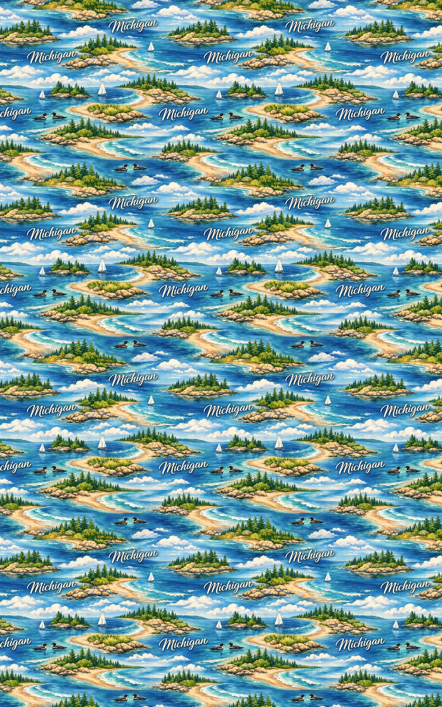 Drifting through gentle blues and soft horizons, Michigan Great Lakes Calm captures the quiet poetry of water meeting sky. Peaceful shorelines curve like whispered brushstrokes, dotted with pines and sailboats that glide without hurry. The scene breathes serenity—cool, expansive, and timeless—where every ripple carries stillness and every island feels like a pause in motion. This design is an ode to tranquil mornings and endless summers, inviting the soul to slow down and float within the calm heart of the Great Lakes.