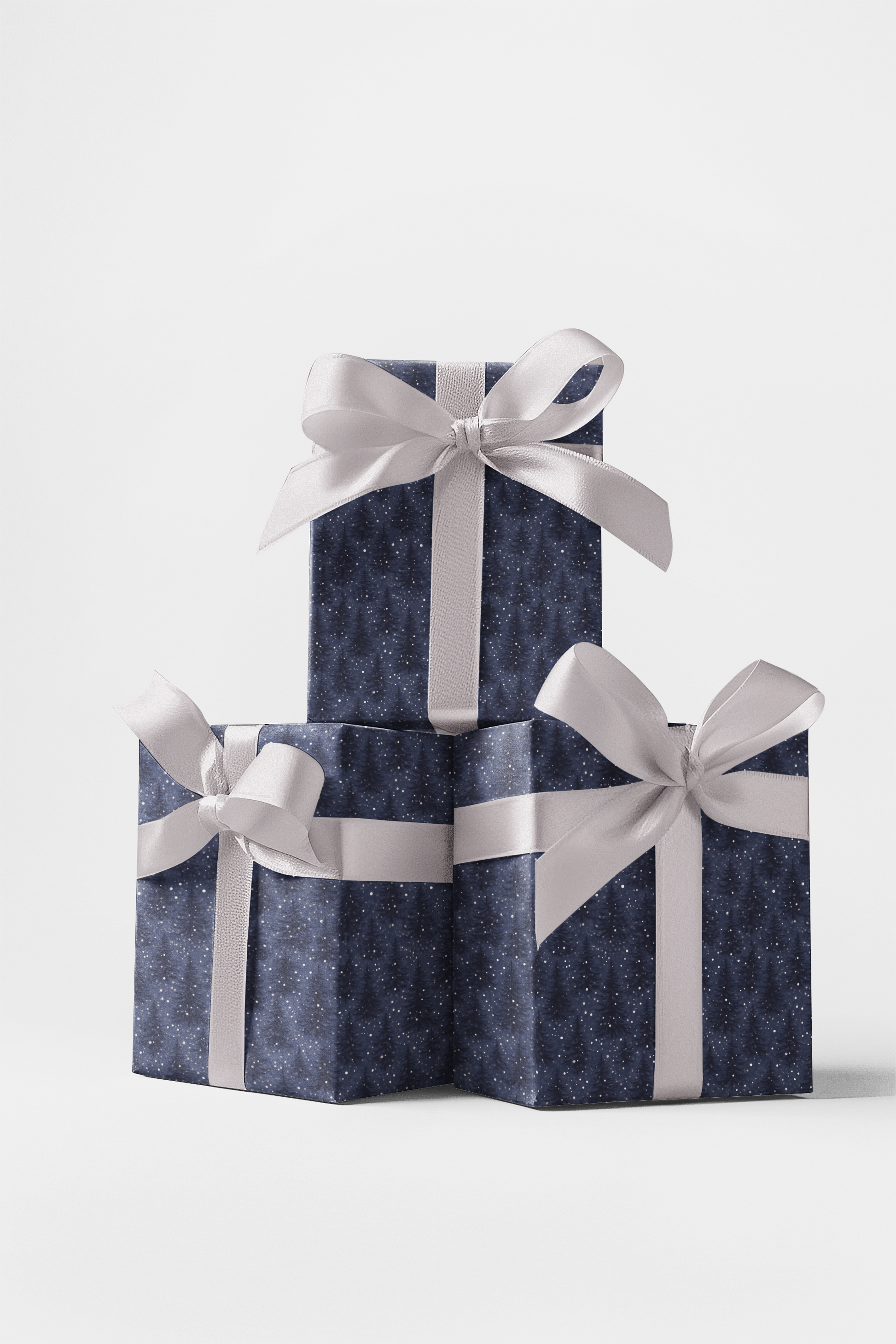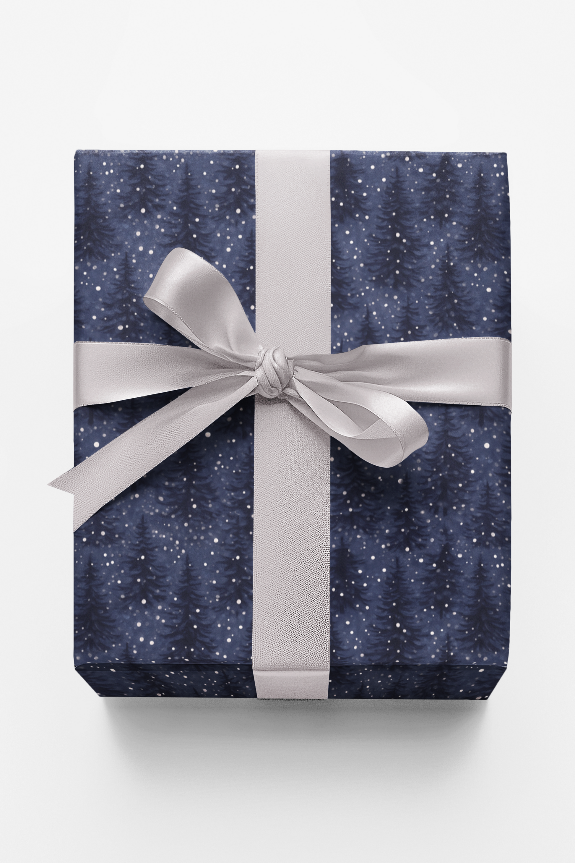 Steeped in the hush of a snowy night, this design captures the enchanting stillness of a forest drifting into winter’s dream. Deep indigo evergreens rise like silhouettes against a midnight sky, while soft white flakes fall in quiet, shimmering rhythms. Midnight Evergreen celebrates mystery, serenity, and the magic of winter’s calm—where every fold feels like a walk through starlit woods, every glance glows with quiet wonder, and every gift is wrapped in the tranquil beauty of nightfall in nature.
