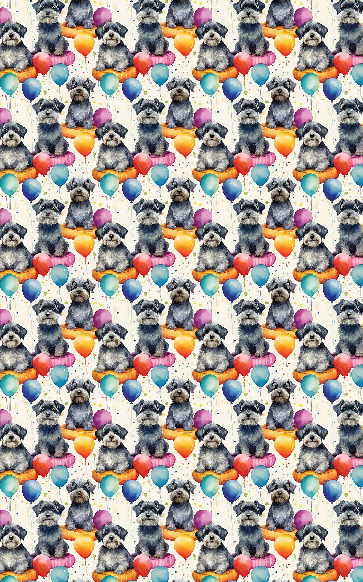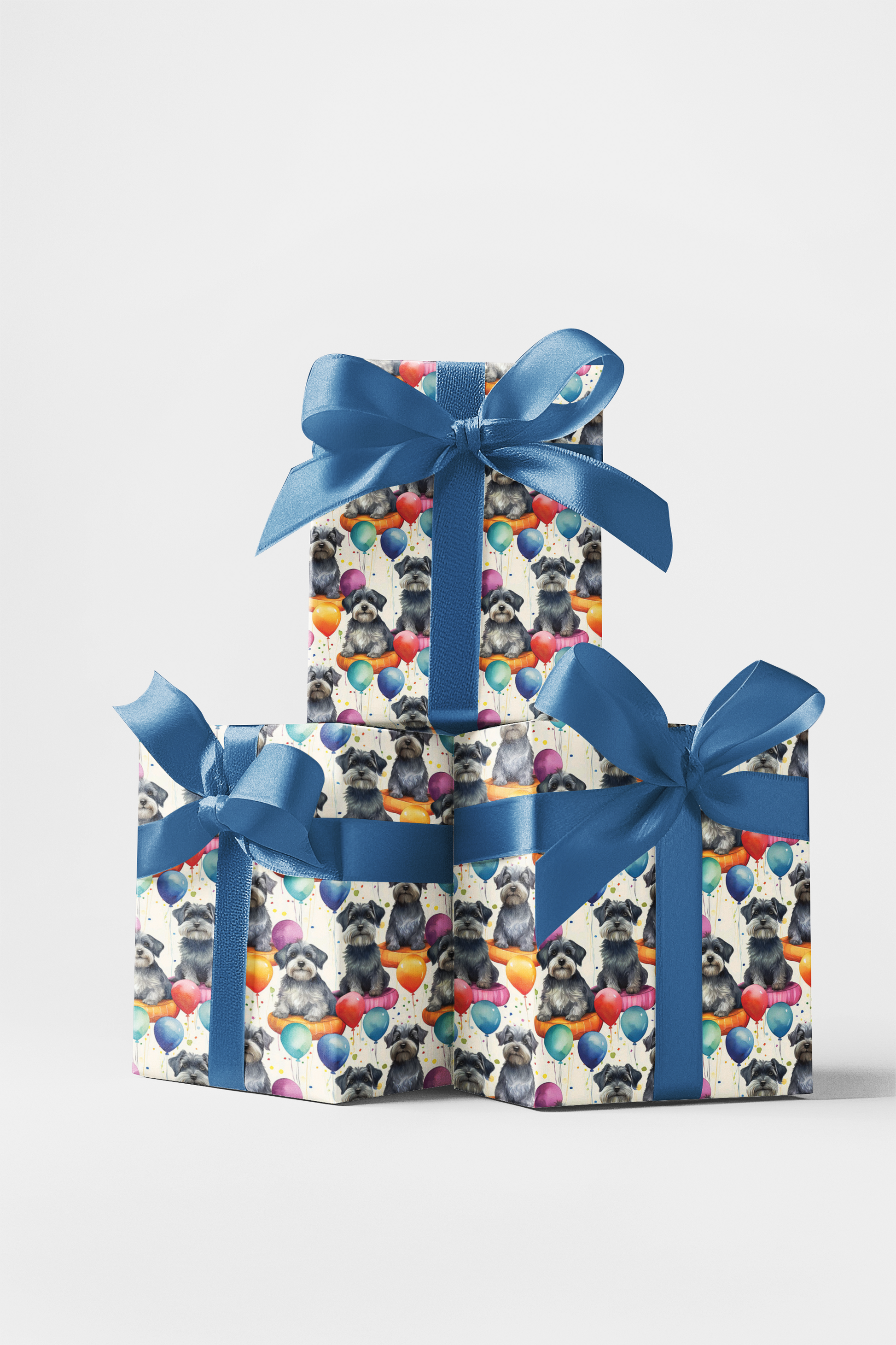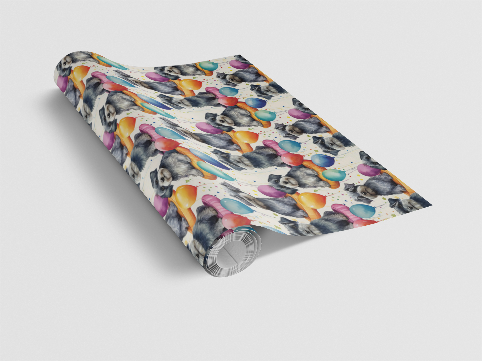 Celebrate in style with our adorable design featuring a cheerful Mini Schnauzer sitting on a soft cushion, surrounded by colorful birthday balloons and playful confetti. Perfect for wrapping special gifts, this festive pattern adds joy, charm, and a touch of whimsy to any birthday celebration.