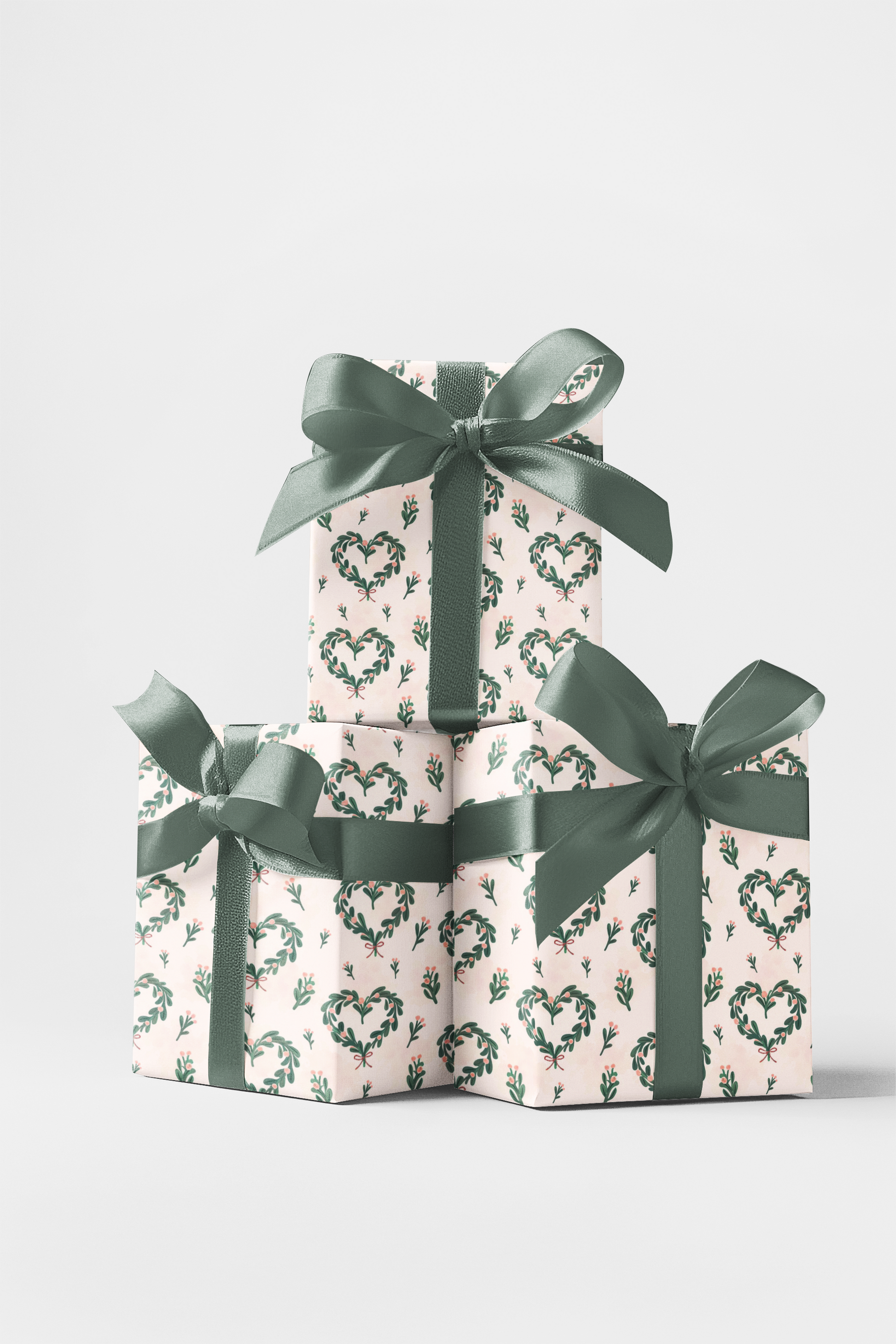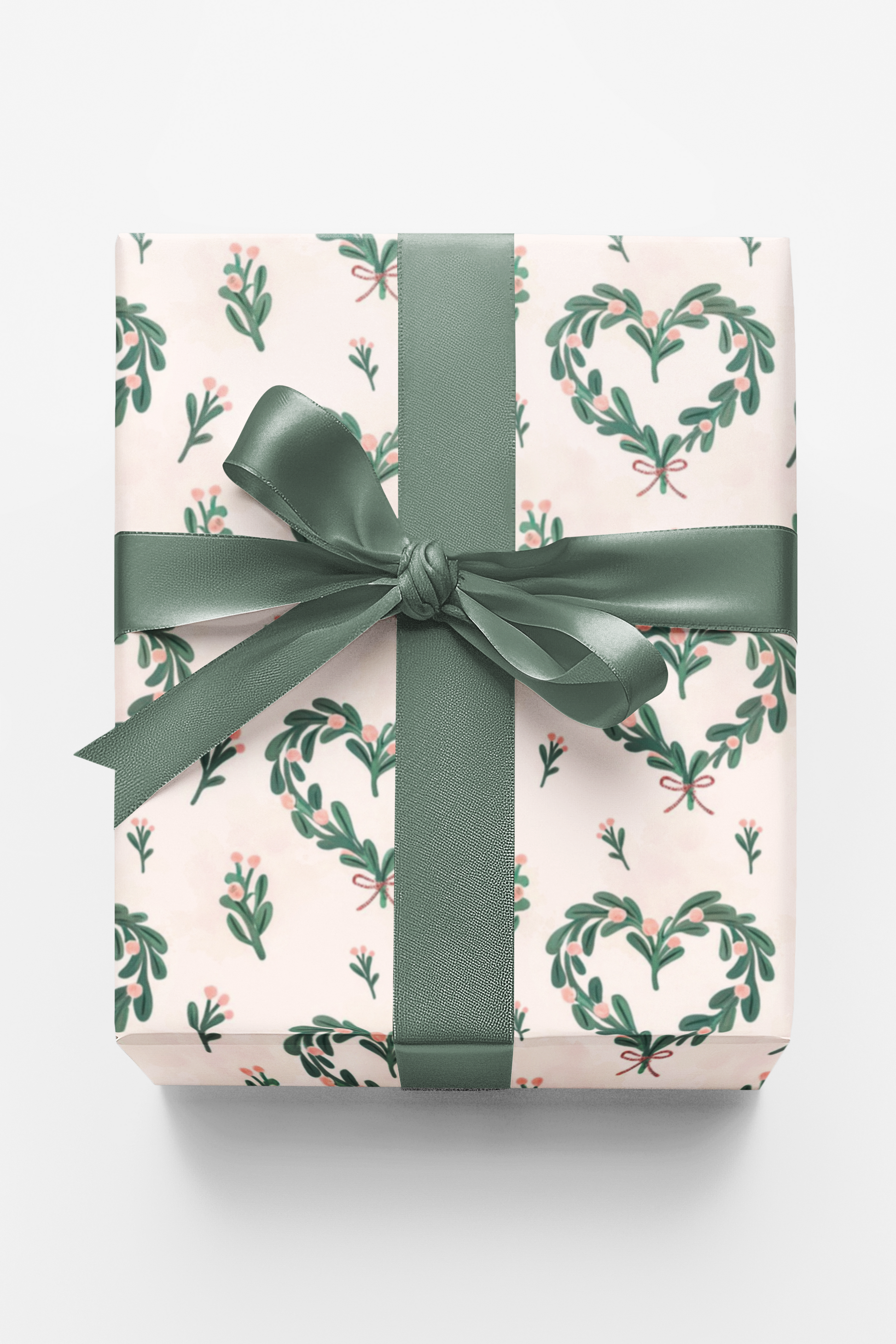 Soft blush tones and tender greenery intertwine to form heart-shaped wreaths that feel equal parts romantic and festive. Each sprig of mistletoe is brushed with delicate pink berries, tied together with a gentle ribbon that whispers sweetness and charm. This design celebrates warmth, affection, and the quiet magic of holiday love—where every fold blooms with gentle elegance, and every glance invites a moment of tenderness wrapped in timeless seasonal grace.