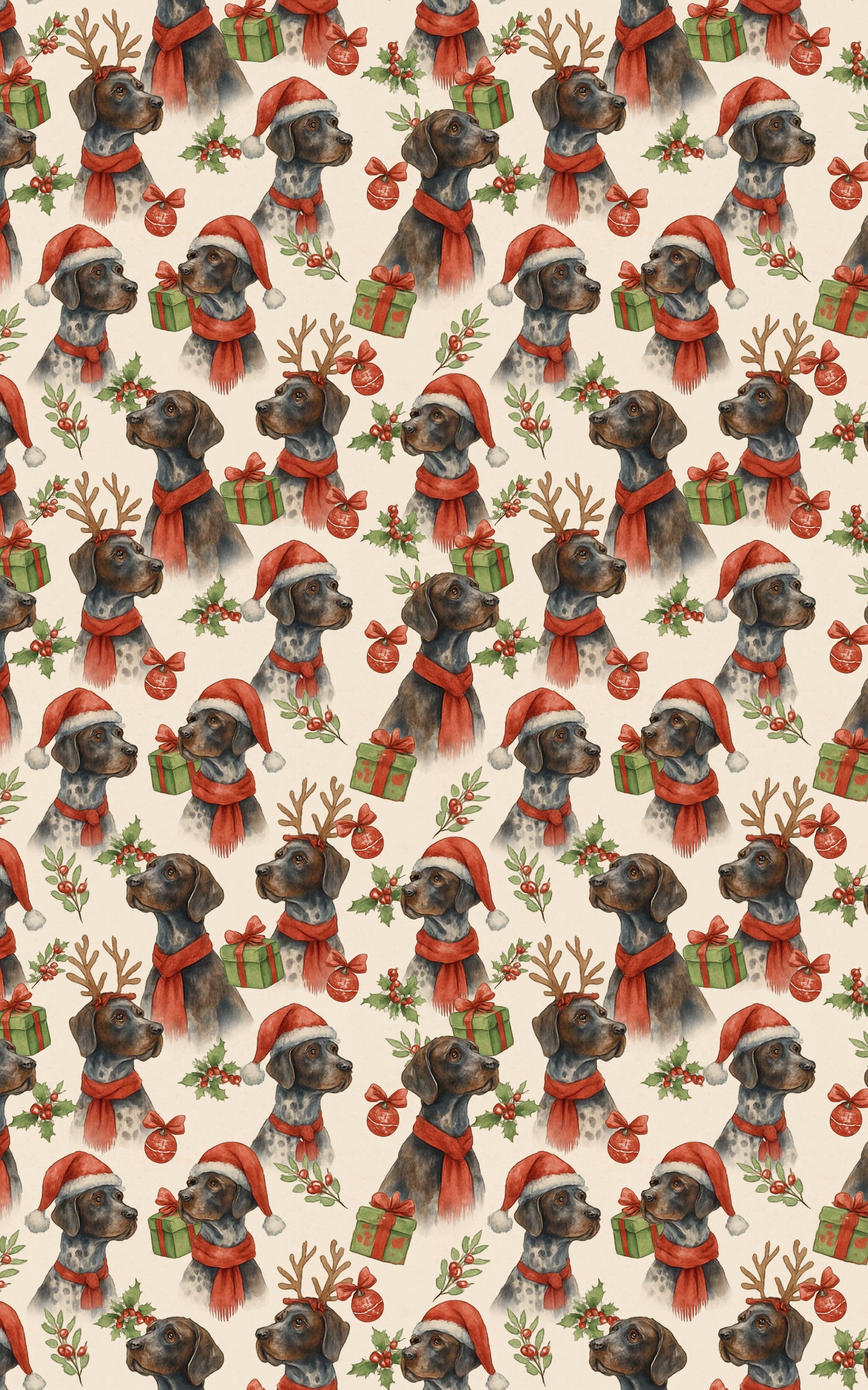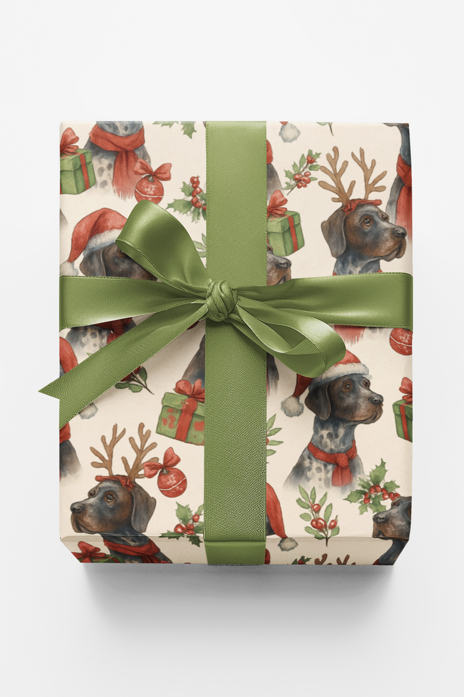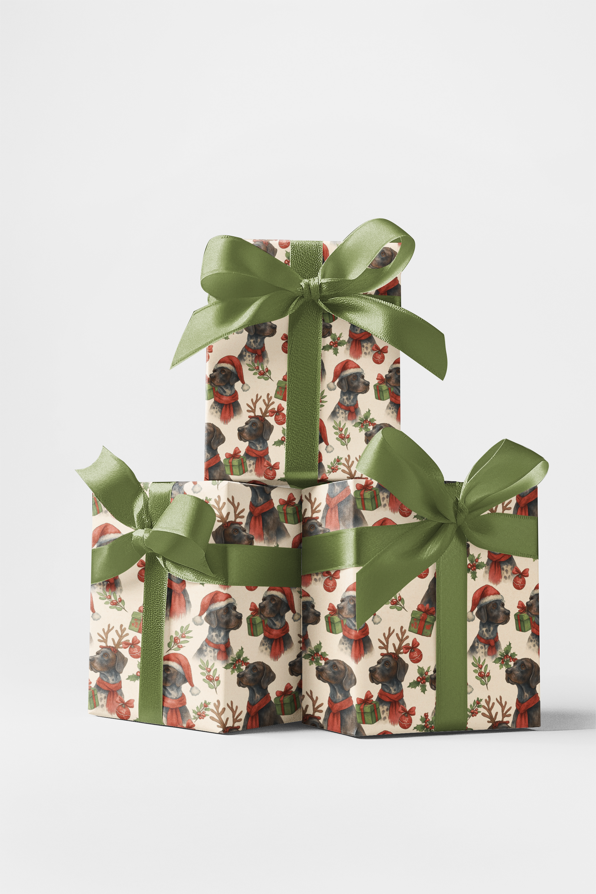 Celebrate the joy of Christmas with our Mistletoe & Pointer Toes wrapping paper! Featuring playful GSPs in Santa hats, red scarves, and reindeer antlers, surrounded by festive gifts and holly, this design captures the heart of the holidays. Perfect for dog lovers and GSP fans alike, it adds warmth and fun to every gift. Pair with our matching gift tags for a truly paw-some presentation!