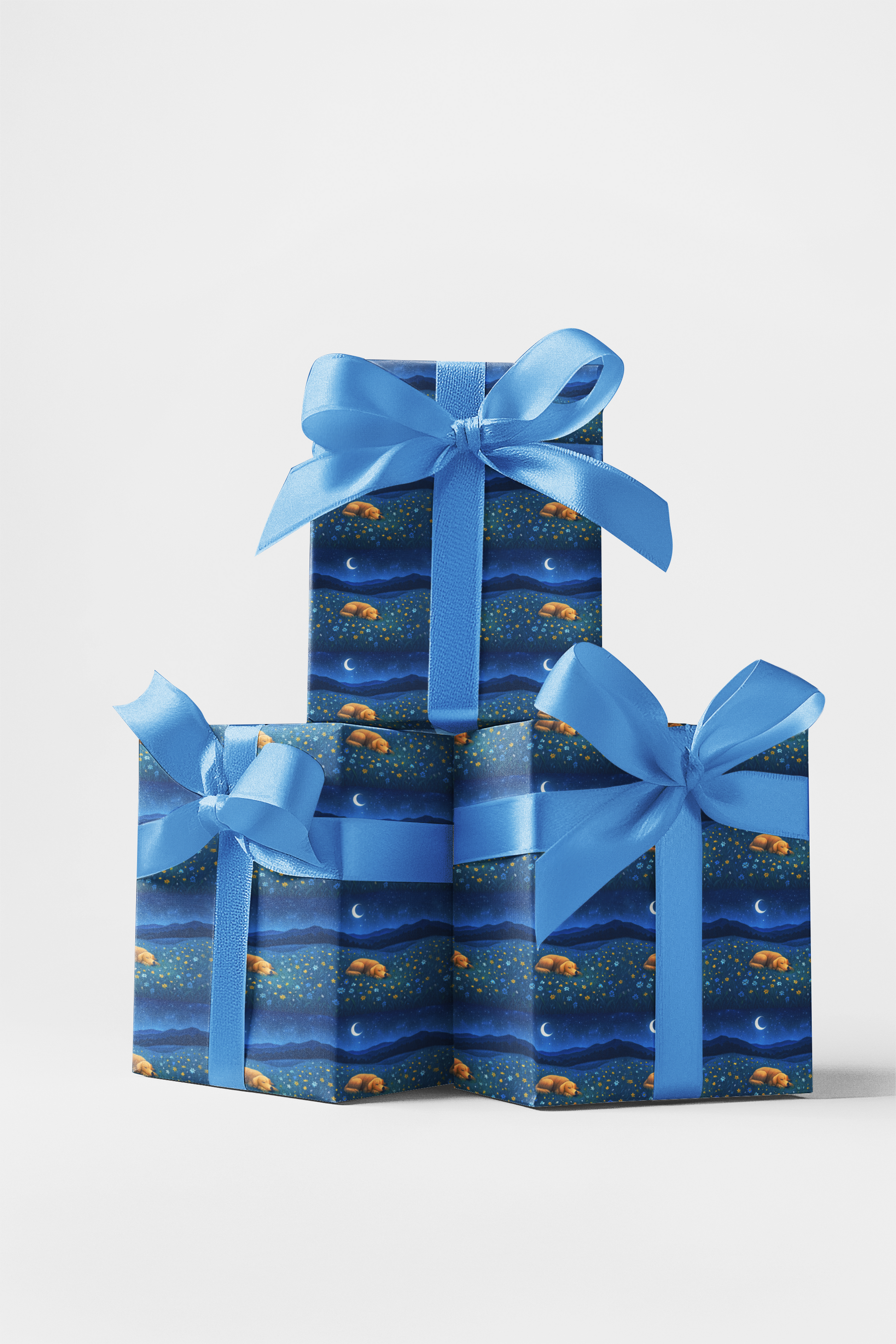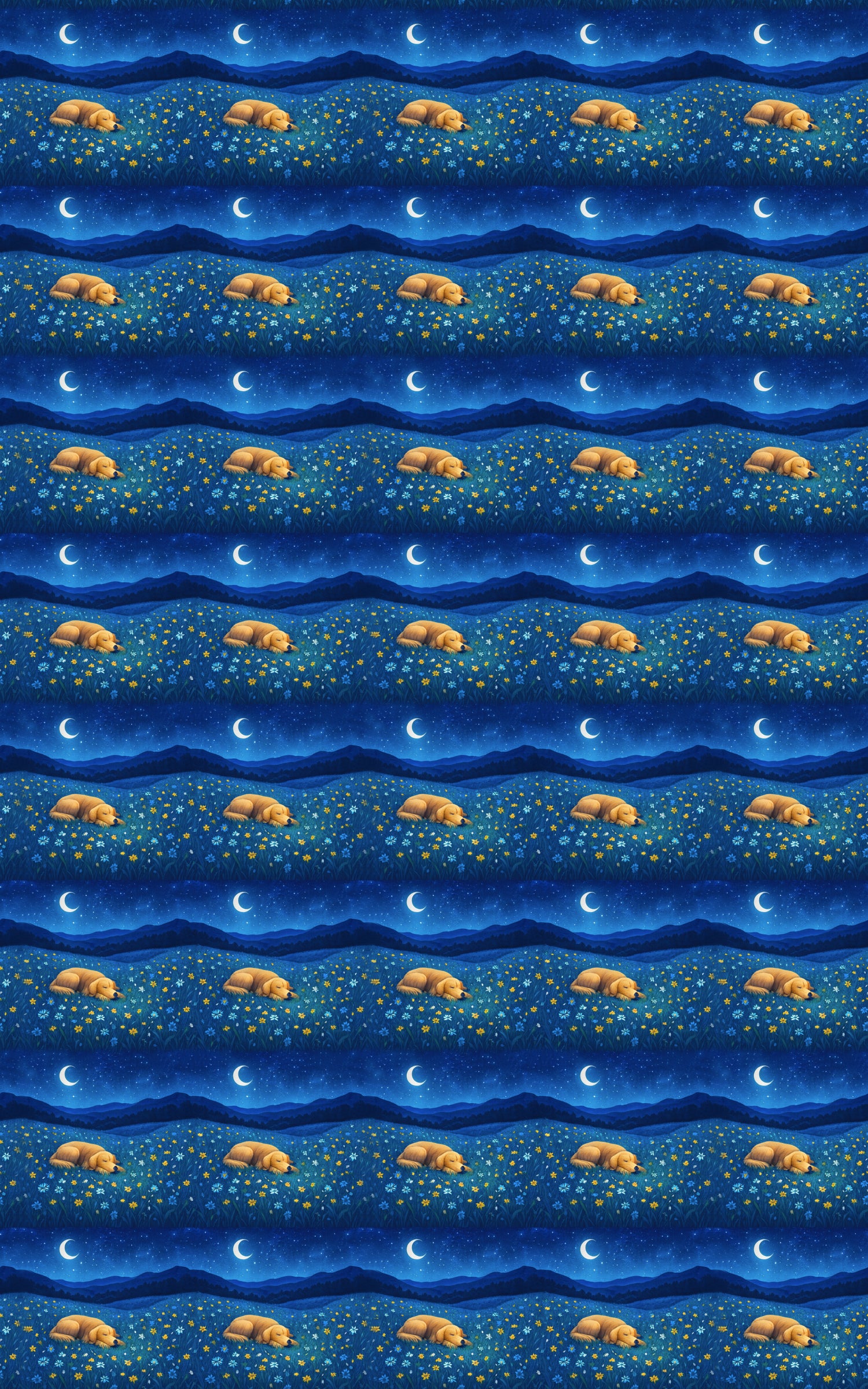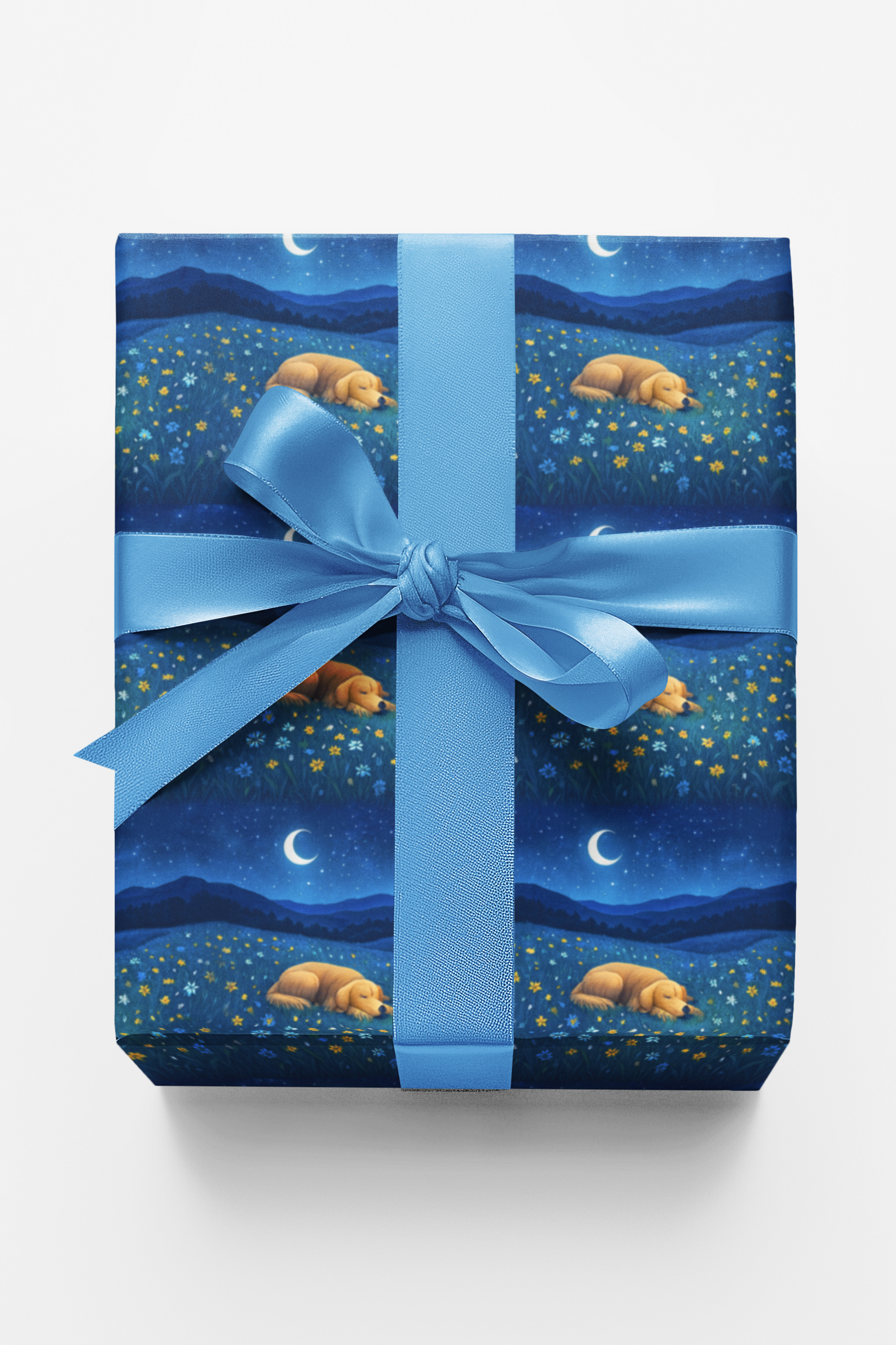 Beneath a blanket of stars, a golden retriever dreams in a meadow awash with midnight blues and soft moonlight. The night hums with quiet magic—each petal and blade of grass touched by silver glow. Moonlit Meadow captures serenity and wonder in perfect harmony, where every fold whispers of peaceful nights, loyal hearts, and the timeless beauty of dreams under an endless sky.