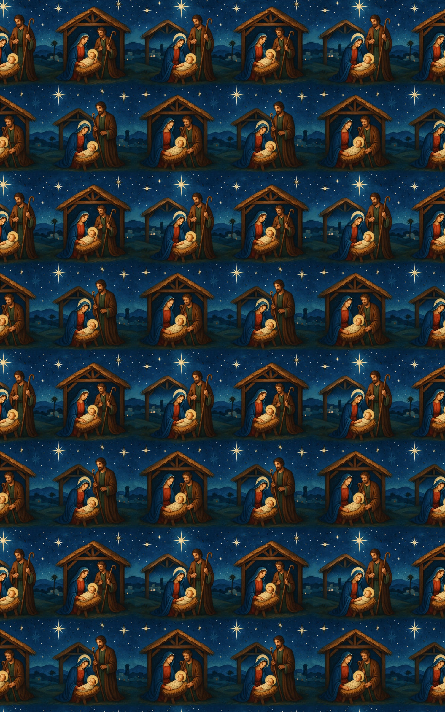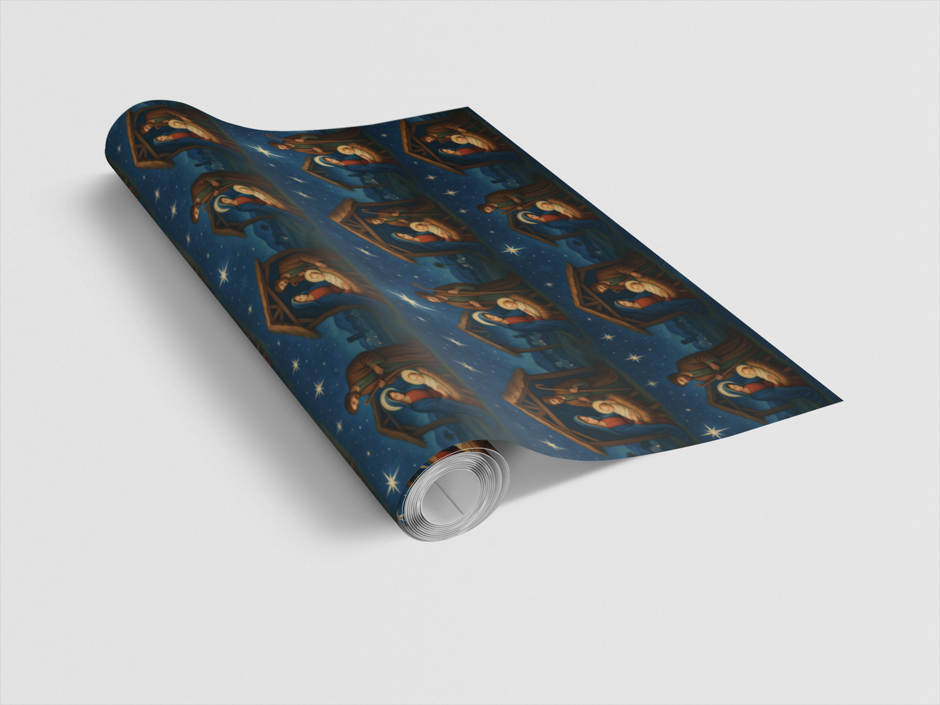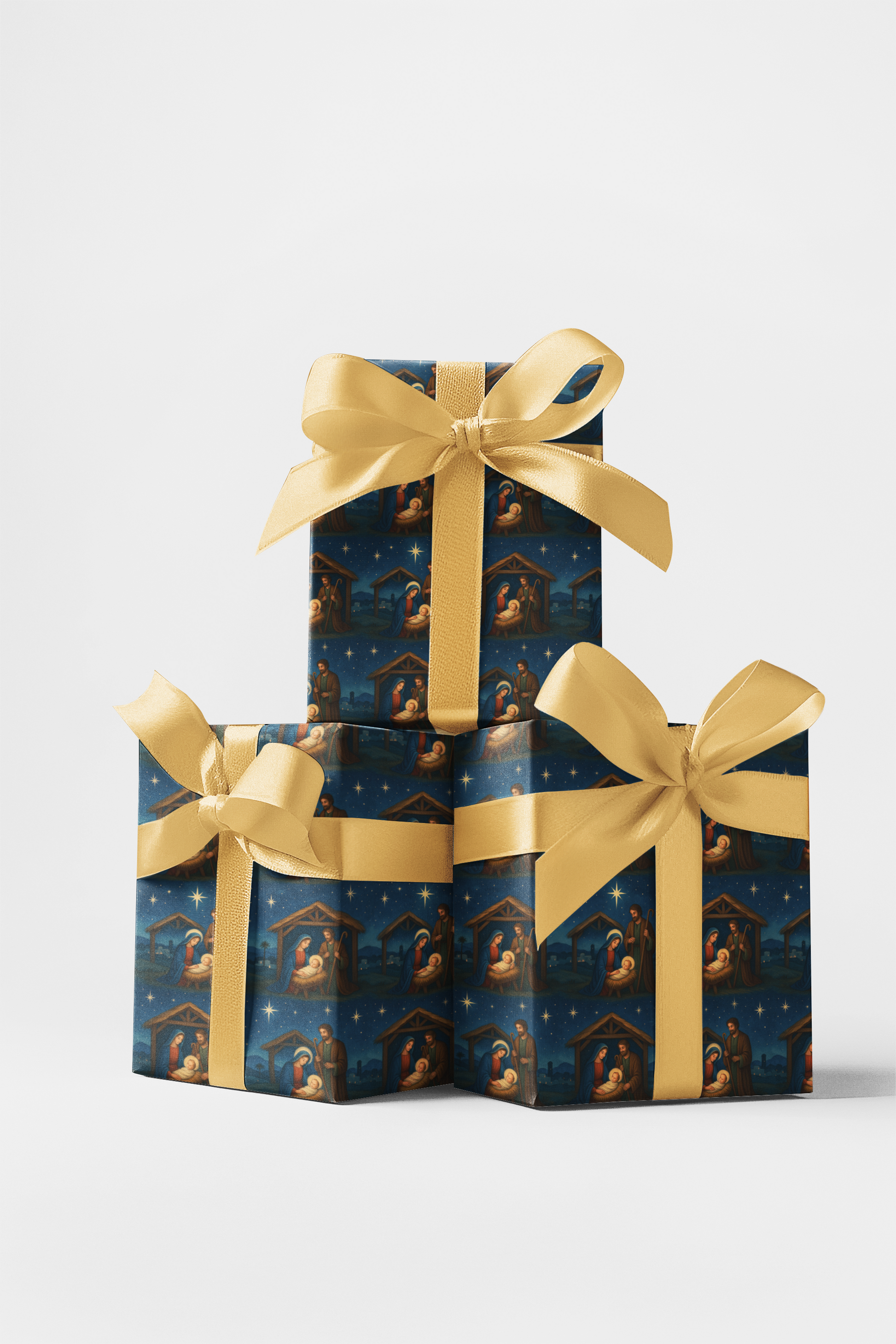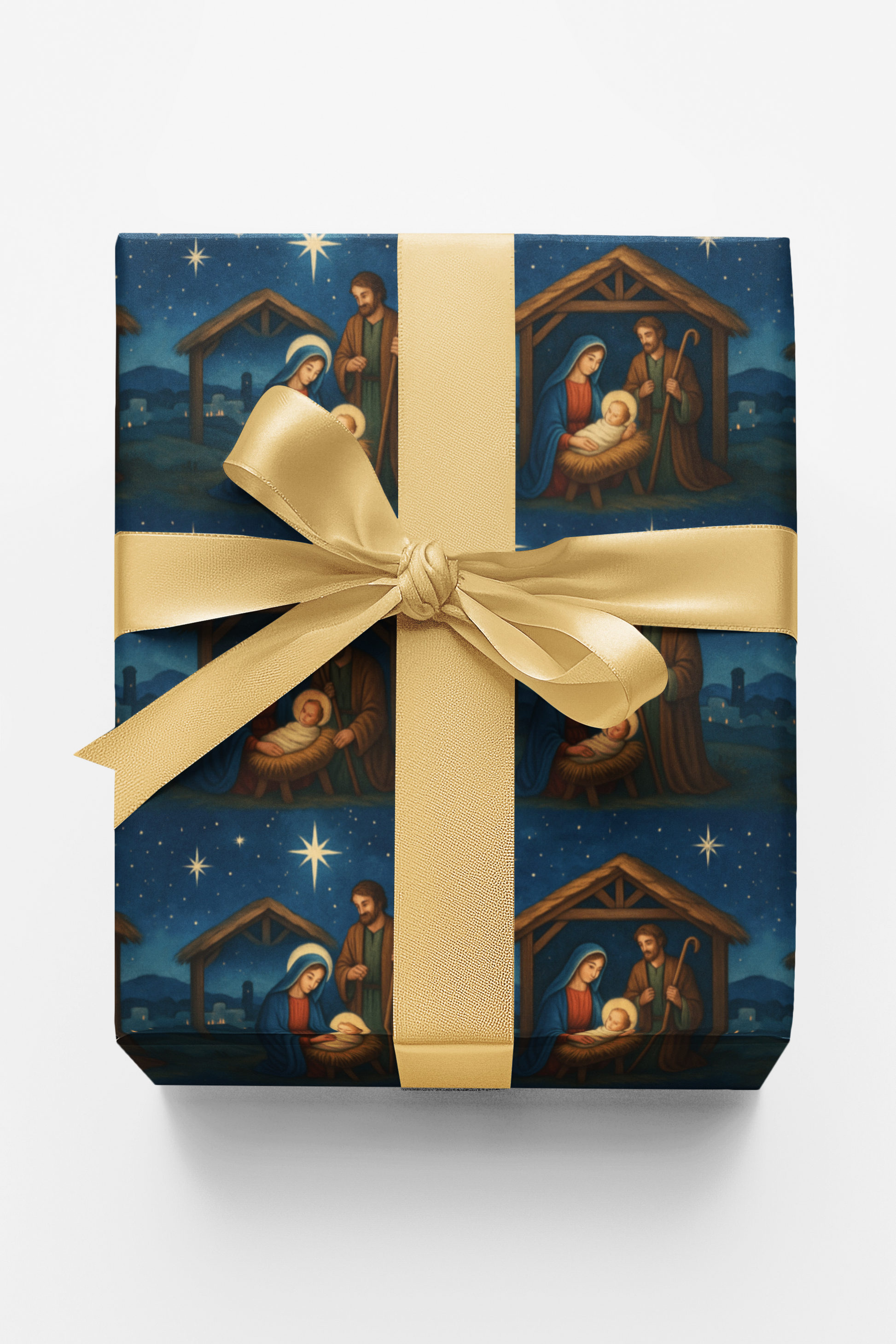 Experience the peaceful wonder of the season with our Nativity Night design. This serene pattern beautifully portrays Mary, Joseph, and baby Jesus beneath a tranquil, starlit Bethlehem sky. Soft watercolor tones and gentle lighting evoke warmth, reverence, and timeless beauty — perfect for Christmas wrapping, cards, and décor that celebrate the true spirit of the holiday.