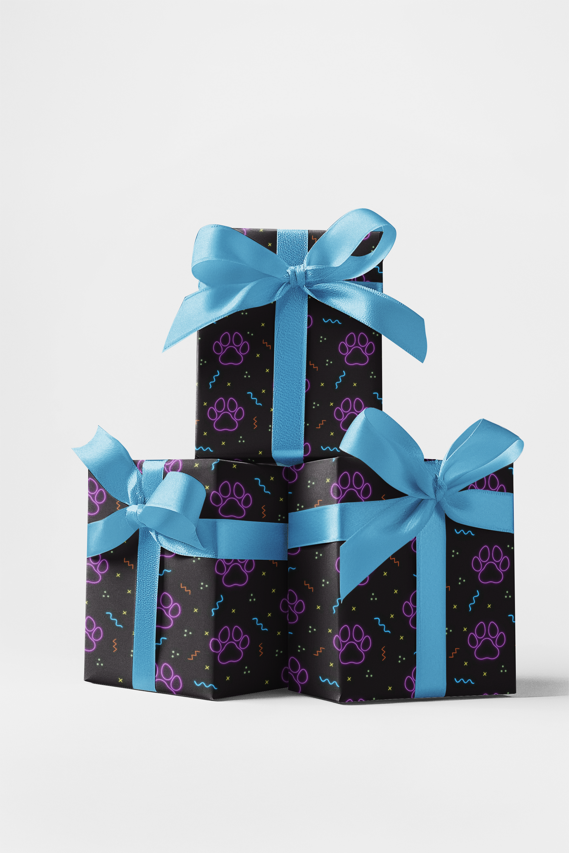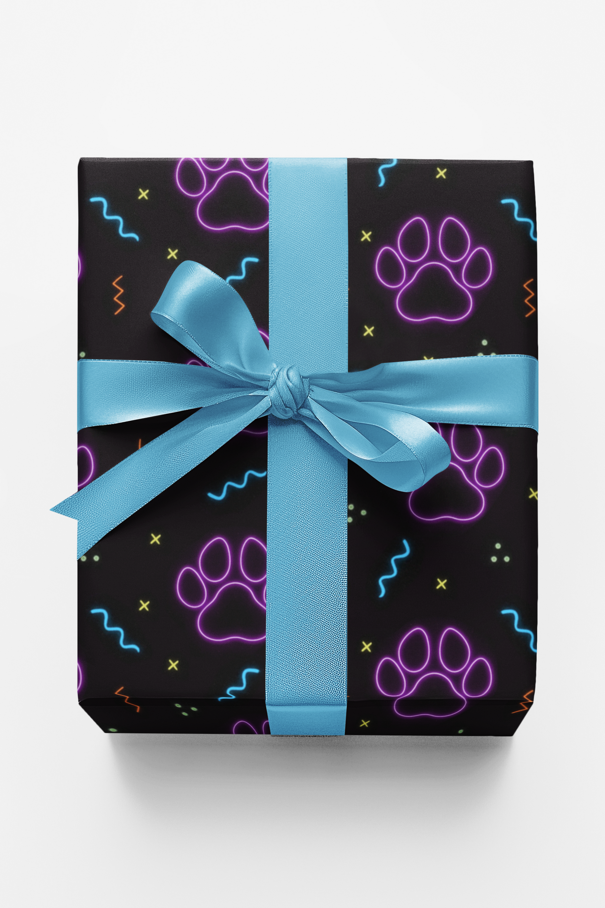 Glowing with electric energy, Neon Paws brings the night to life with bold color and playful rhythm. Each paw print pulses in radiant violet, surrounded by streaks of neon blue, yellow, and orange that dance across a deep black backdrop. This design celebrates modern fun and fearless style—a tribute to every vibrant personality that shines even brighter after dark. Every fold of this wrap feels like a spark of joy, lighting up gifts with a dash of attitude and pure, glowing charm.