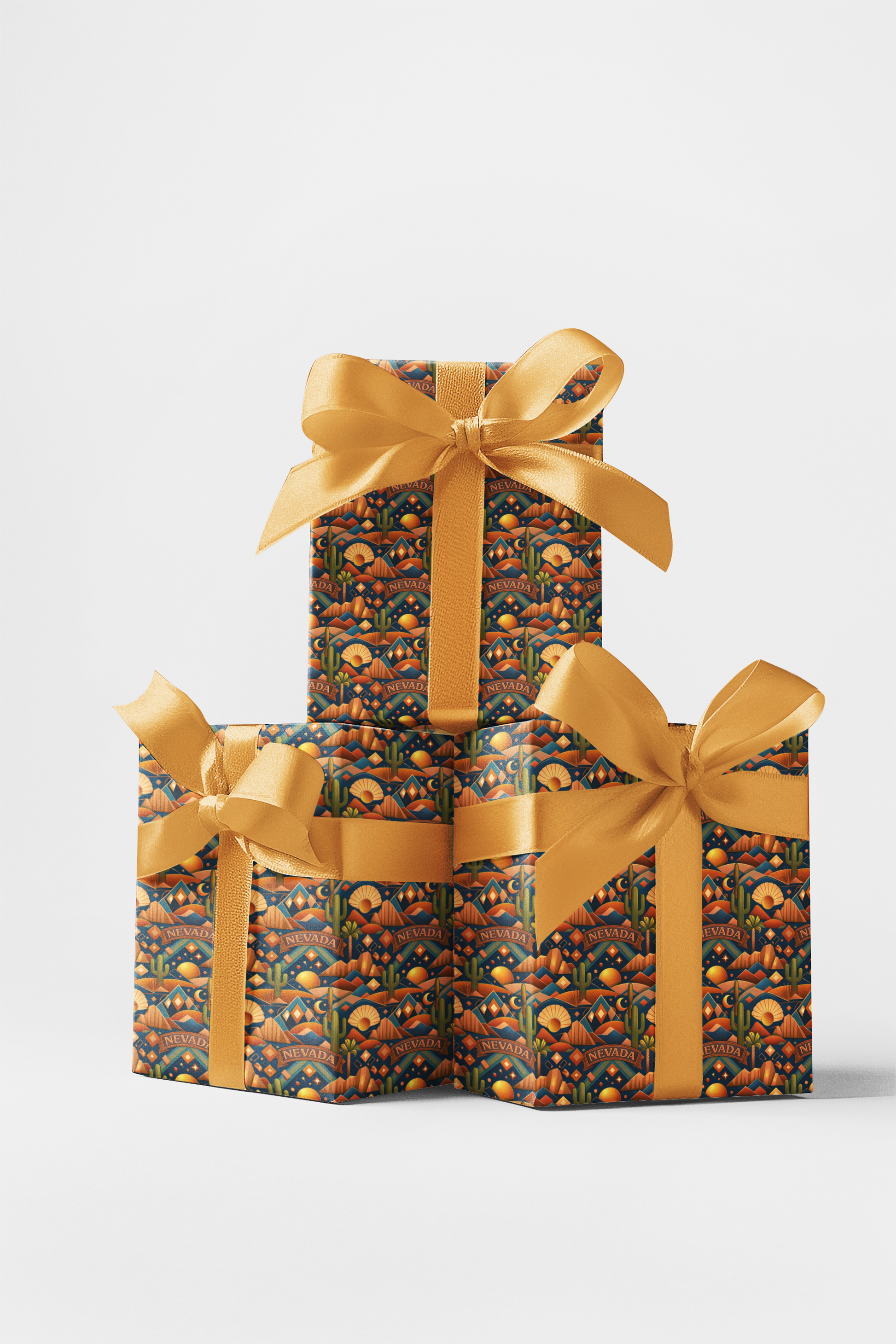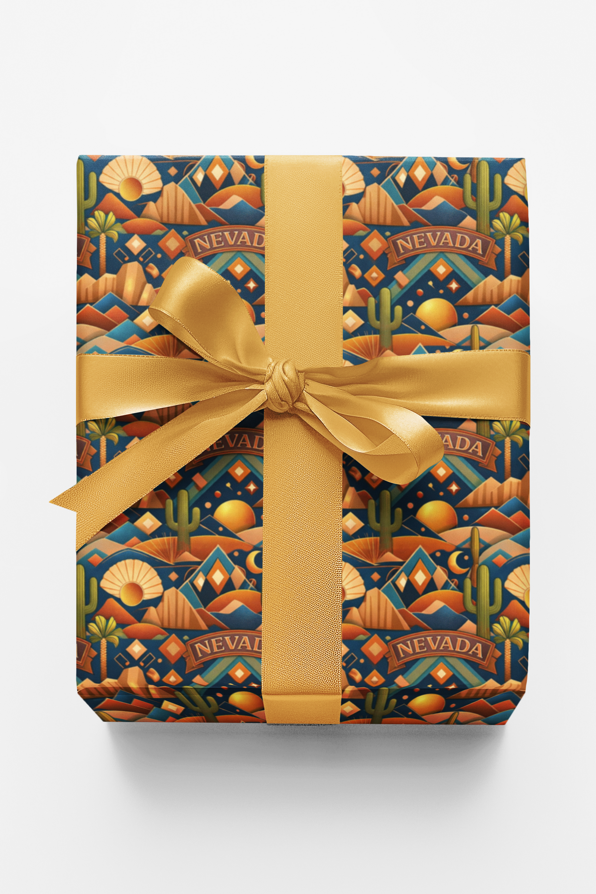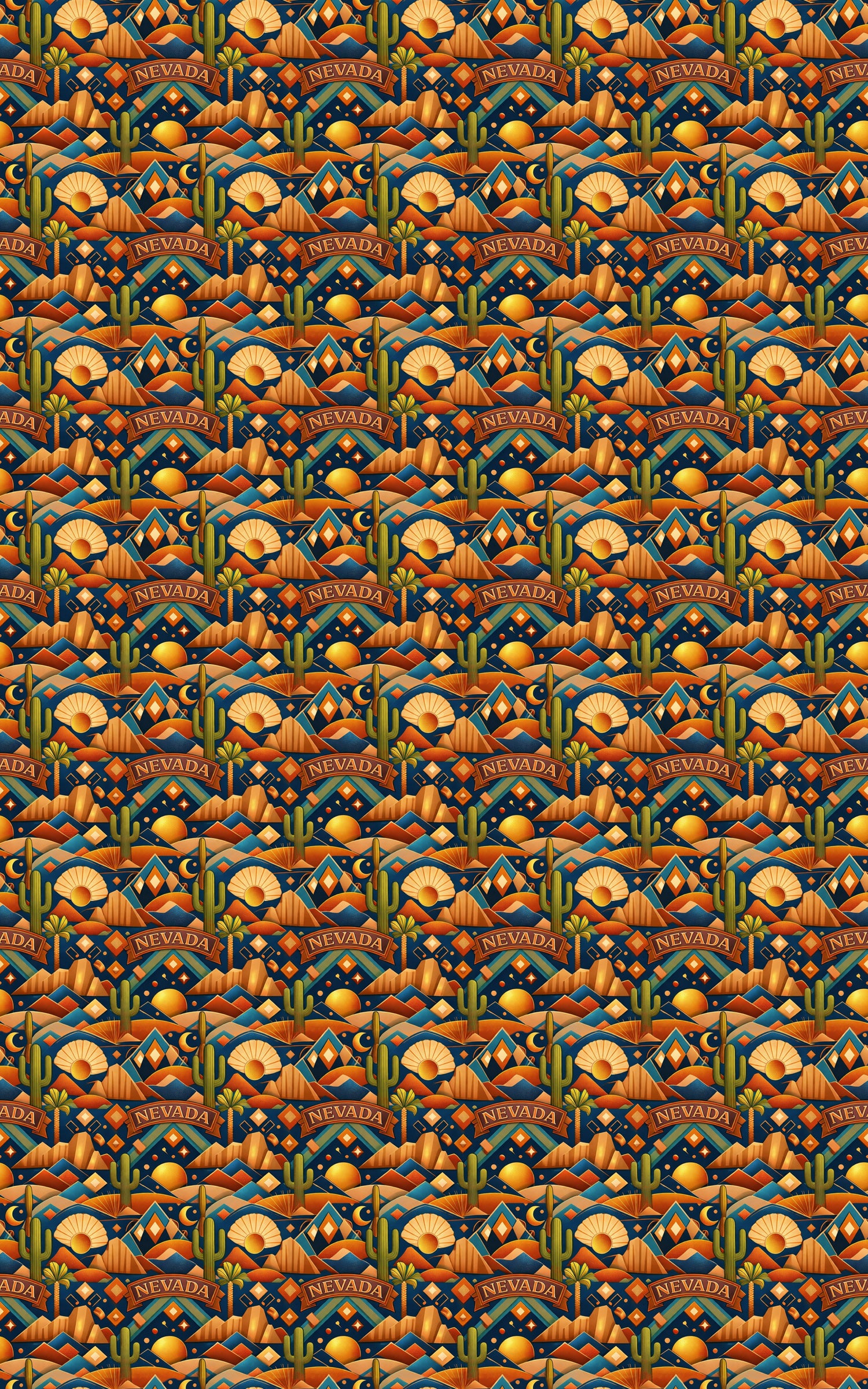 Bold and radiant, Nevada Desert Luxe glows with sun-soaked geometry and jewel-toned warmth drawn from the high desert. Layered mesas, glowing suns, and sculptural cacti unfold in rich ambers, deep teals, and midnight blues, creating a rhythm that feels both modern and timeless. This design celebrates the desert’s quiet opulence—where heat meets harmony, color carries confidence, and every fold reflects the refined strength and magnetic allure of Nevada’s endless horizon.