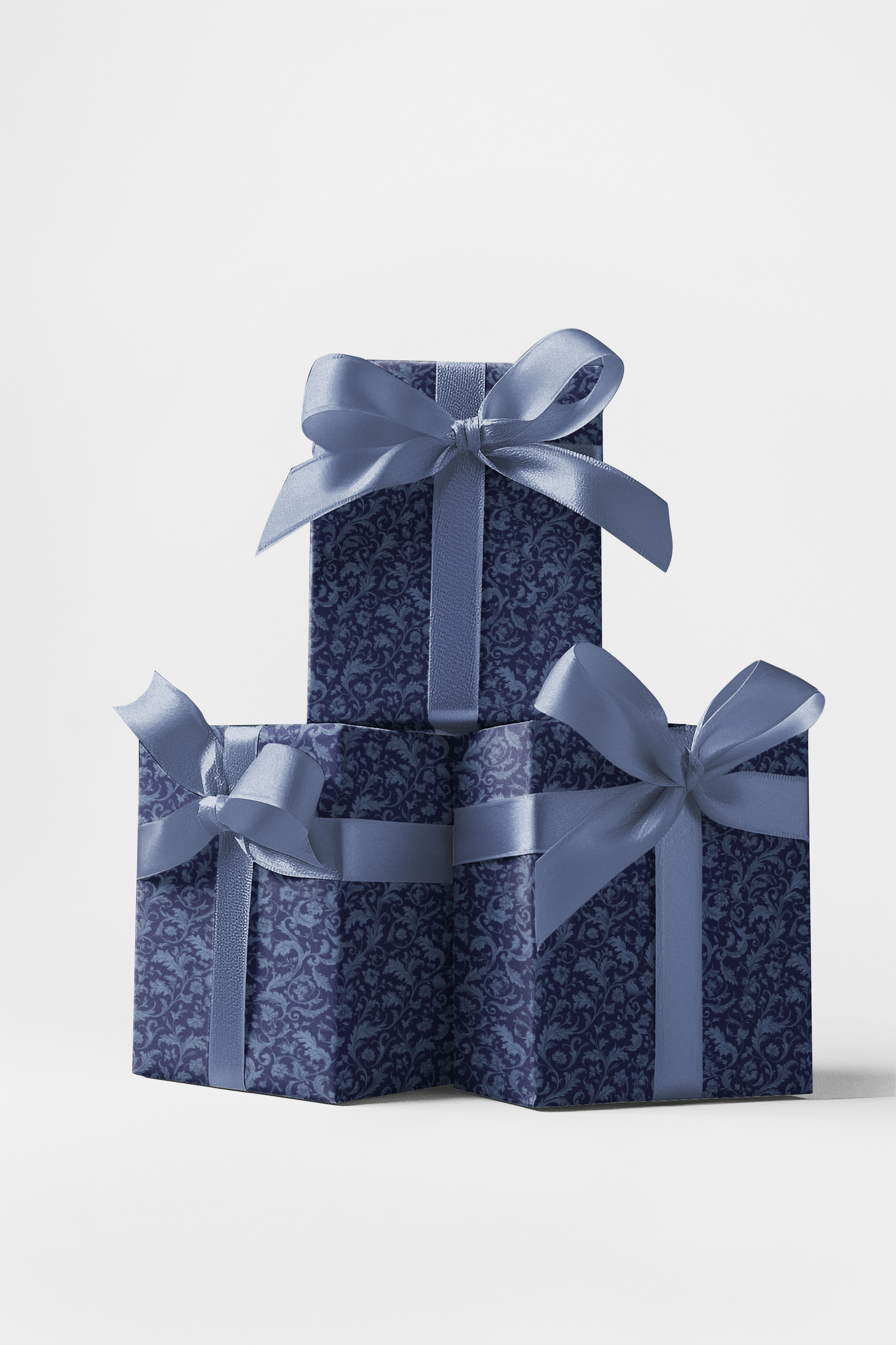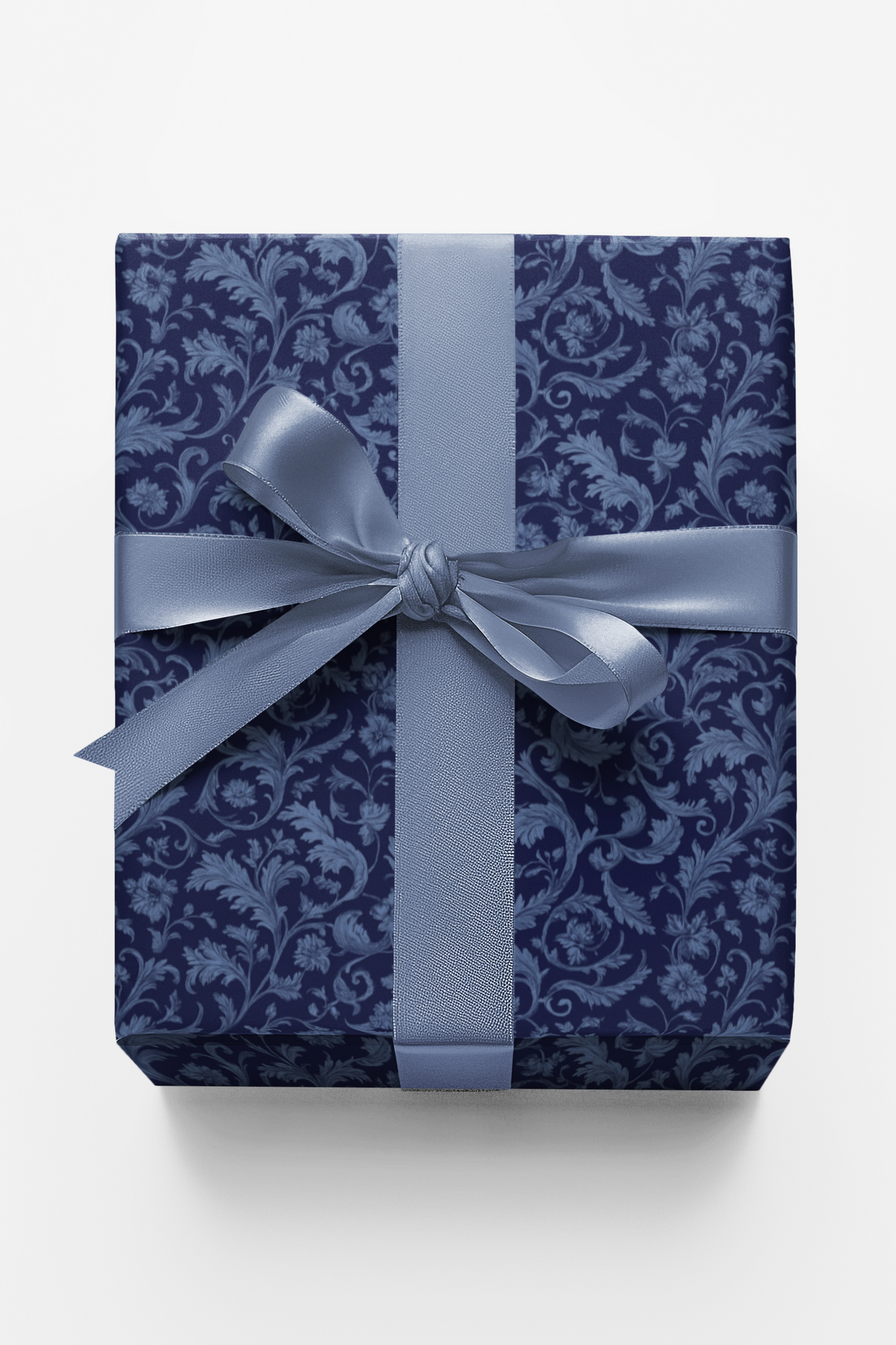 Wrapped in deep navy elegance, Midnight Manor whispers sophistication and timeless charm. Its intricate botanical swirls unfold like carvings on a grand estate wall, each curve bathed in subtle shadow and sheen. The design captures the quiet opulence of moonlit halls and velvet-draped evenings — a dance between light and depth. Every fold feels regal yet refined, turning each gift into a statement of grace, mystery, and enduring beauty.