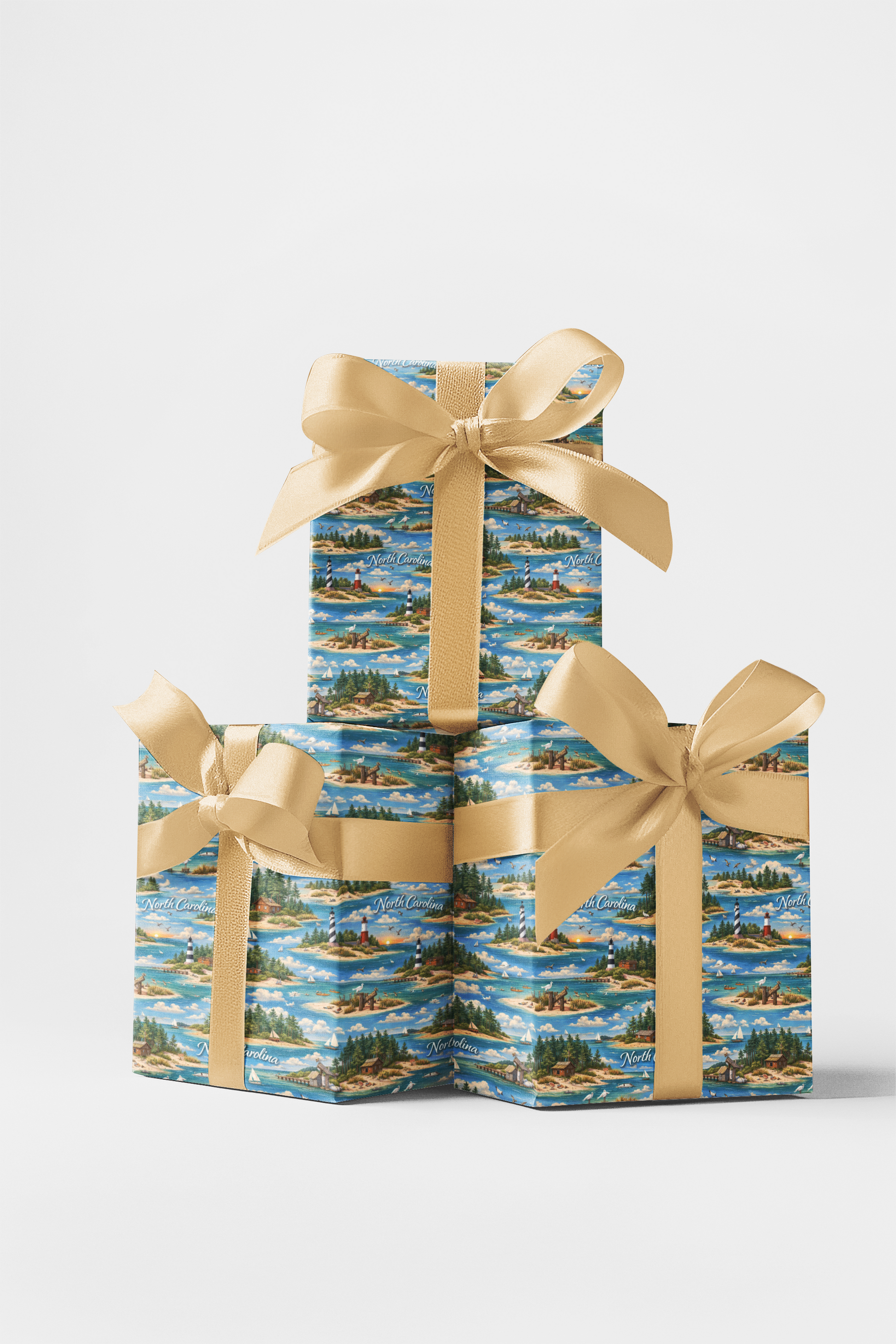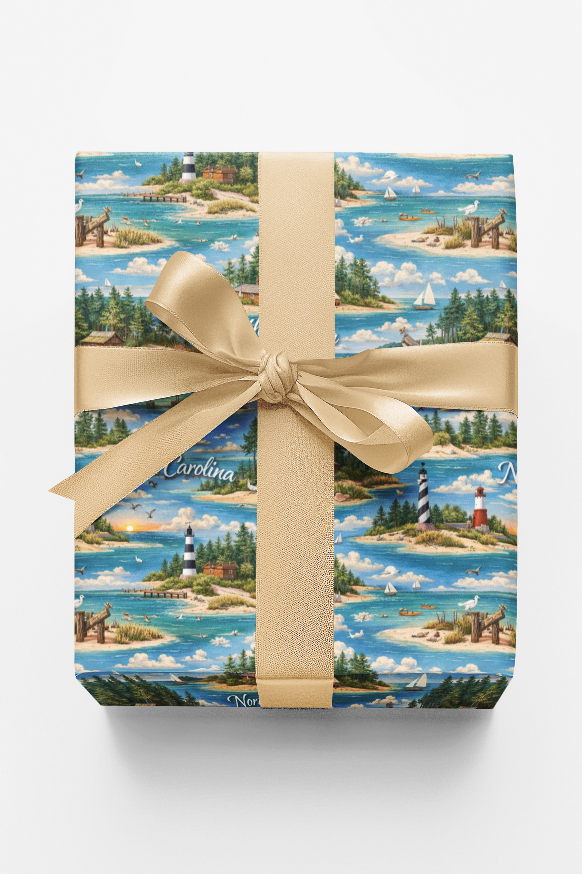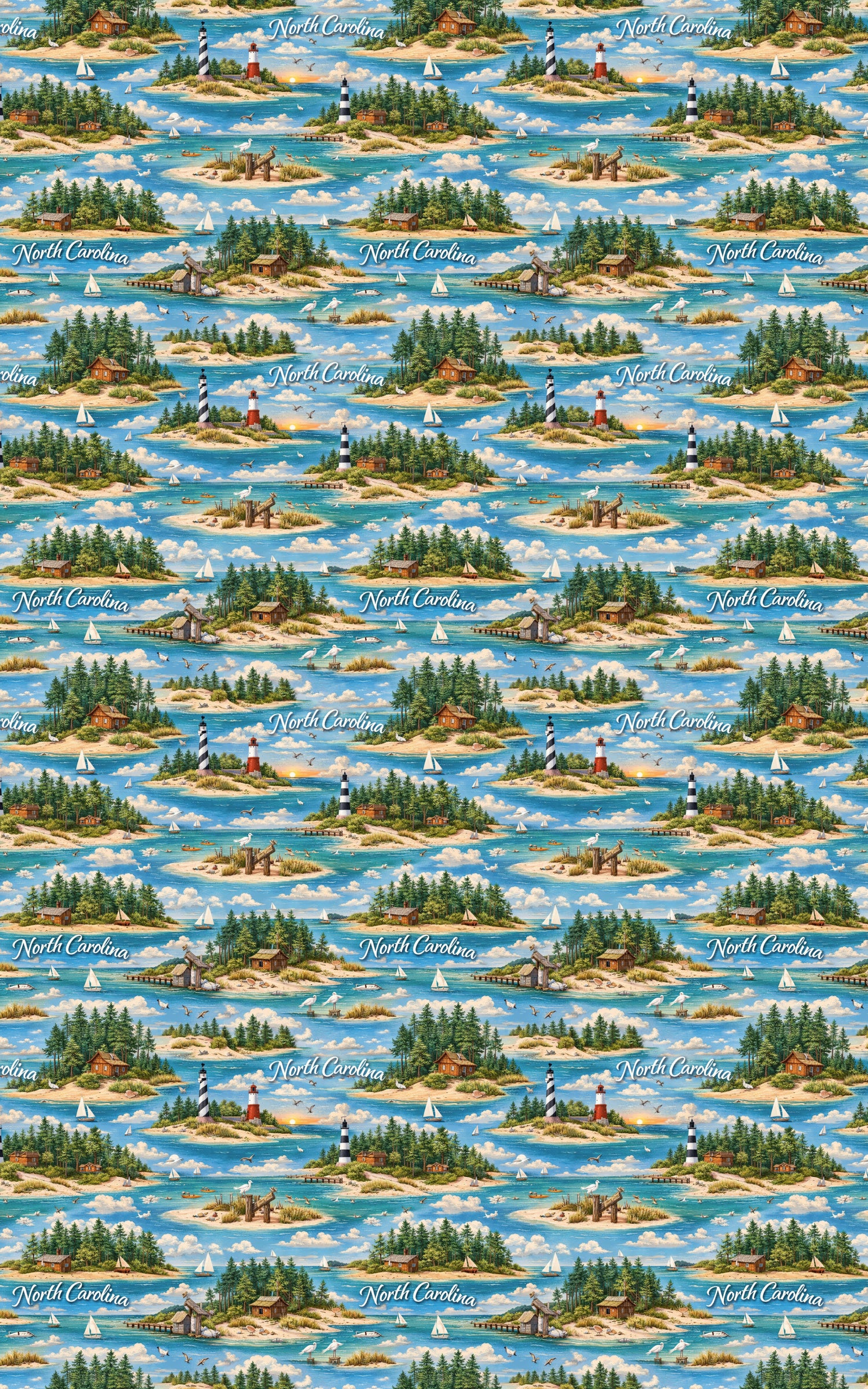 Fresh and inviting, North Carolina Coastal & Pine drifts between sunlit shores and quiet pine-lined inlets, capturing the gentle rhythm of the Carolina coast. Lighthouses stand watch over blue waters as sailboats glide past sandy coves and evergreen islands. This design blends salt air and forest calm—where every fold carries the warmth of coastal breezes, the serenity of shaded pines, and the timeless charm of North Carolina’s seaside landscapes.