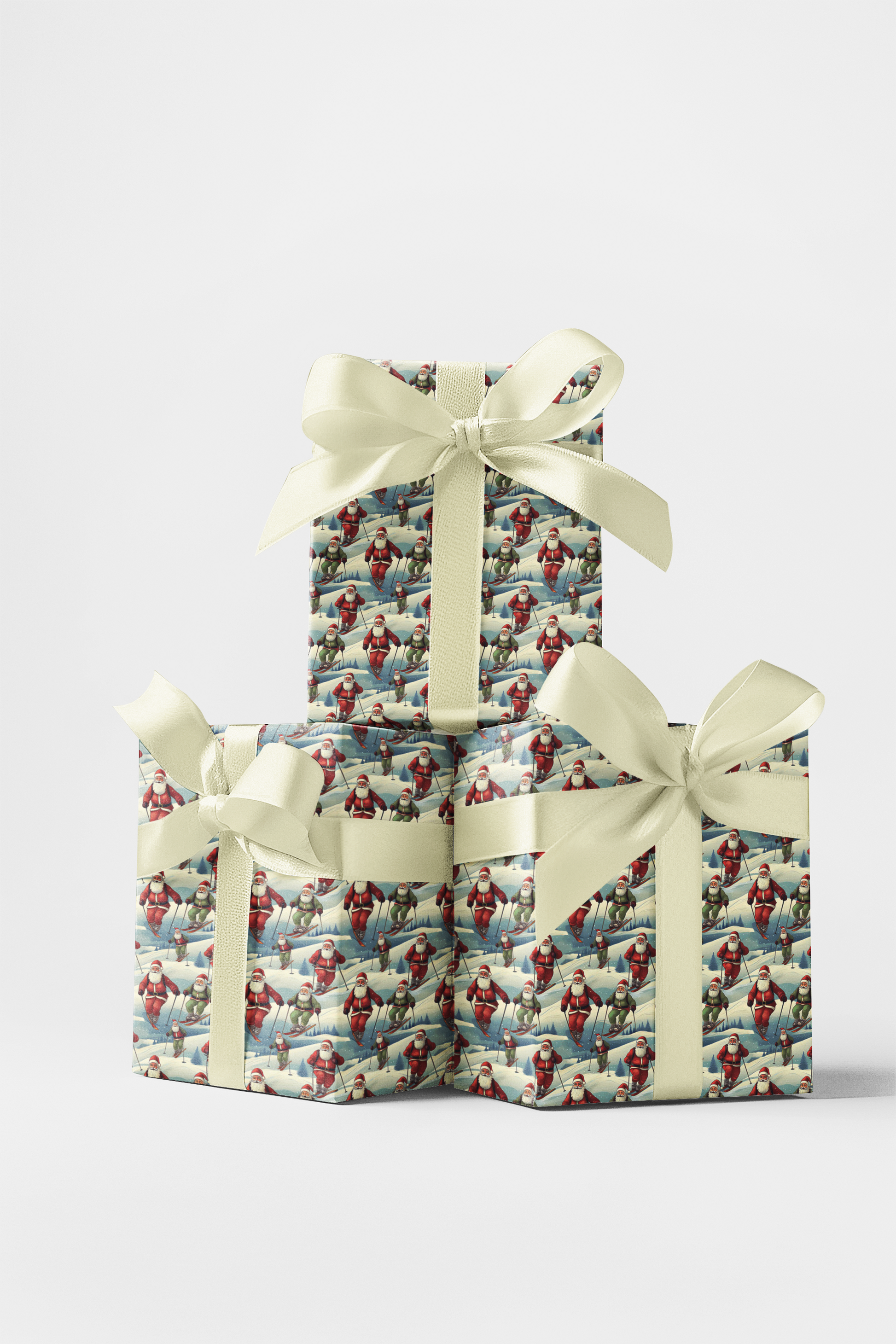 Bring holiday fun to your gifts with our North Pole Downhill wrapping paper and gift tags. Featuring Santa and elves skiing down snowy hills in a playful, colorful design. Perfect for ski enthusiasts, children, or anyone who loves whimsical and festive Christmas themes. High-quality paper makes wrapping easy and joyful.
