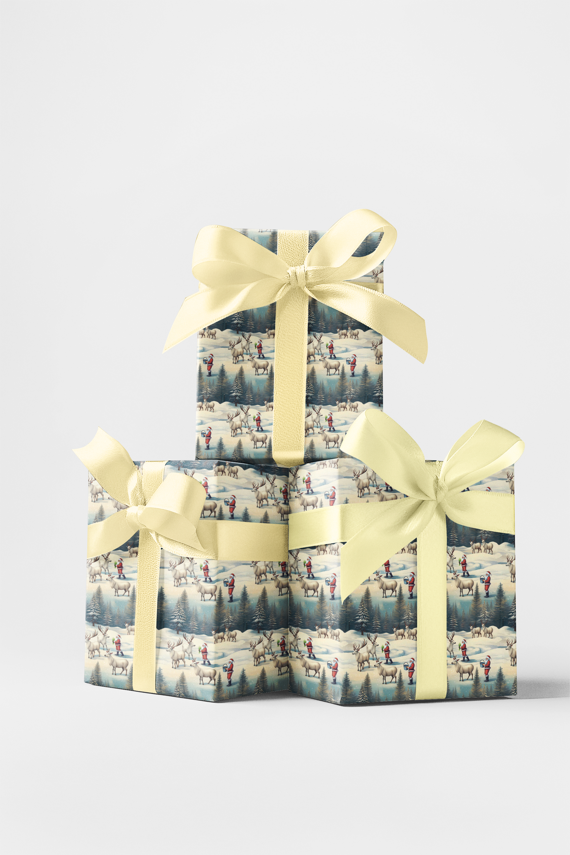 Step into a storybook winter wonderland with our North Pole Nibbles wrapping paper. This charming design captures the magic of Christmas with Santa Claus and his loyal reindeer surrounded by softly falling snow and towering evergreens. Rendered in a cozy, painterly style, the serene snowy landscape evokes the warmth and nostalgia of classic holiday art. Perfect for Christmas gifts, seasonal décor, and festive crafting, this premium wrapping paper brings a timeless touch of cheer and wonder to every package.