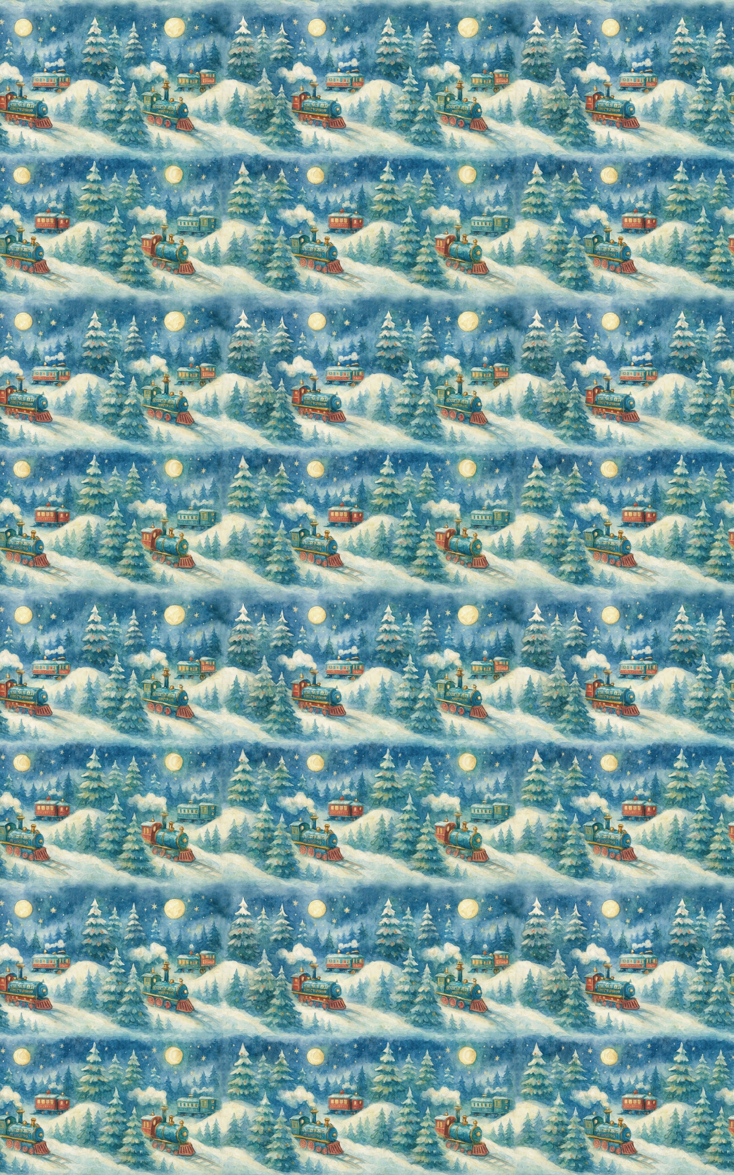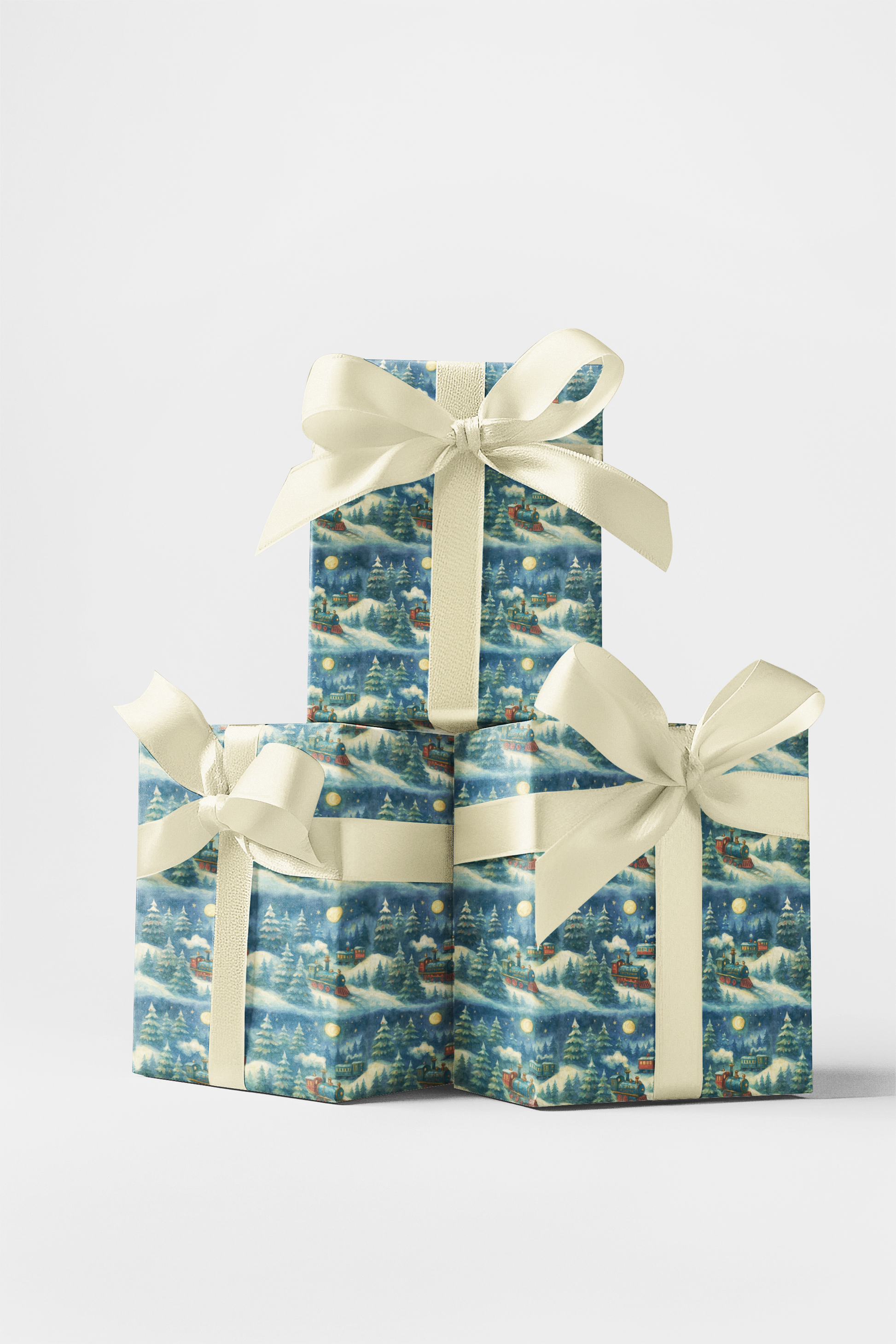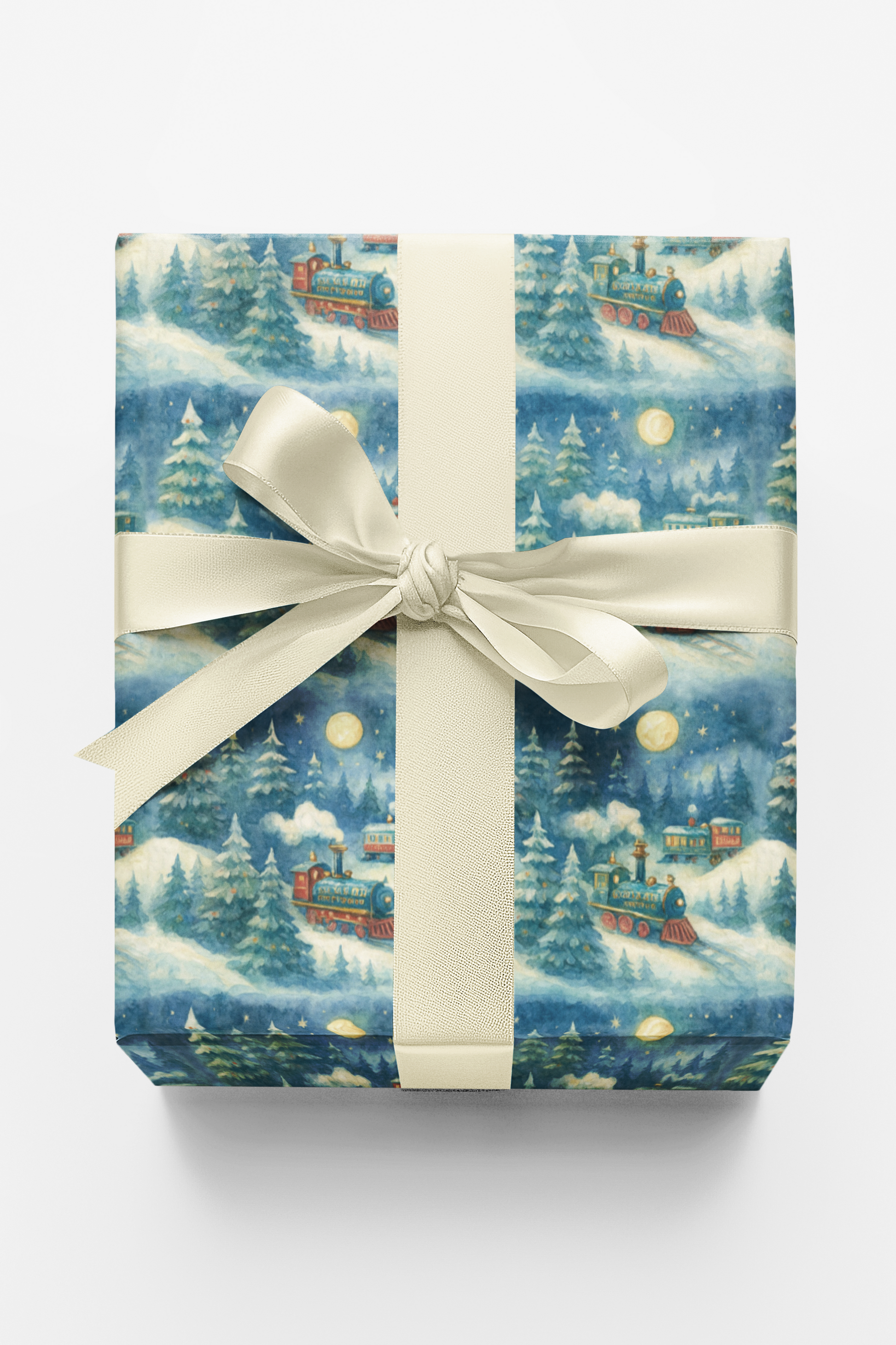Gliding through a moonlit forest of evergreens, Midnight Express carries the wonder of the season on silver rails of snow. Its steam curls like whispers of dreams, and each car gleams with the warmth of lantern light against a star-filled sky. The design evokes the magic of holiday nights—where time slows, imagination stirs, and every gift feels like an adventure waiting to unfold. Each fold hums with nostalgia and wonder, wrapping every present in the timeless rhythm of winter’s most enchanting journey.