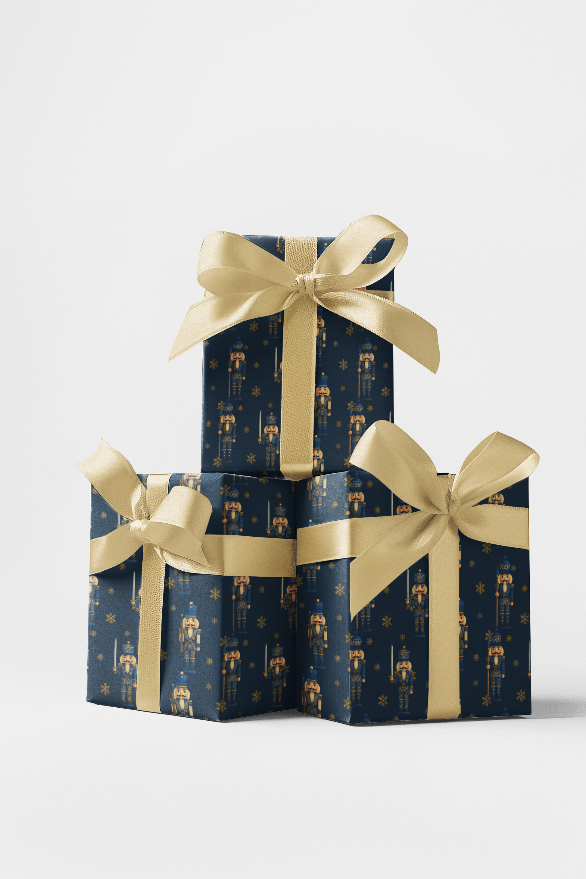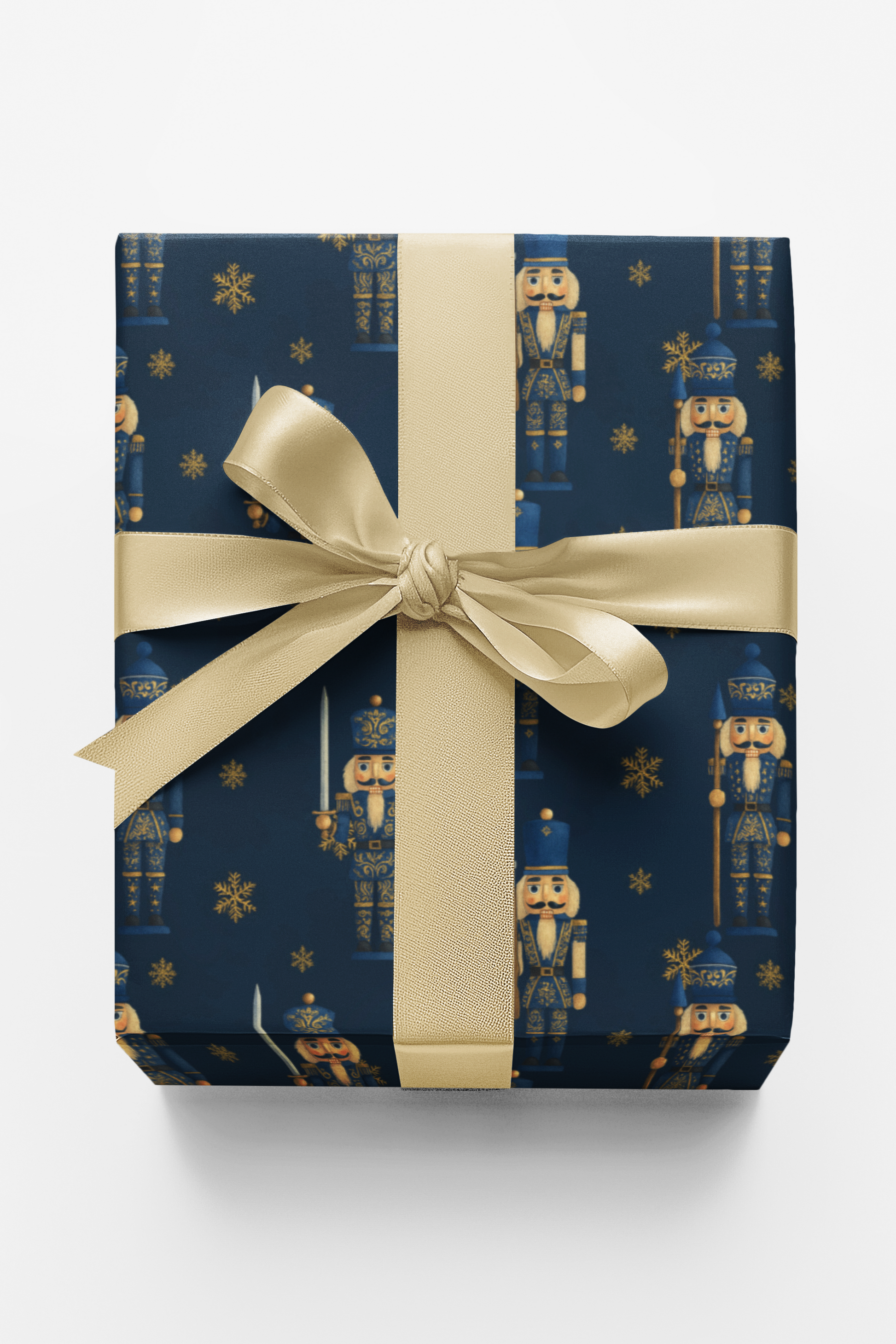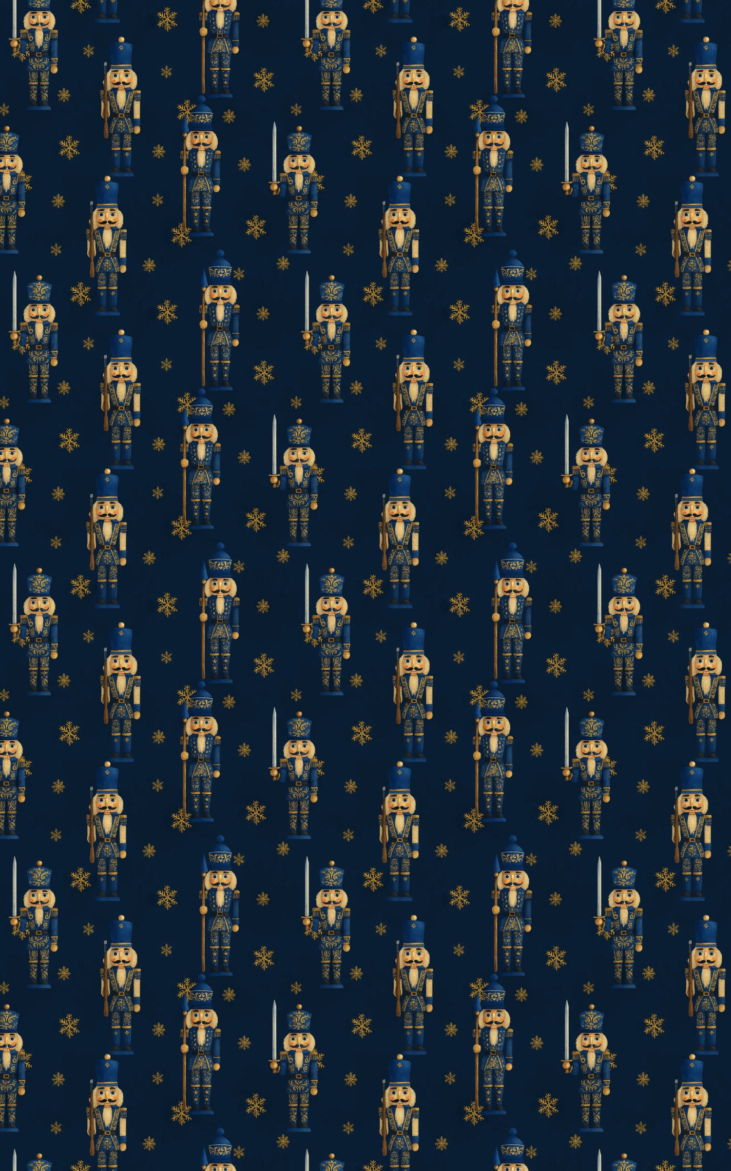 Marching across a deep, regal navy, these ornate nutcrackers stand tall with golden detailing that gleams like holiday treasure. Each figure—whether holding a sword or standing at attention—brings the timeless magic of Christmas pageantry to life, wrapped in elegance and old-world charm. Snowflakes scatter between them like tiny bursts of enchantment, adding sparkle and movement to the scene. This design celebrates tradition, whimsy, and the enduring wonder of the Nutcracker story—where every fold feels like stepping onto a festive stage lit with shimmering gold and holiday nostalgia.