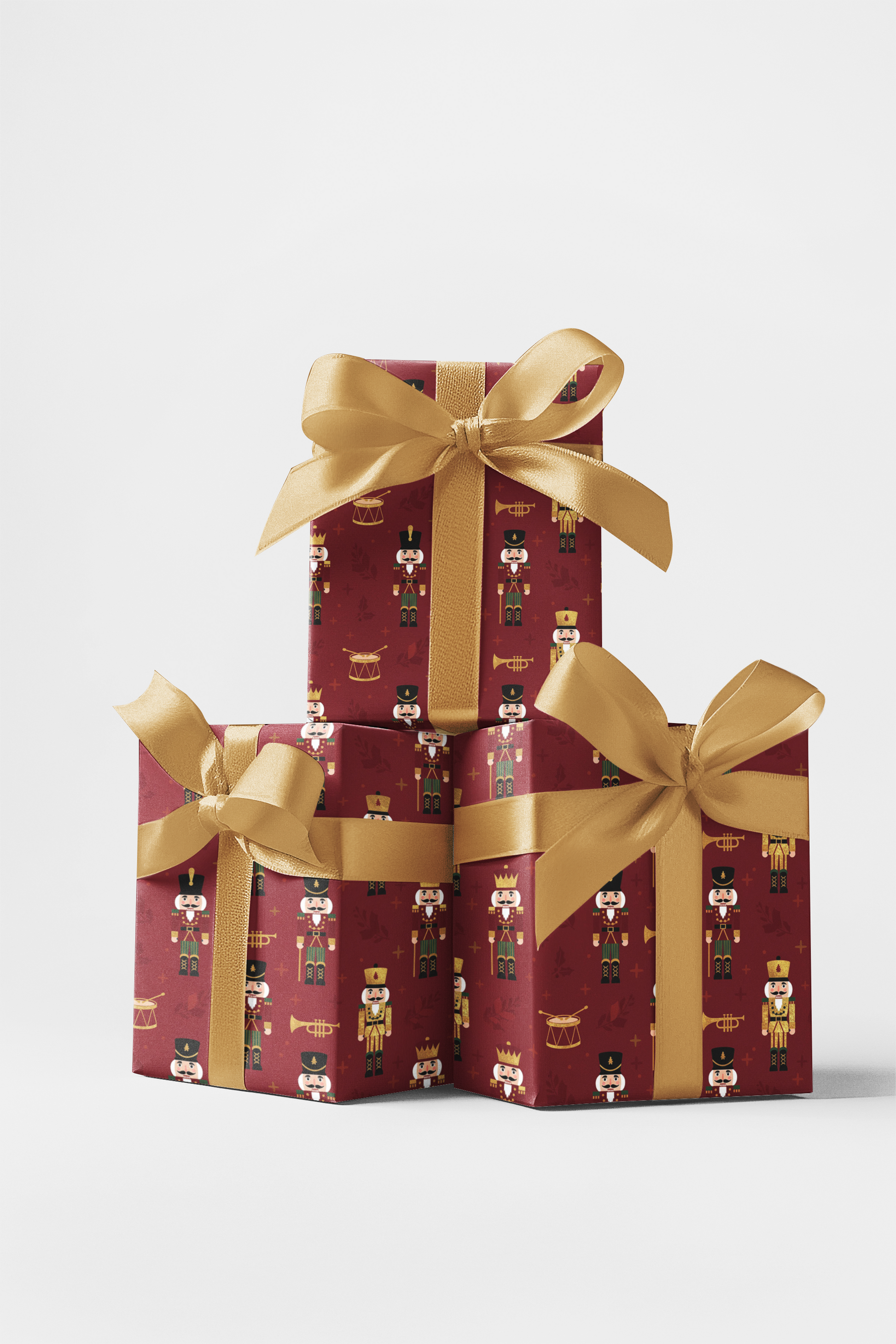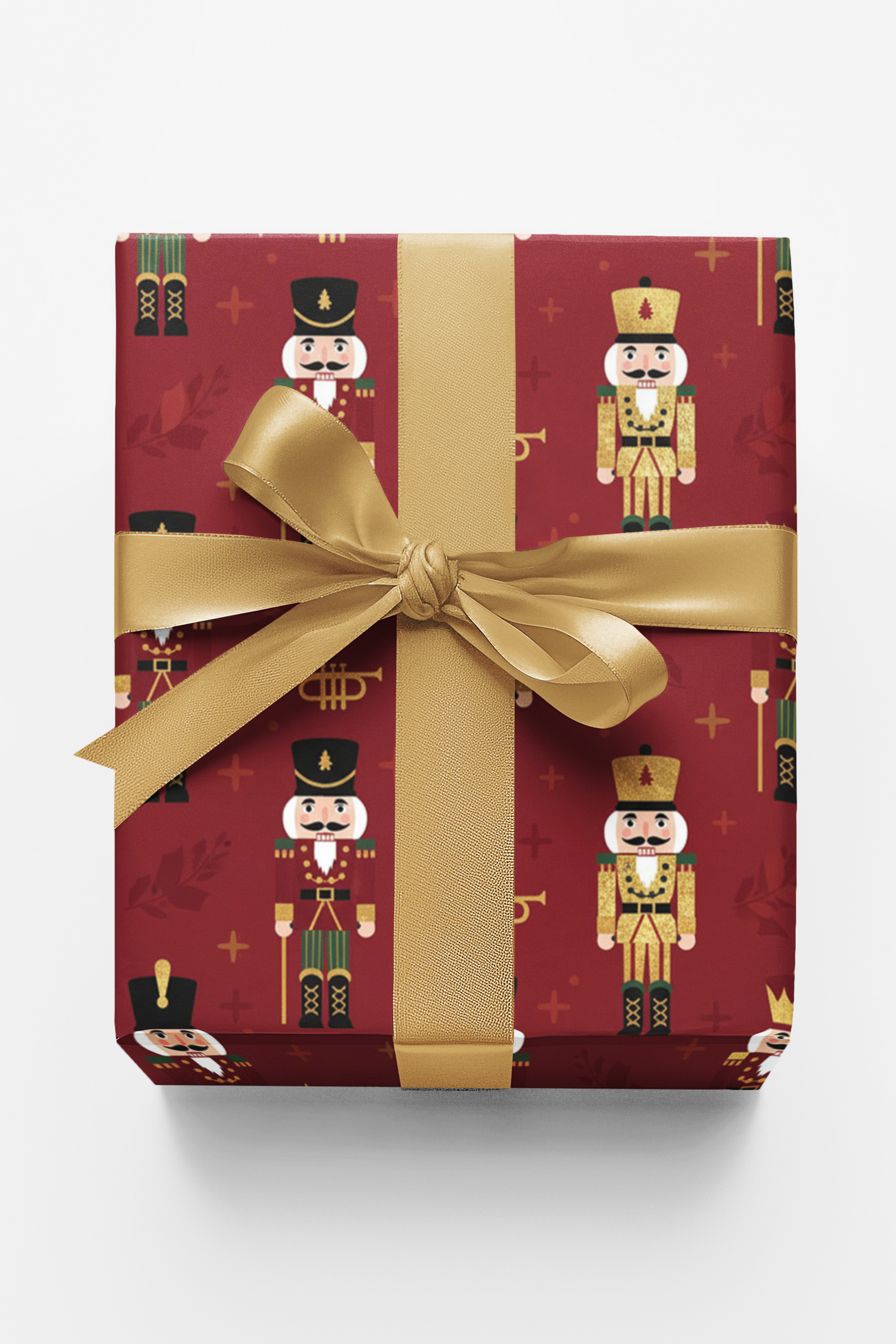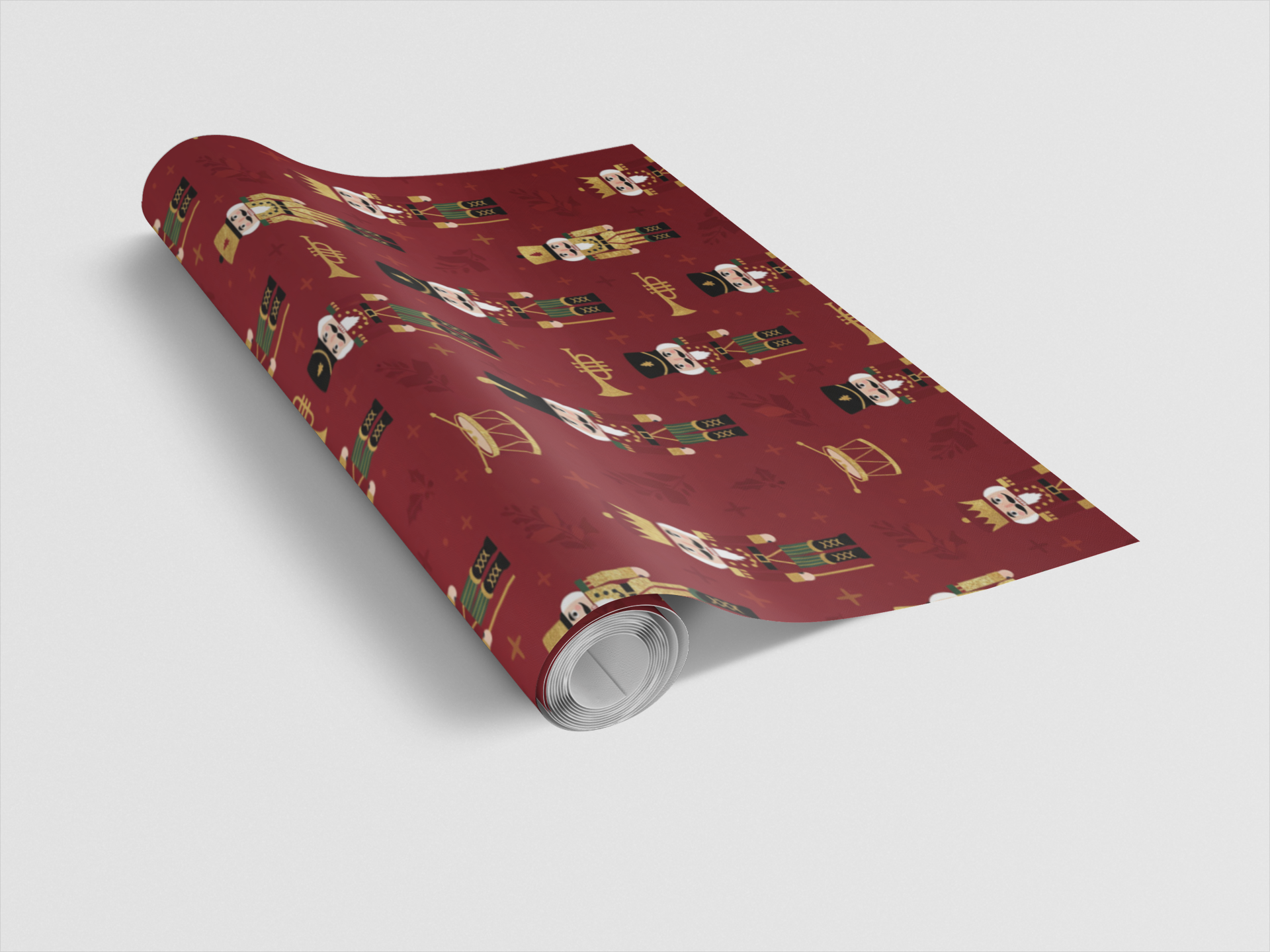 Bring the magic of a classic ballet and a traditional Christmas to your gifts with our Nutcracker Parade wrapping paper! This festive, seamless pattern features stylized illustrations of toy soldiers, drums, and trumpets, all marching in a vibrant parade. The design is richly colored in a classic holiday palette of deep red, forest green, and shimmering gold accents, set against a warm red background scattered with subtle holly motifs. It is the perfect wrap for Christmas, holiday performances, gifts for children, or any presentation that calls for a traditional, cheerful, and charming festive theme.