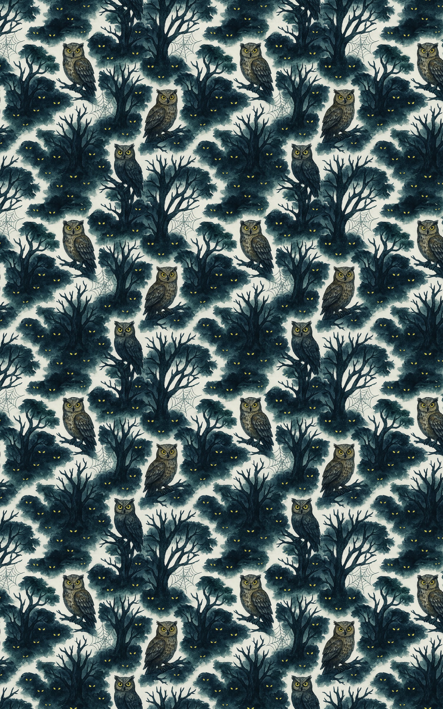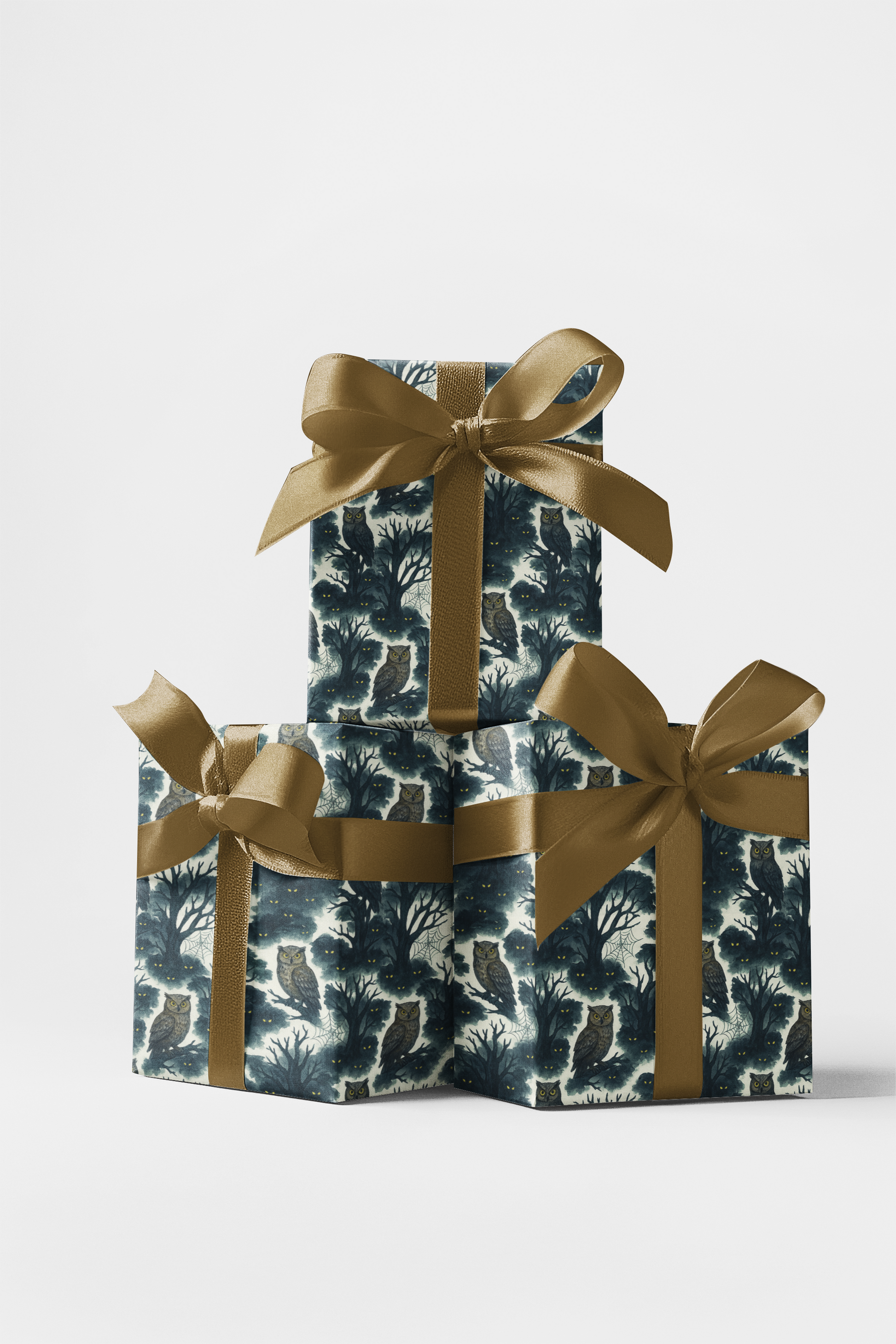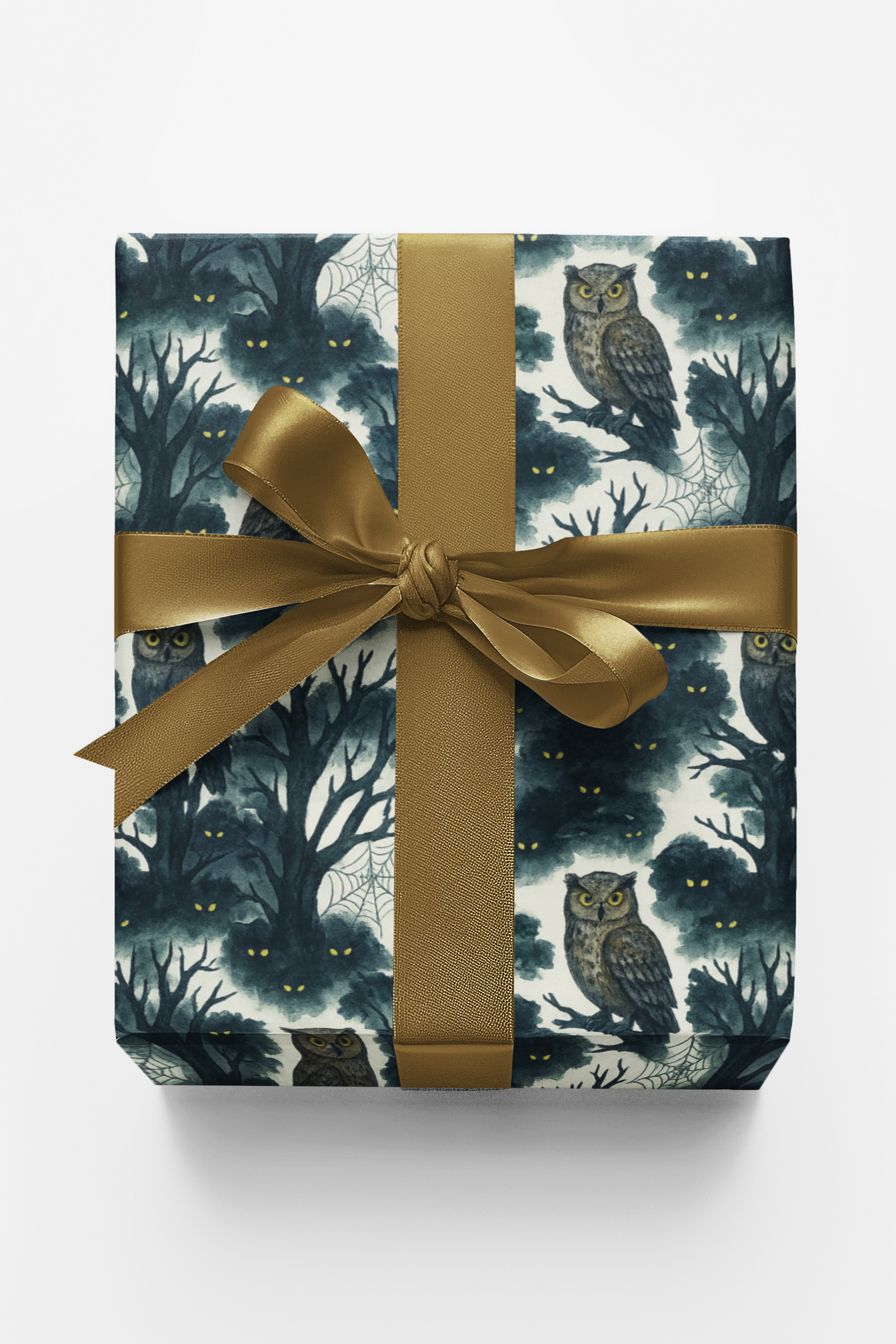 The mystery of the midnight forest with this hauntingly beautiful design. Silent owls perch among gnarled branches, cobwebs glisten in the shadows, and pairs of glowing eyes watch from the darkness. Perfect for wrapping gifts with an air of intrigue, this pattern balances elegance with just the right touch of eerie enchantment.