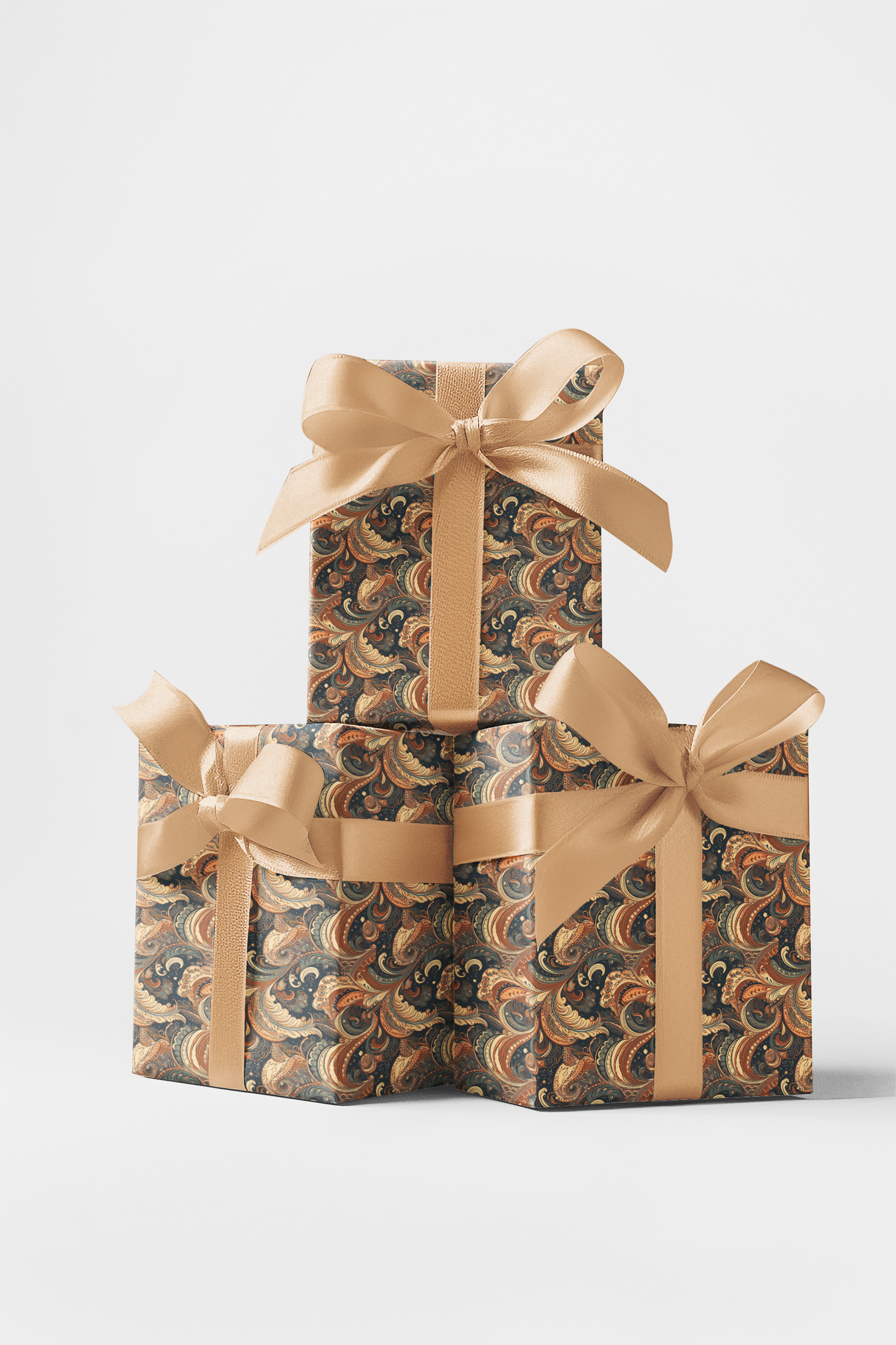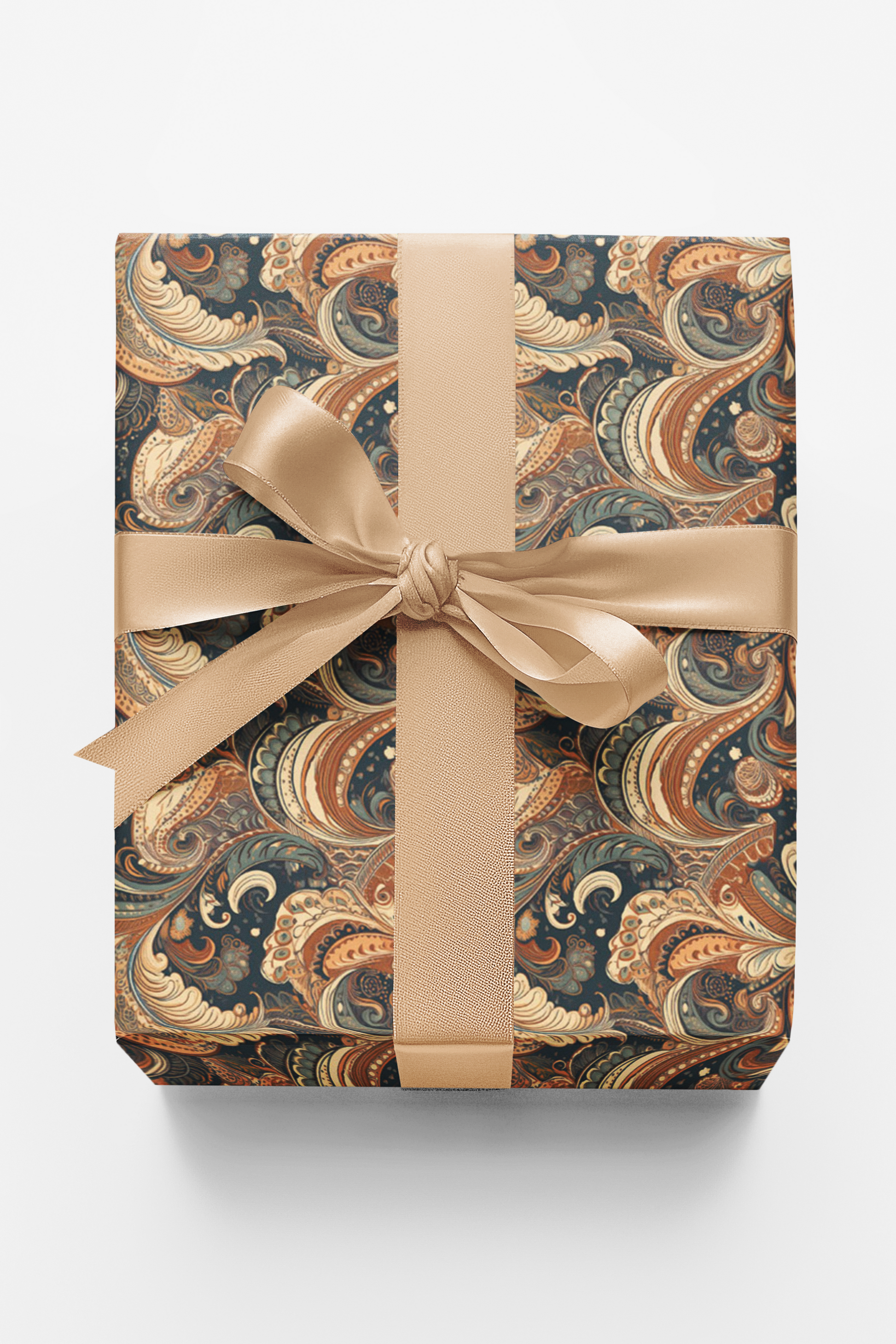Wrap your gifts in timeless beauty and artistic flair with our Paisley Grace wrapping paper! This lush, seamless pattern features an intricate design of flowing, stylized paisley motifs. The pattern is richly detailed and colored in a majestic, sophisticated palette of deep teal, terracotta, burnt orange, copper, and warm cream. The dense detailing and rich color combination give the paper a wonderful, textured depth and a luxurious, antique feel, evoking old-world textile elegance. It is the perfect wrap for anniversaries, bohemian weddings, milestone birthdays, housewarmings, or any occasion that calls for a rich, unique, and artistically detailed presentation.