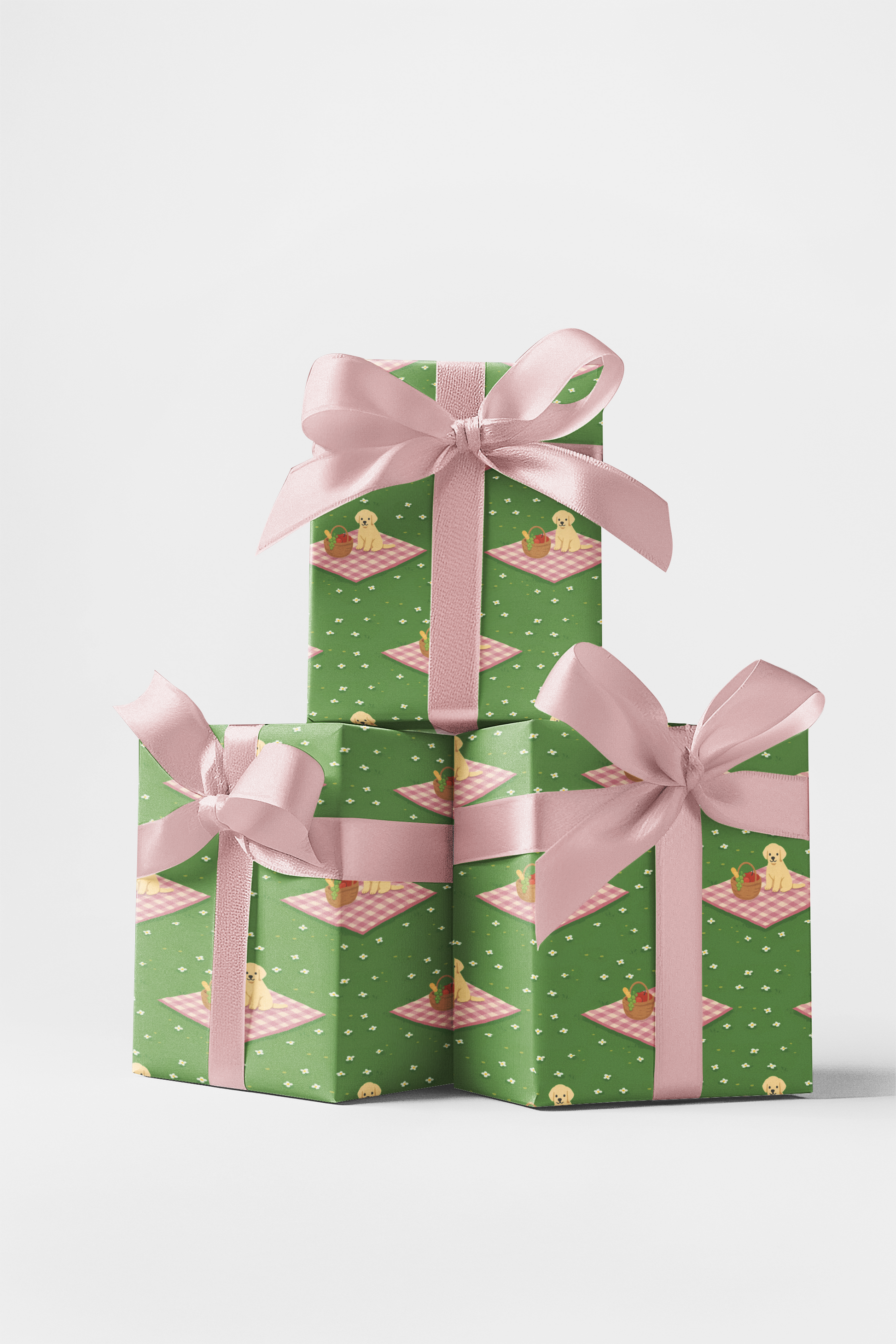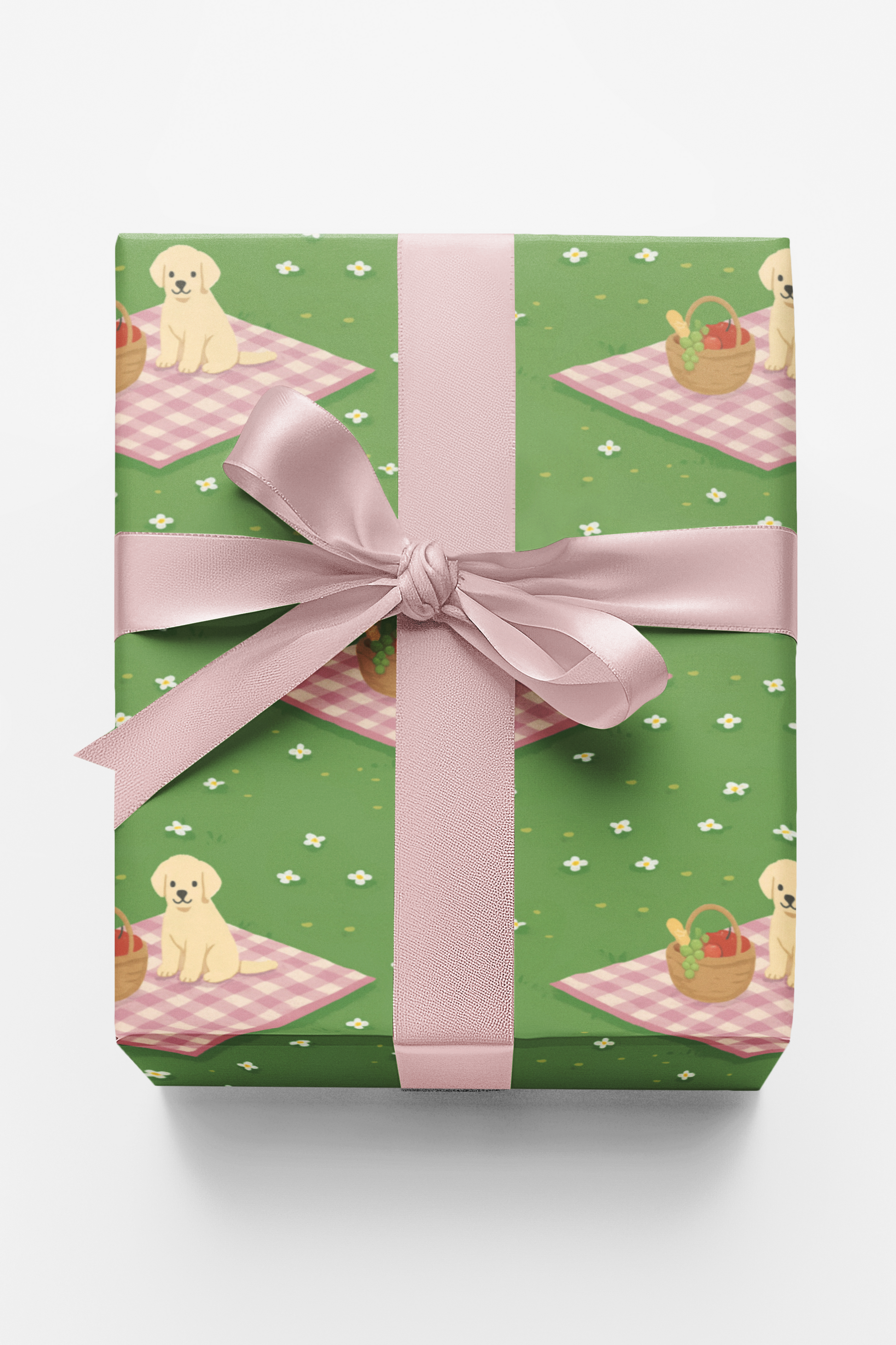 Add a dash of sunshine and sweetness to your gifts with this charming wrapping paper featuring a playful golden puppy enjoying a picnic on a pink gingham blanket. Surrounded by tiny blossoms and fresh fruit baskets, this design captures the joyful simplicity of a perfect spring afternoon. With its soft pastel palette of greens, pinks, and creams, it’s ideal for birthdays, baby showers, Easter, or everyday gifting. Pair with light pink or natural twine ribbon for a fresh, cheerful finish that’s both delightful and heartwarming.