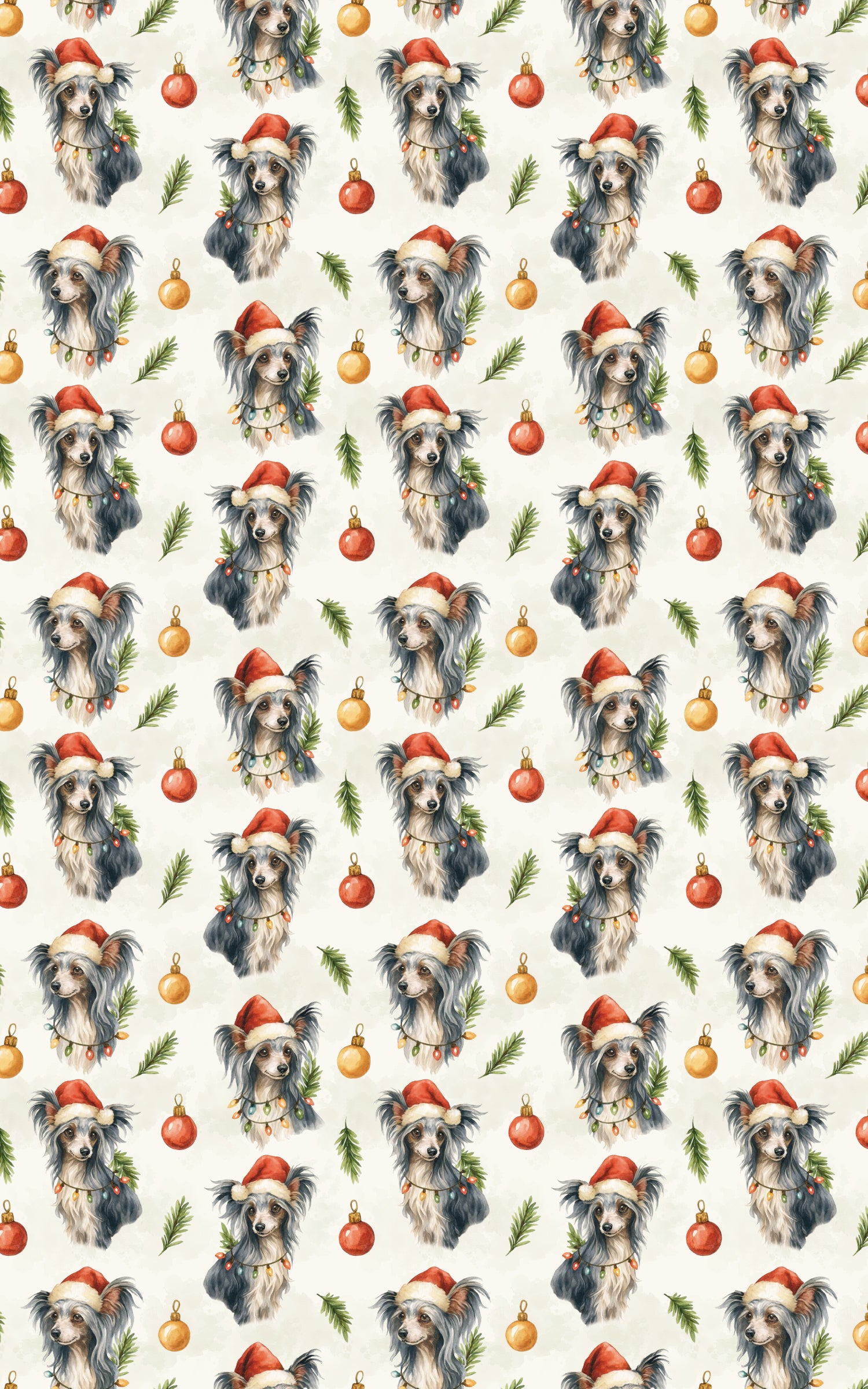 Delicate yet dazzling, this Chinese Crested radiates festive charm with a sparkle all its own. Draped in glowing lights and crowned with a Santa hat, it exudes an air of whimsy and poise—part mischief, part magic. Its silky mane shimmers like tinsel, and its bright eyes glint with the joy of the season. This design celebrates elegance wrapped in playfulness—where every glance glows with personality, and every fold carries the enchanting spirit of The Christmas Crest.