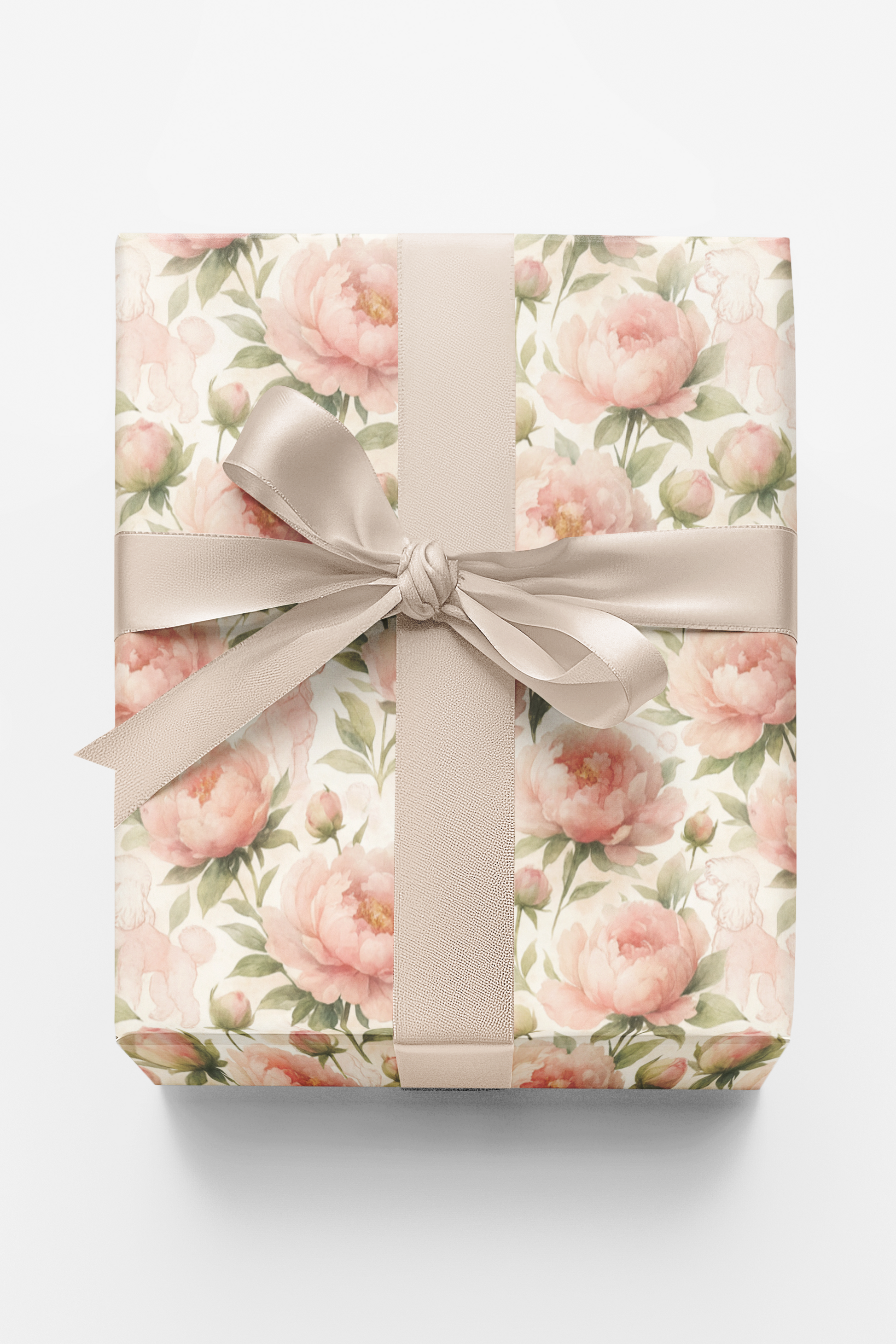 Wrap your gifts in romantic sophistication with this exquisite wrapping paper featuring delicate watercolor peonies in soft blush tones now with a whimsical twist. Hidden among the lush blooms, graceful poodles are subtly illustrated in gentle pastel shades, adding a touch of charm and playful elegance to the timeless floral design.