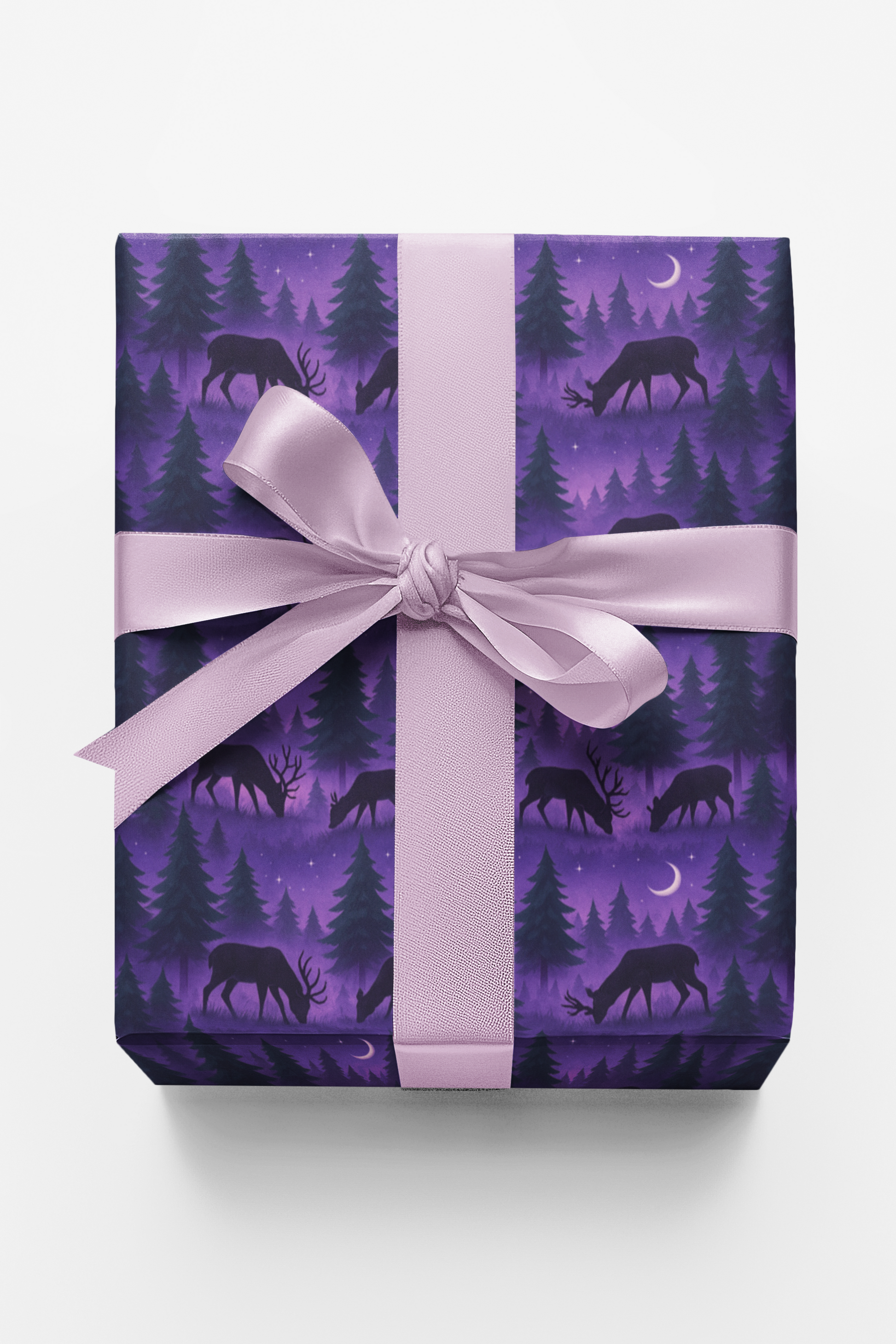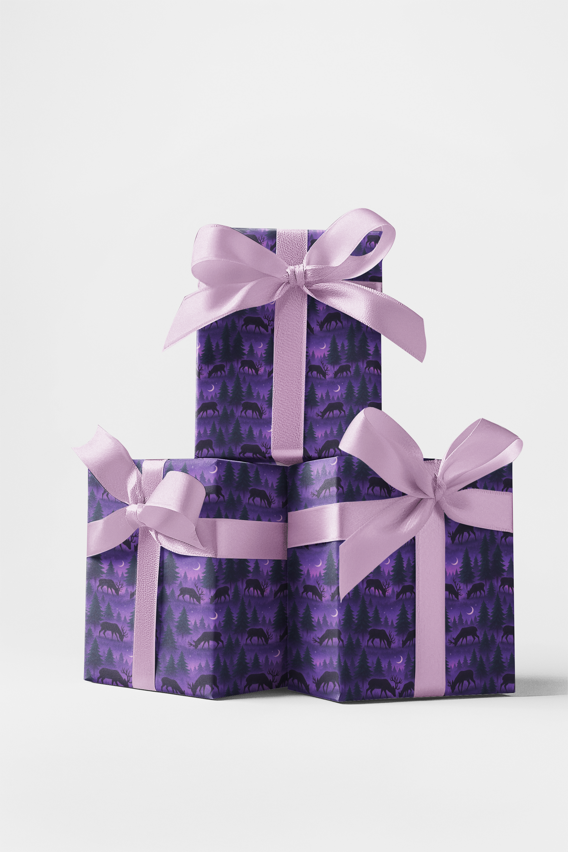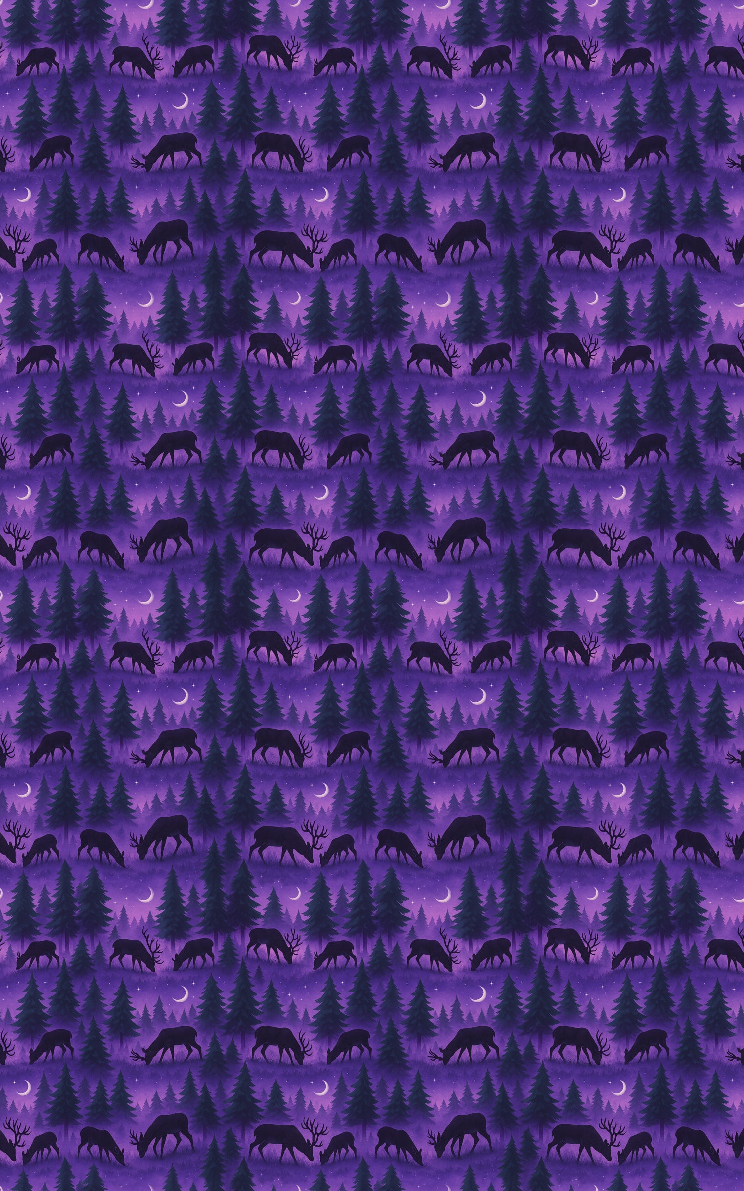 Under a canopy of twilight purple, silhouettes of gentle reindeer wander through a dreamlike evergreen wilderness. Moonlight glows softly between the trees, casting an enchanted hush over the forest as stars scatter like whispers of winter magic. This design evokes serene wonder and midnight mystery—where every fold carries the quiet beauty of a winter night, and every glance invites you deeper into a world where nature moves with calm, graceful enchantment.
