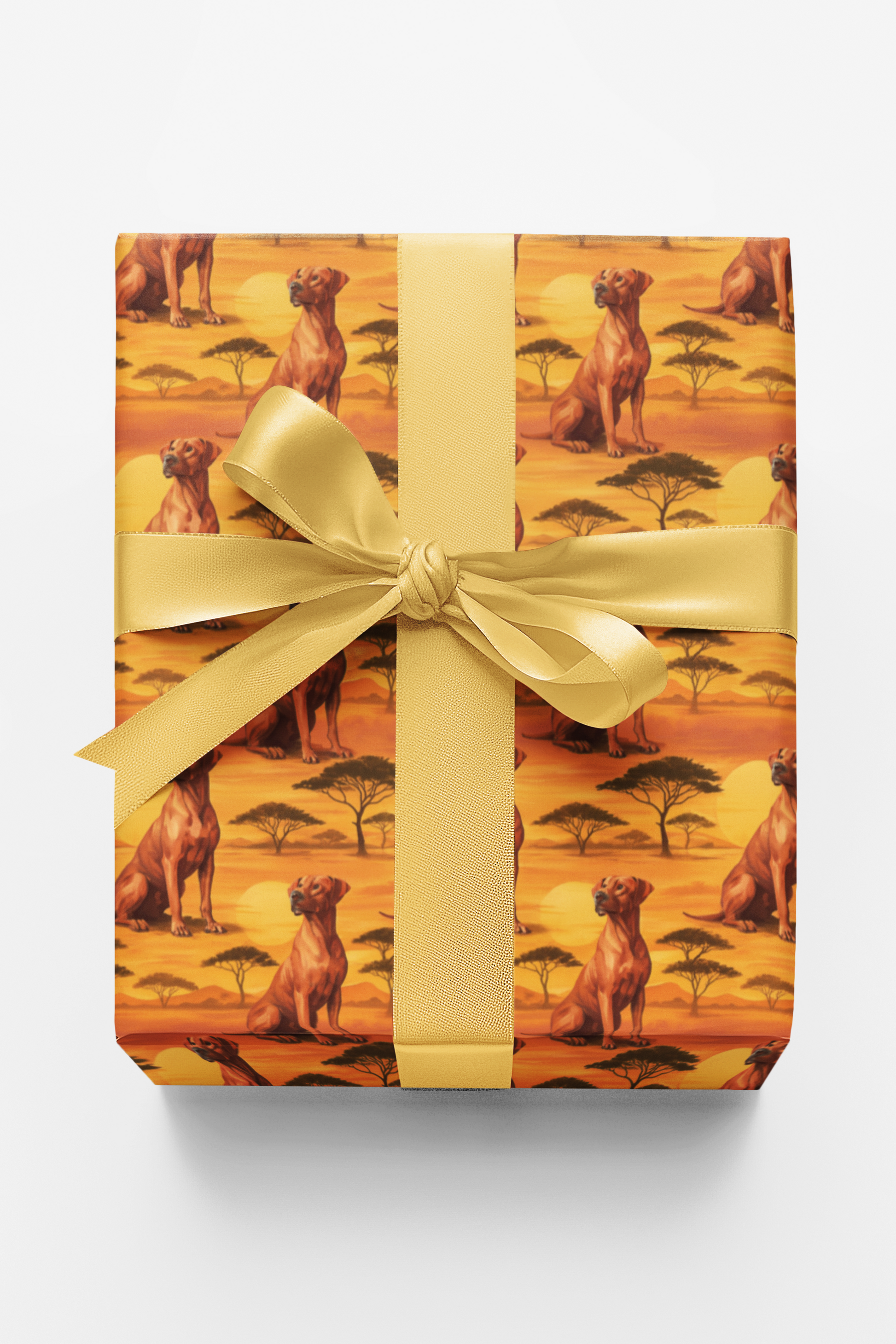 Celebrate the strength and beauty of the Rhodesian Ridgeback with our Rhodesian Ridge Radiance wrapping paper. Featuring a radiant sunrise over the savannah with elegant Rhodesian Ridgeback silhouettes along the horizon, this design evokes warmth, adventure, and timeless elegance. Perfect for dog lovers, nature enthusiasts, and gifting occasions, it adds a striking and sophisticated touch to every present.