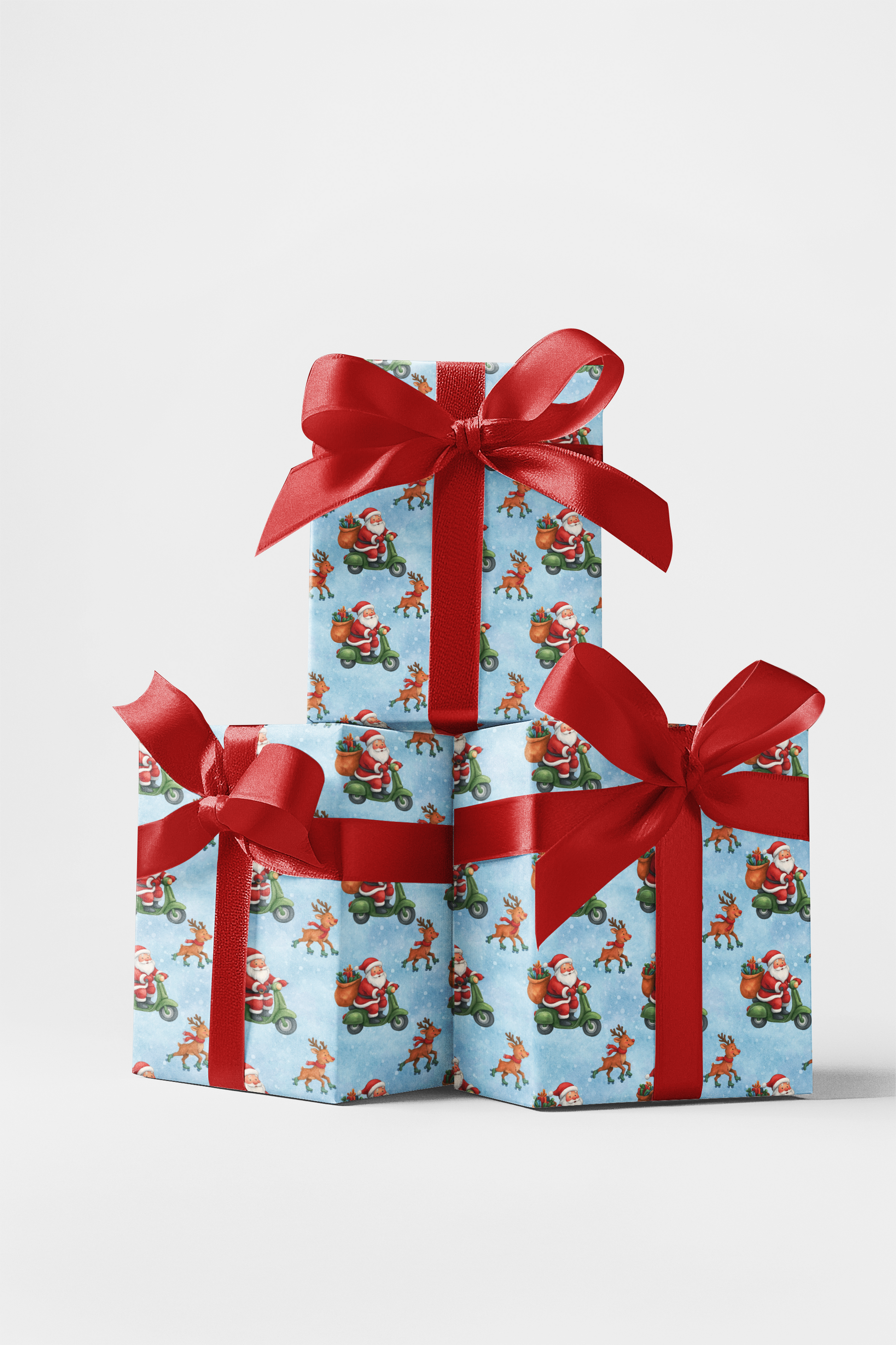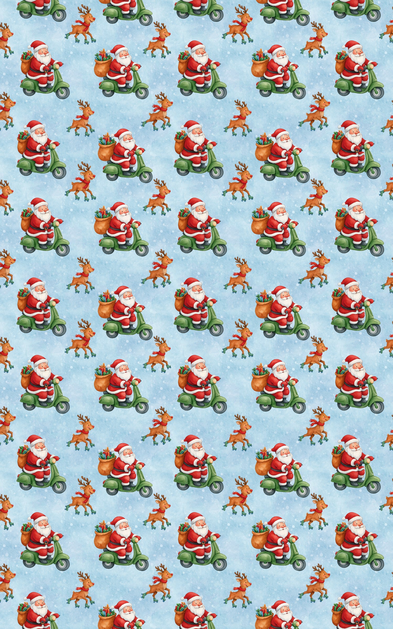 Scooter Santa zipping through the holidays in style, sack of presents on his back and reindeer keeping pace on four wheels. It’s playful, silly, and totally unexpected, perfect for gifts that deserve a little extra holiday speed. Wrap it up and roll into Christmas with flair!