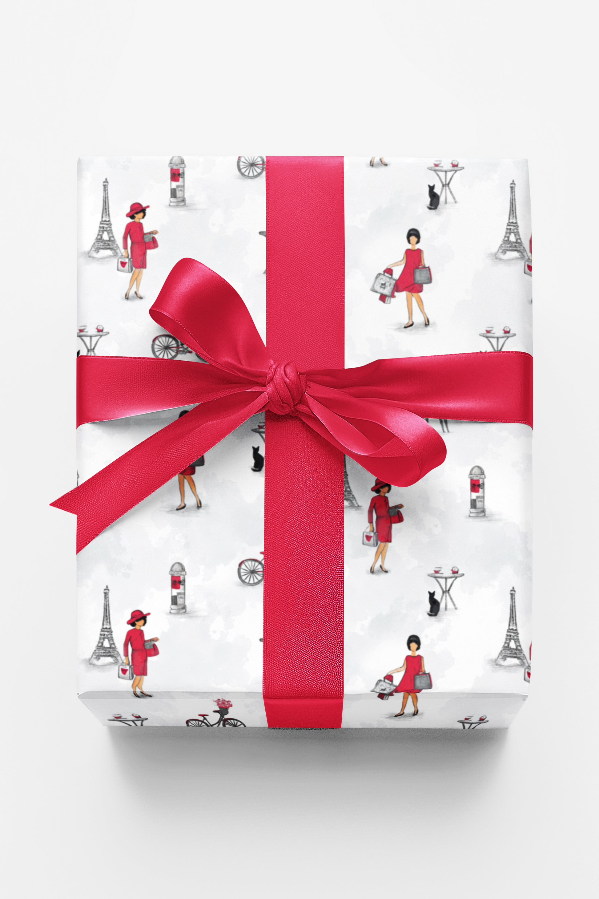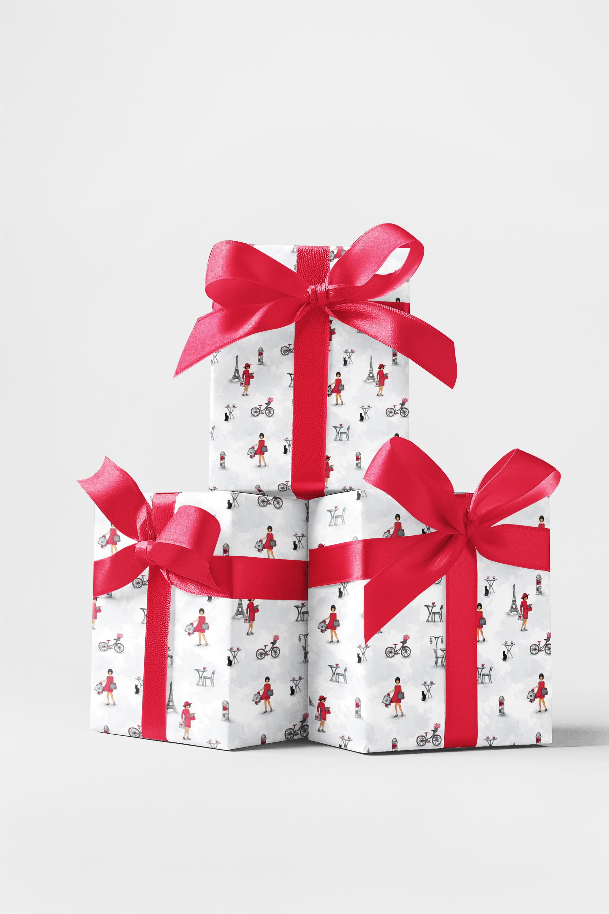 Wrapped in the effortless charm of Paris, Parisian Stroll captures the magic of café mornings, bicycle rides, and love beneath the Eiffel Tower. Splashes of crimson and soft gray sketch a story of timeless elegance—where every fold whispers of croissants, cobblestones, and couture. This design celebrates sophistication with a playful wink, embodying the grace of the city of lights. Every gift becomes a love letter to style, wanderlust, and the art of living beautifully.