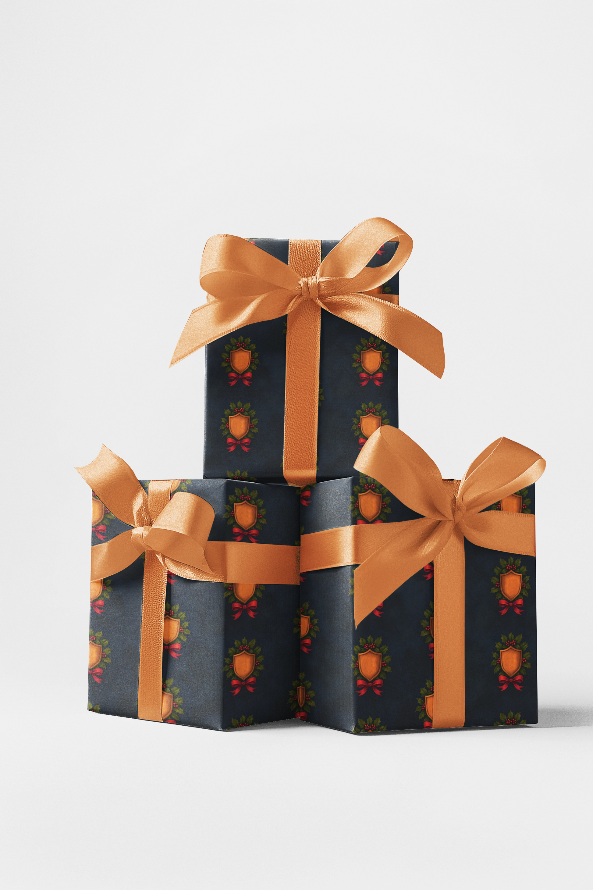 Regal and radiant, this design brings the grandeur of a noble holiday crest to life. Rich gold emblems glow against a deep midnight backdrop, each one crowned with holly leaves and tied in sumptuous crimson ribbon. Royal Christmas Badge celebrates tradition, elegance, and the splendor of the season—where every fold feels ceremonious, every glance shines with festive prestige, and every gift is wrapped in the timeless majesty of a royal winter celebration.