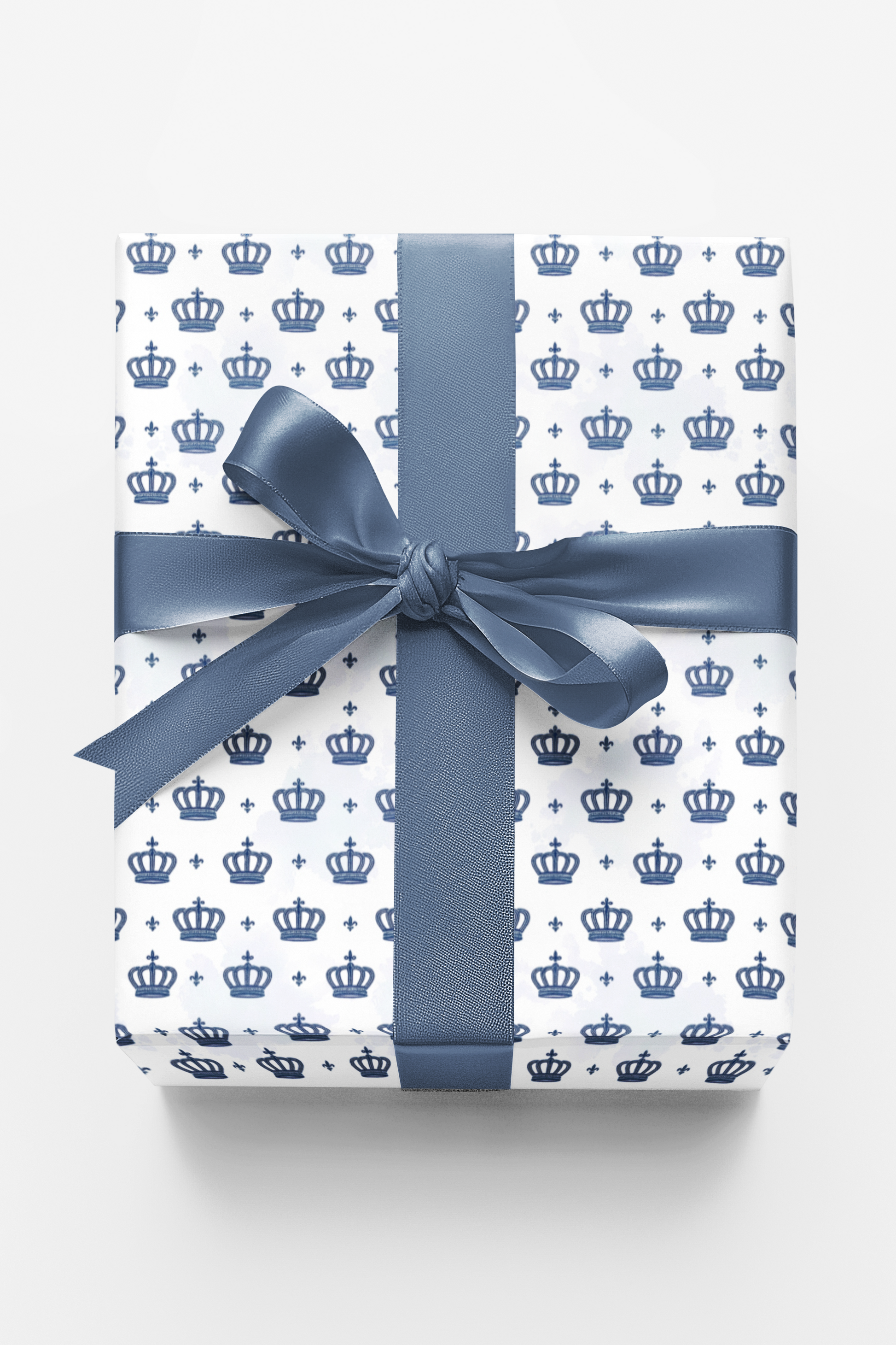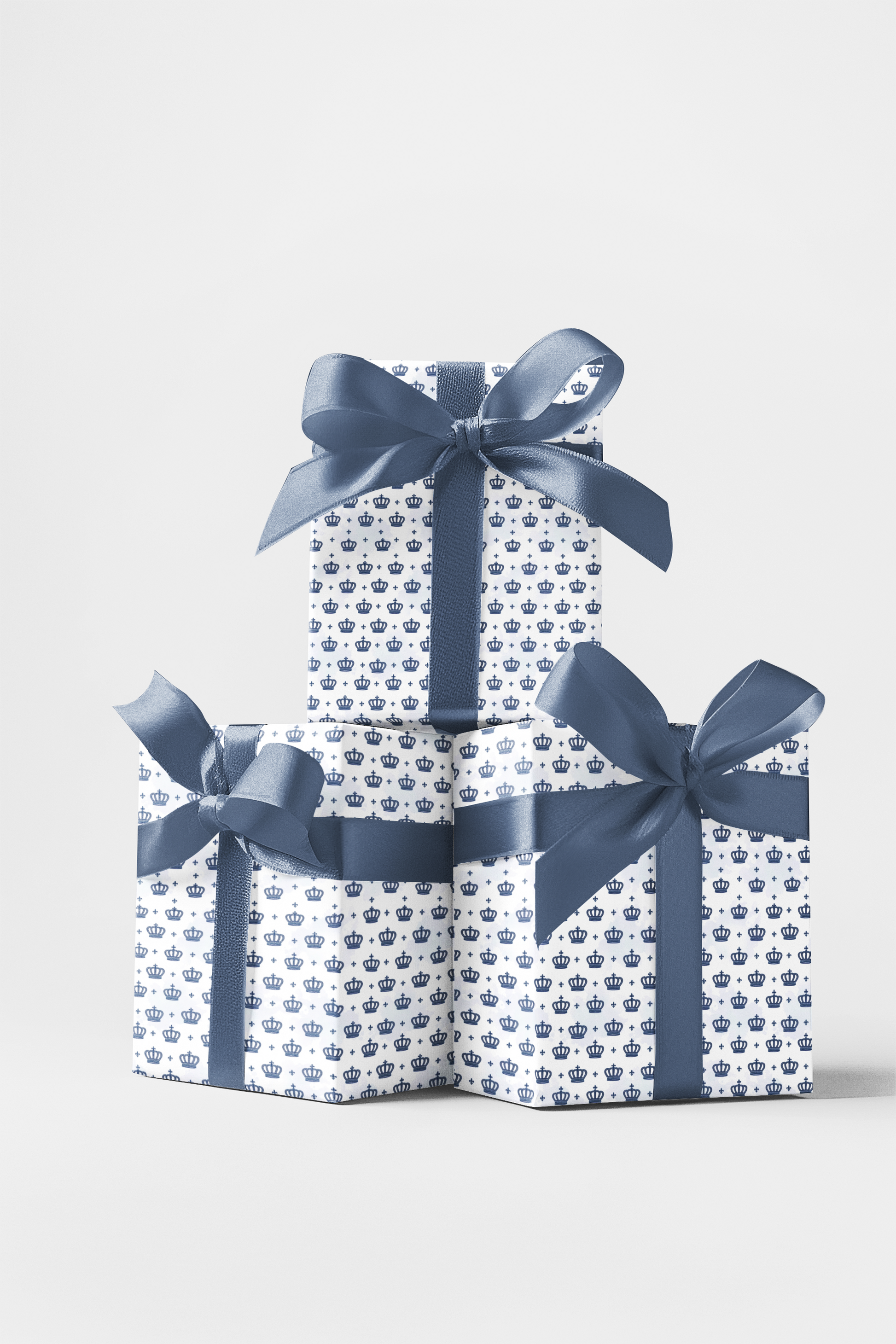Graceful and dignified, Royal Crown exudes timeless elegance and quiet majesty. Each sapphire-toned crown rests upon a soft ivory field, creating a pattern fit for celebrations of both grandeur and grace. The delicate repetition of regal motifs recalls old-world heraldry while maintaining a fresh, modern charm. This design embodies sophistication and prestige—where every gift wrapped within feels like a treasure, and every fold carries the poise of royalty.