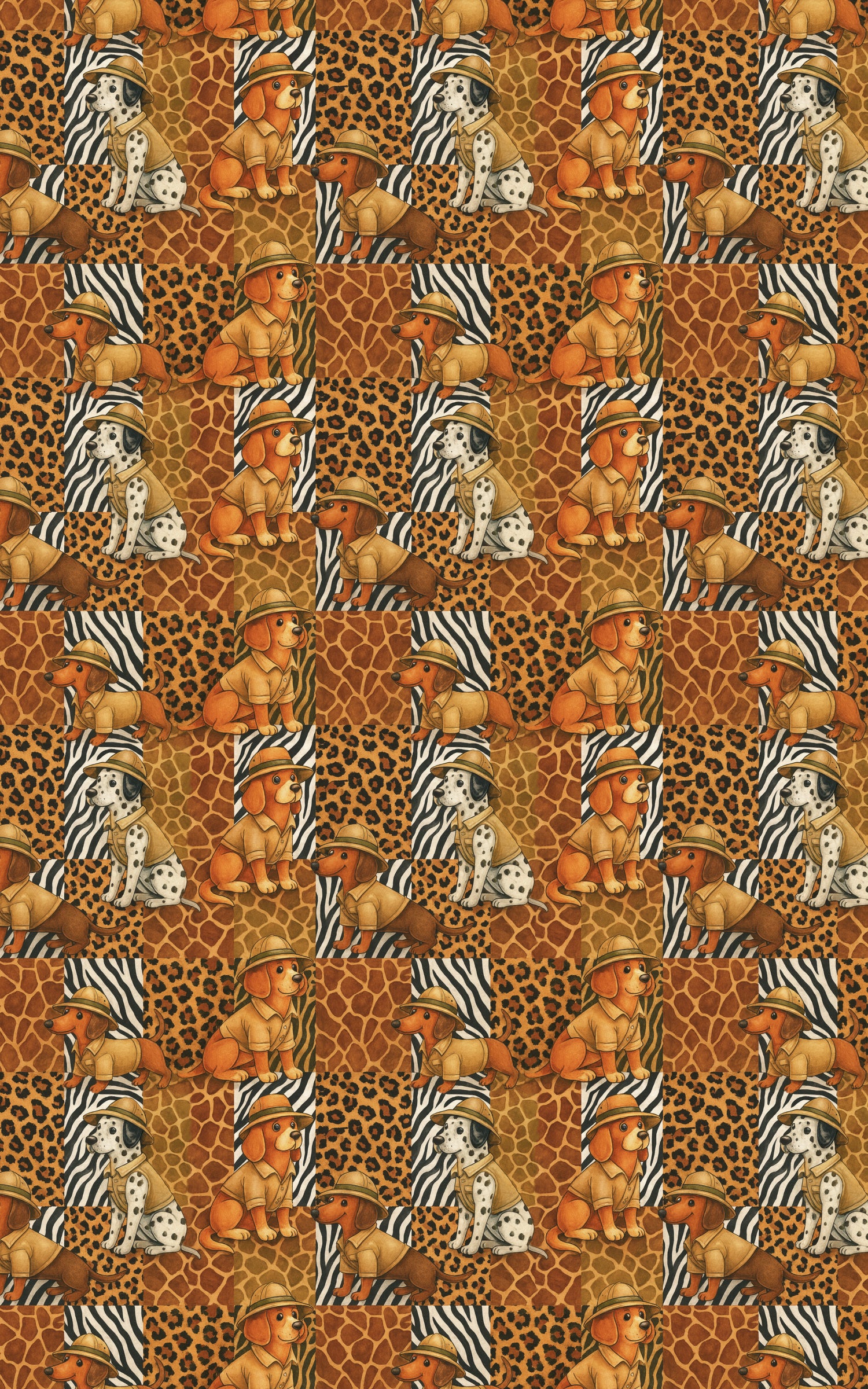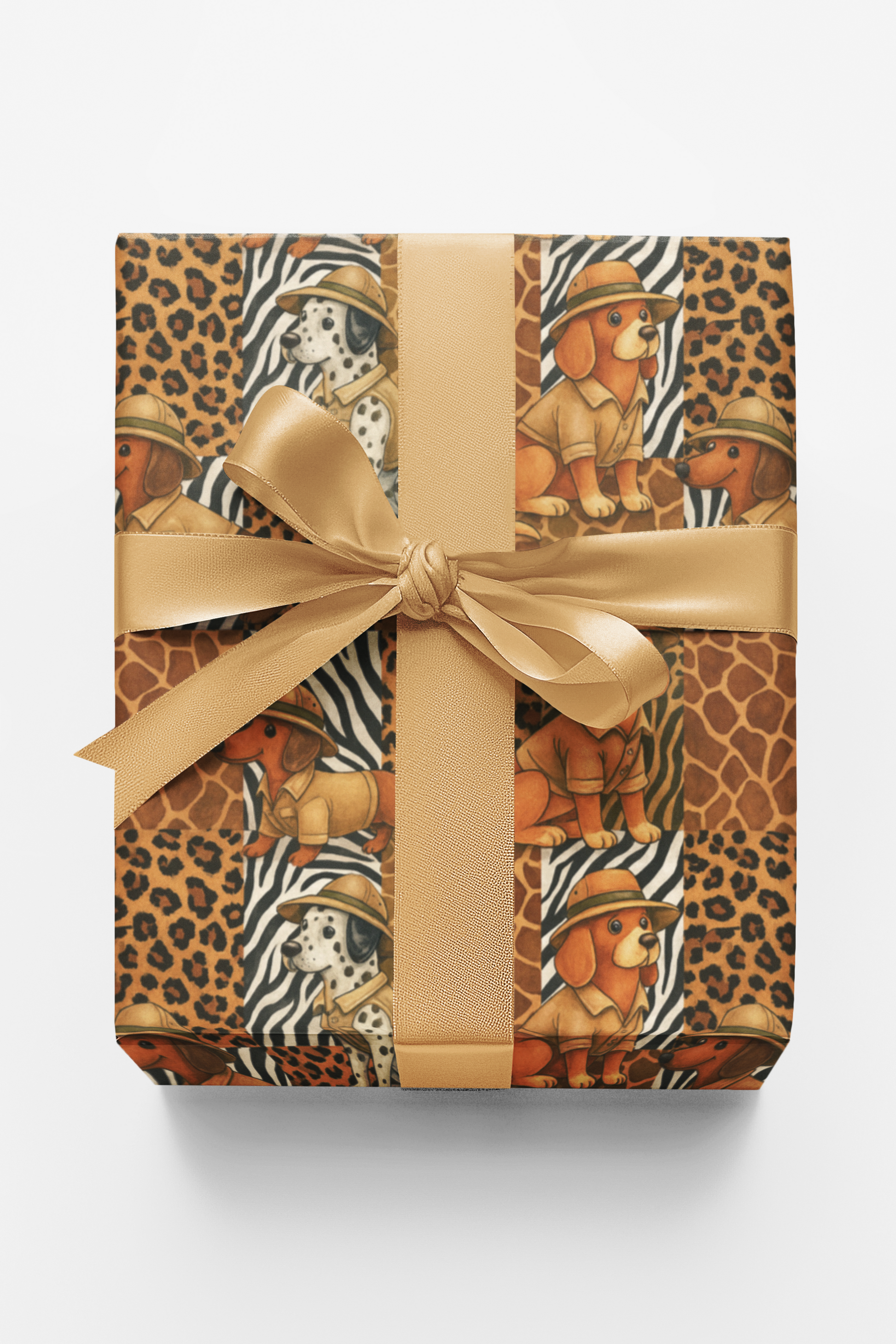 Dressed for discovery and full of spirit, Safari Snouts bounds into the wild with charm and courage. Against a backdrop of zebra stripes, leopard spots, and giraffe prints, these adventurous pups don their safari hats and explorer gear with pride. Every fold captures the thrill of exploration and the joy of curiosity—where playful paws meet untamed patterns, and every gift becomes an expedition into pure imagination.