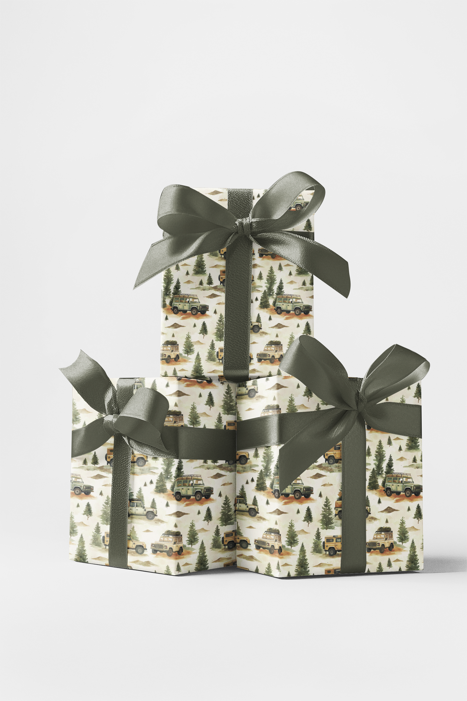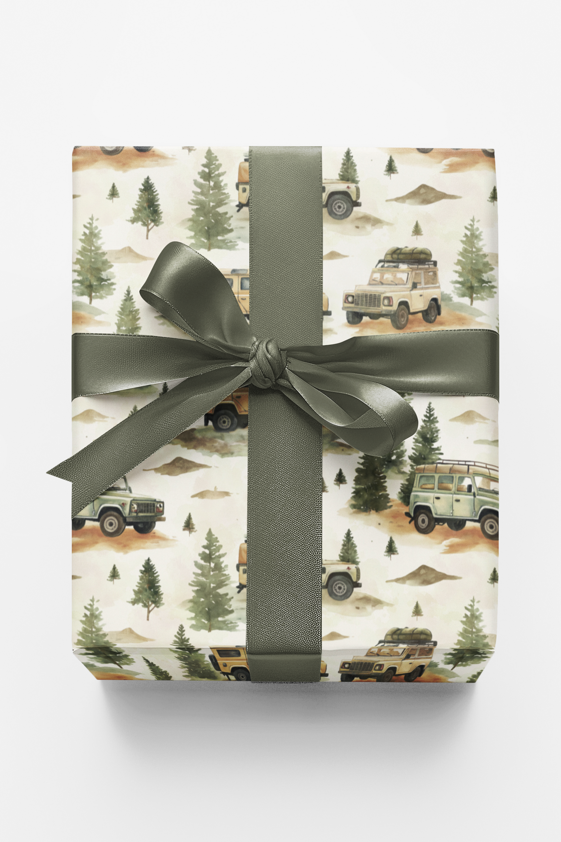Bring the spirit of exploration to your gifts with this beautifully illustrated wrapping paper, featuring hand-painted vintage off-road vehicles set against watercolor pines and mountain landscapes. The design captures a nostalgic sense of wanderlust and outdoor adventure, blending earthy tones of sage green, sand beige, and soft gray with a touch of rustic charm. Perfect for birthdays, Father’s Day, holidays, or any celebration for the adventurer at heart, this artisanal print adds a warm, storybook quality to your gift wrapping. Pair it with natural twine or metallic ribbon for a polished, rugged-luxe presentation that feels both timeless and personal.