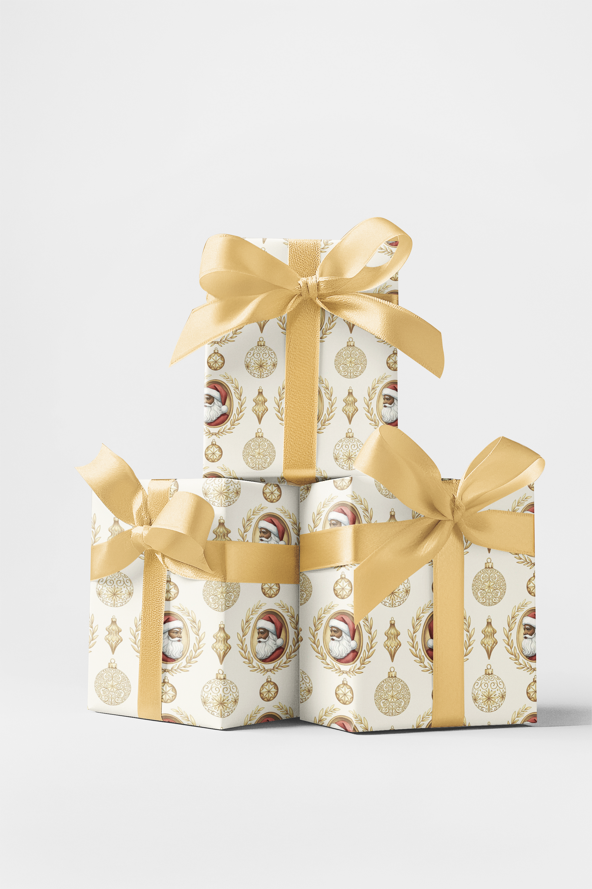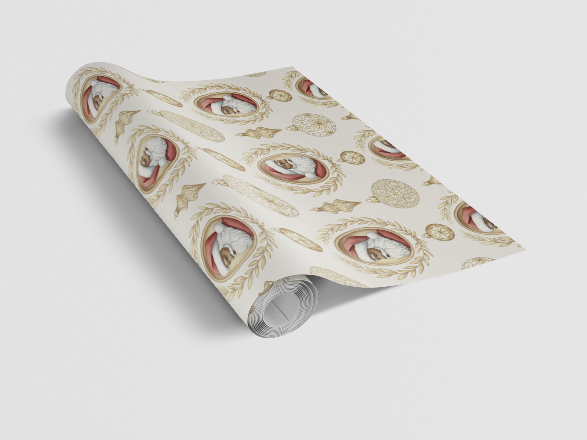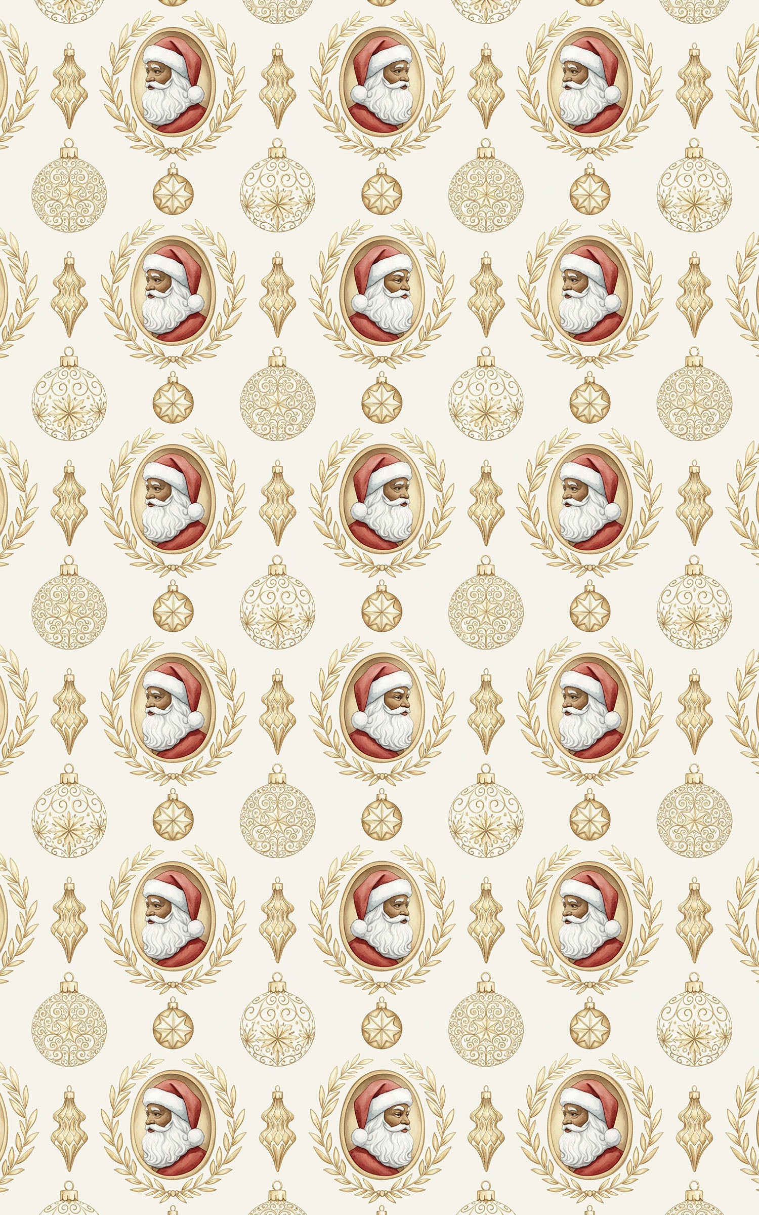 Santa takes center stage in regal cameo portraits, each framed by ornate baroque wreaths and paired with shining gold ornaments. This elegant pattern brings timeless holiday grandeur, wrapping every gift in a touch of vintage splendor. Perfect for presents that deserve sophistication and sparkle this season. Because let’s face it—Santa’s not just a holiday icon, he’s the centerpiece of Christmas luxury.
