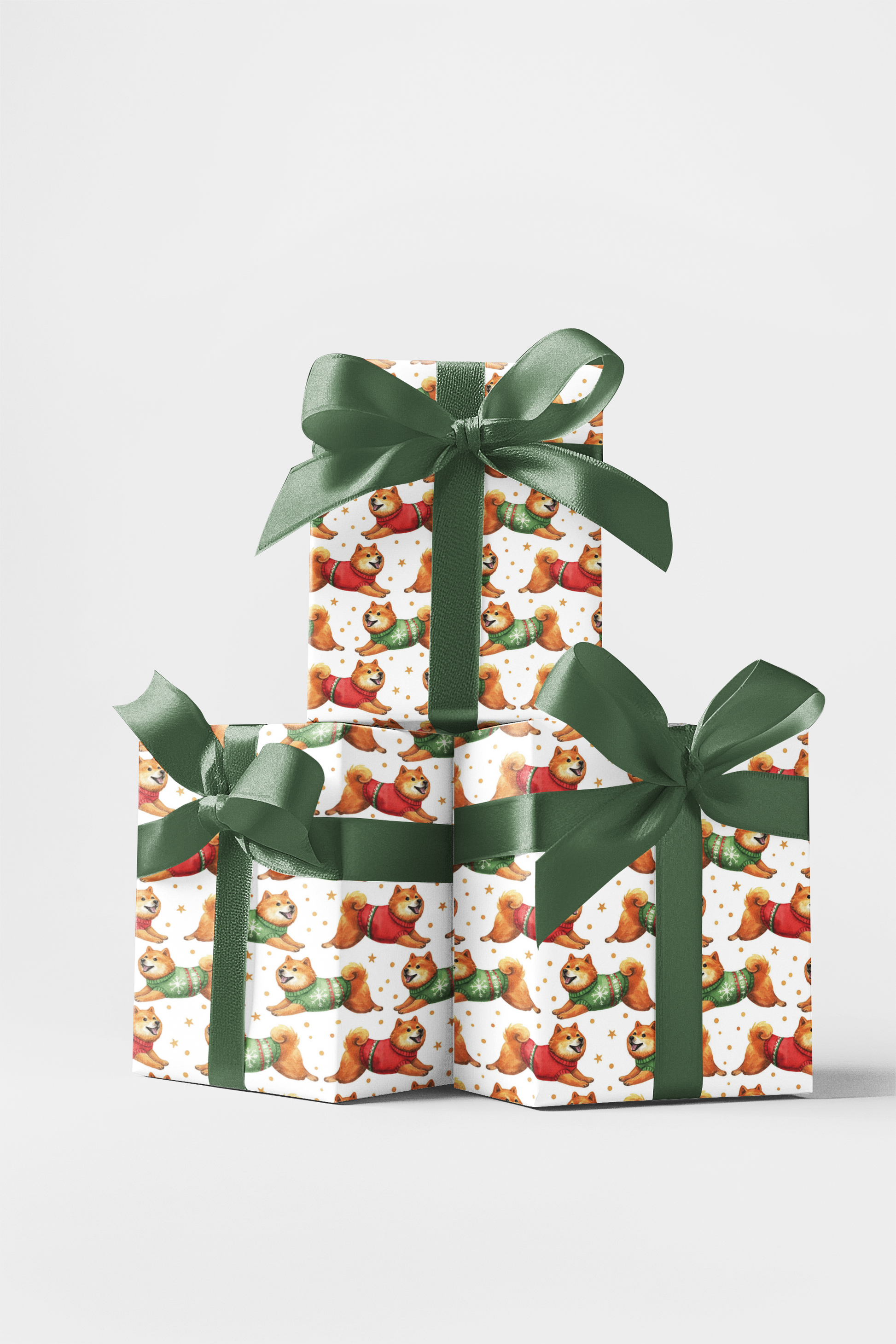 Bring joy to your holiday gifting with this charming wrapping paper featuring a happy Shiba Inu playfully running in festive sweaters. The watercolor design captures the pup’s cheerful spirit, adding warmth and energy to every present. Perfect for dog lovers and holiday celebrations alike.