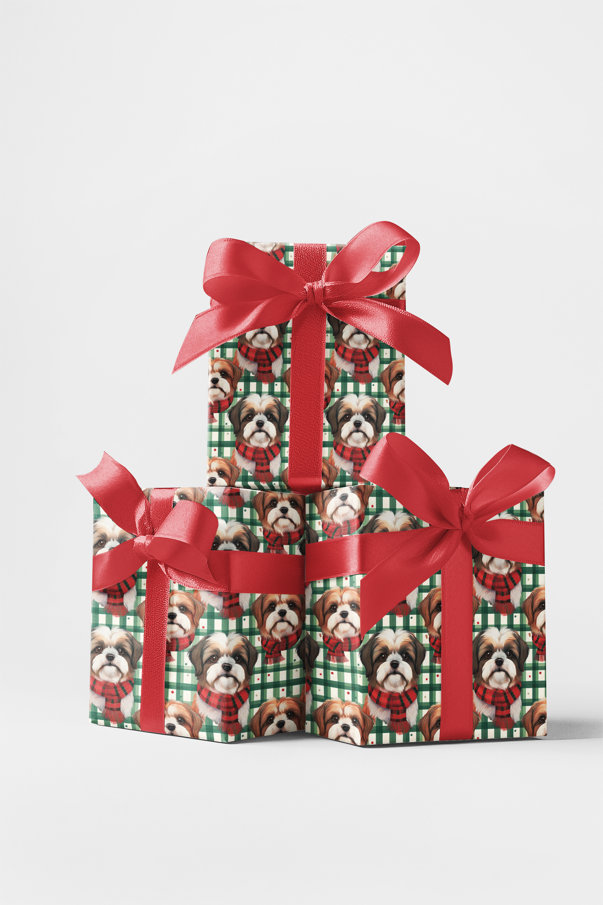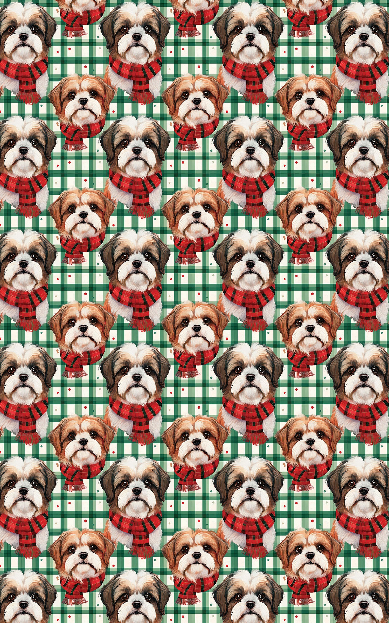 Shih Tzu Plaid Parade wraps your gifts in festive charm, featuring adorable Shih Tzus dressed in cozy scarves, set against a classic red and green plaid background. Painted in soft watercolor and arranged in a seamless repeat, this playful yet heartwarming design is perfect for dog lovers and holiday celebrations, adding a cheerful touch to every present.