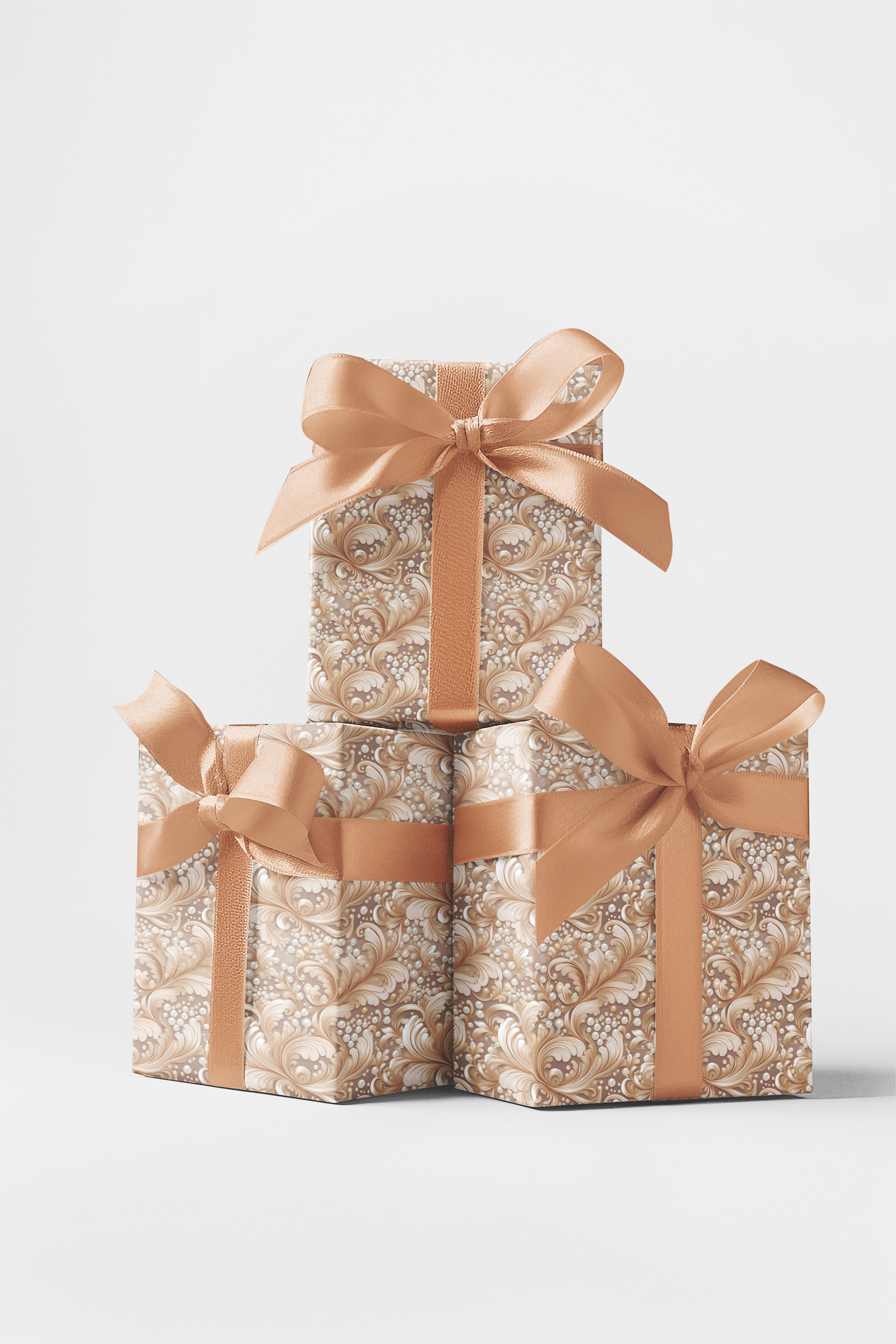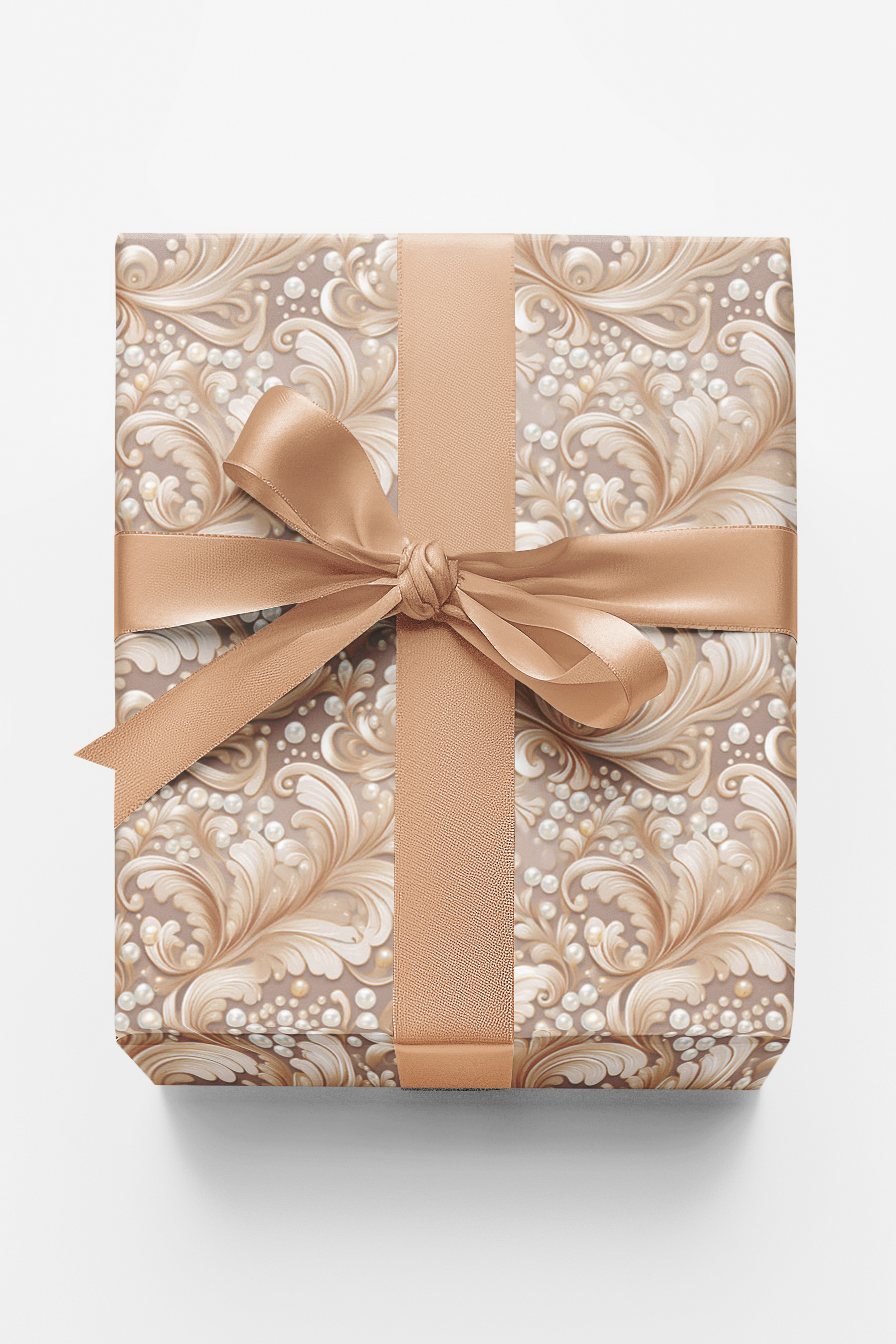 Wrap your most cherished gifts in the breathtaking opulence of our "Silk & Pearl" luxury wrapping paper. This design presents a masterclass in regal elegance, featuring grand-scale ivory acanthus scrolls and flourishing damask frameworks that appear to be delicately embossed against a warm, silken taupe background. The pattern is meticulously adorned with a cascade of high-fidelity pearl accents—varying from tiny seed pearls to large, luminous orbs—that create a stunning three-dimensional effect of depth and texture. Perfectly suited for high-end weddings, milestone anniversaries, or gala celebrations, this timeless aesthetic transforms every gift into a statement of couture-ready sophistication.