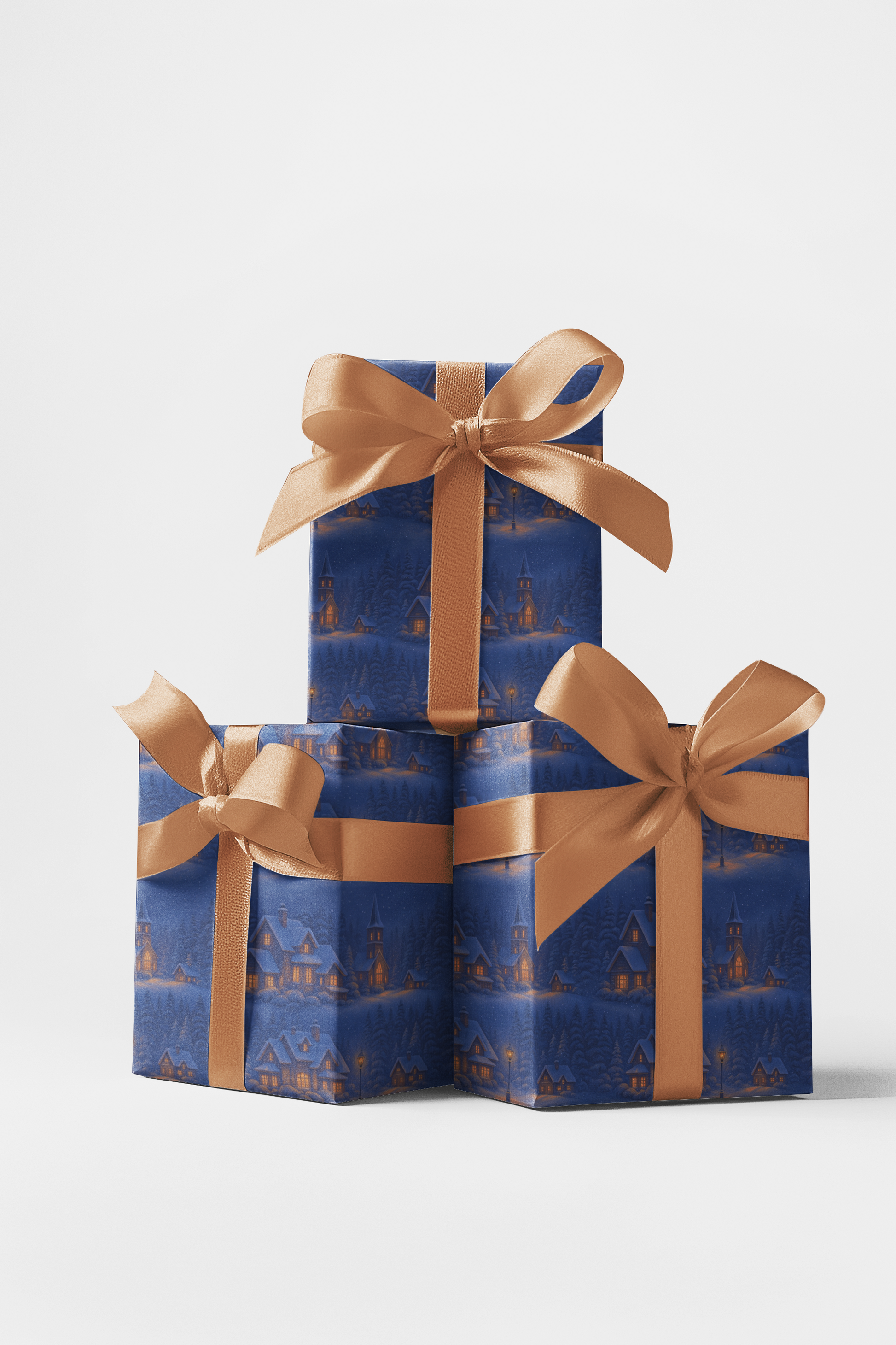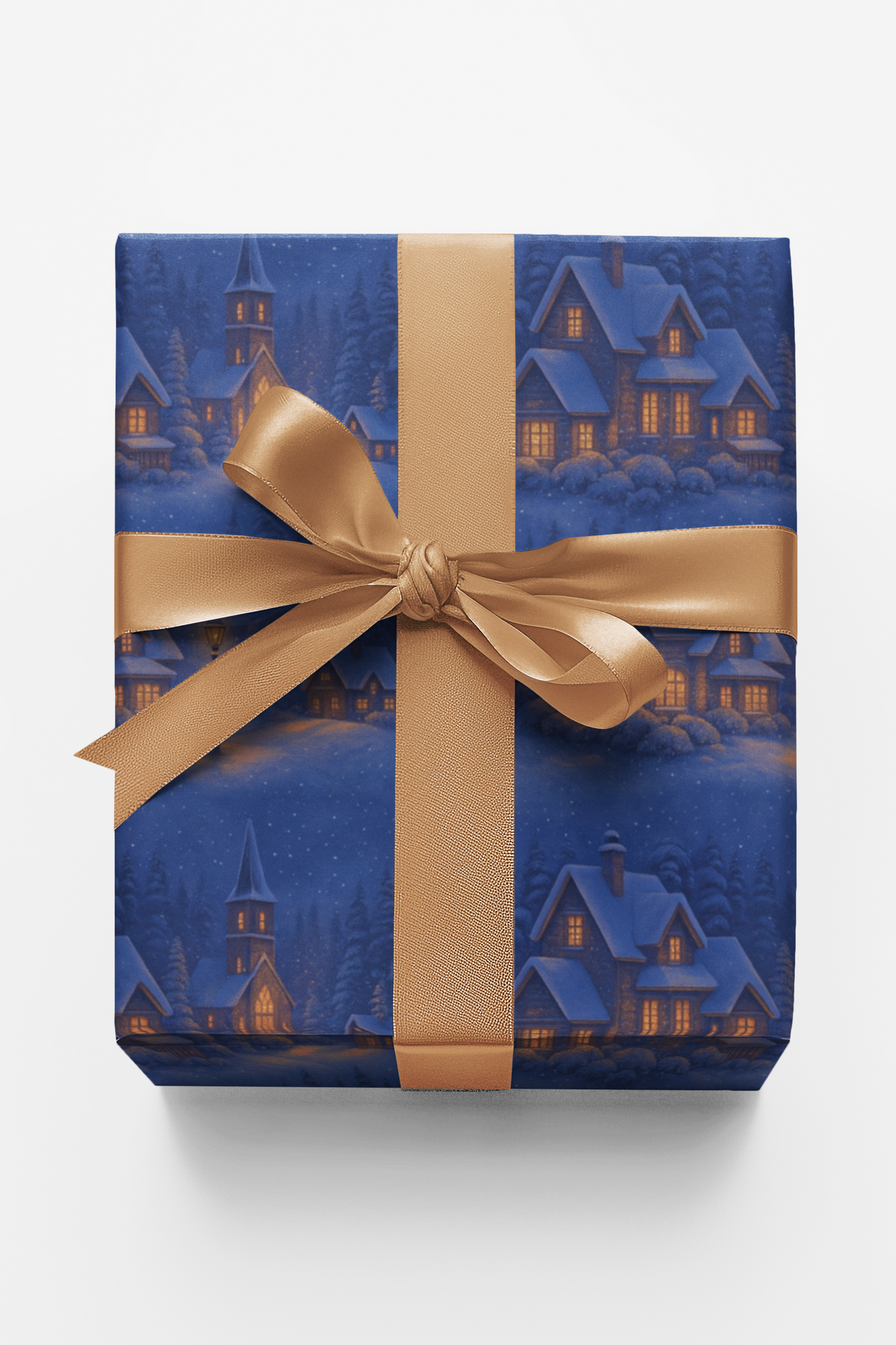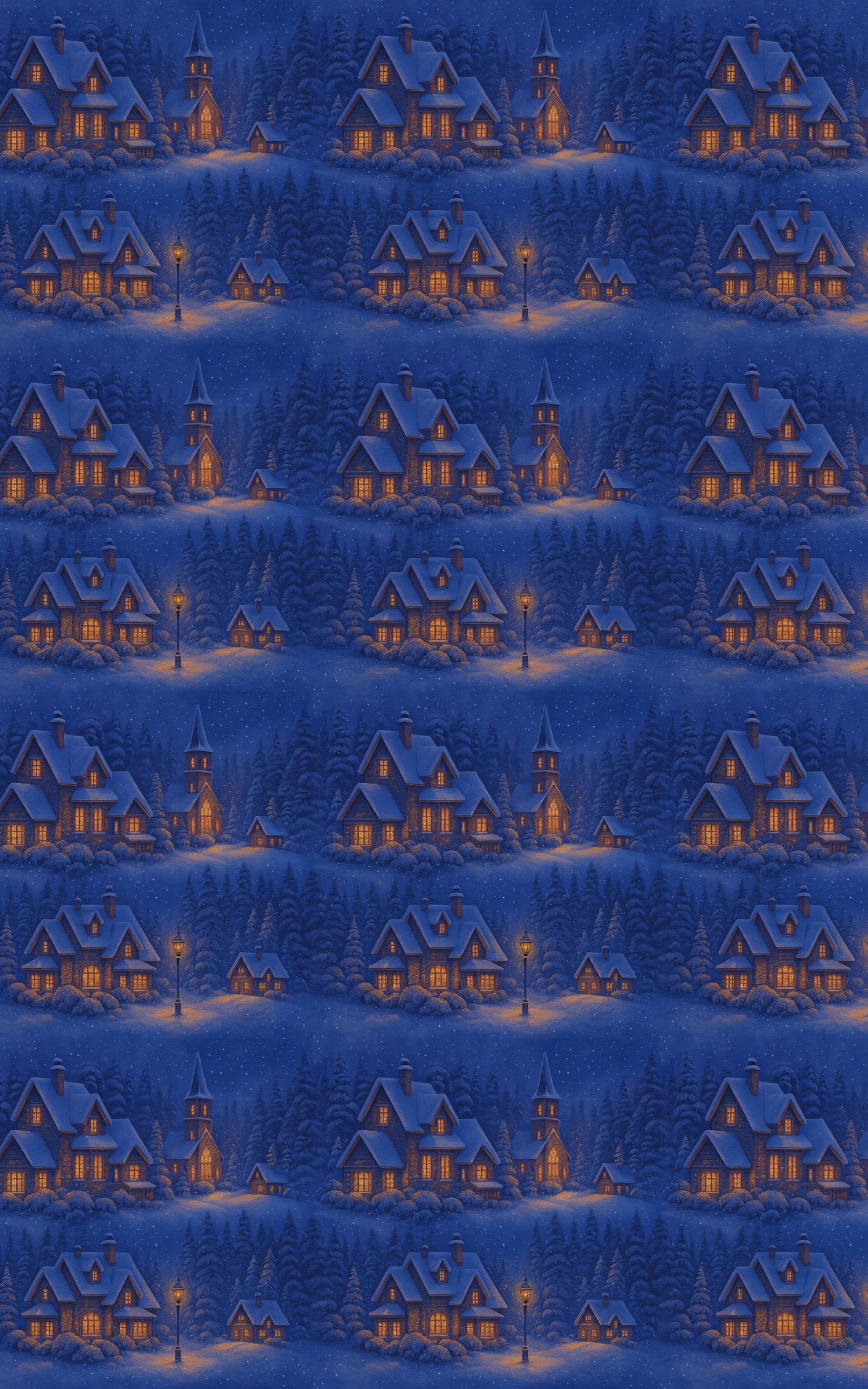 Wrapped in a blanket of midnight blue and powdered with gentle snow, this cozy village glows with warmth against the winter night. Each cottage flickers with golden light, like little hearts beating softly beneath the cold sky. Quiet pine forests cradle the homes, while lampposts spill halos of amber across the drifts. This design captures the serene magic of winter’s embrace—where every window whispers comfort, every rooftop sparkles with calm, and every scene invites you into a world of timeless, peaceful wonder.