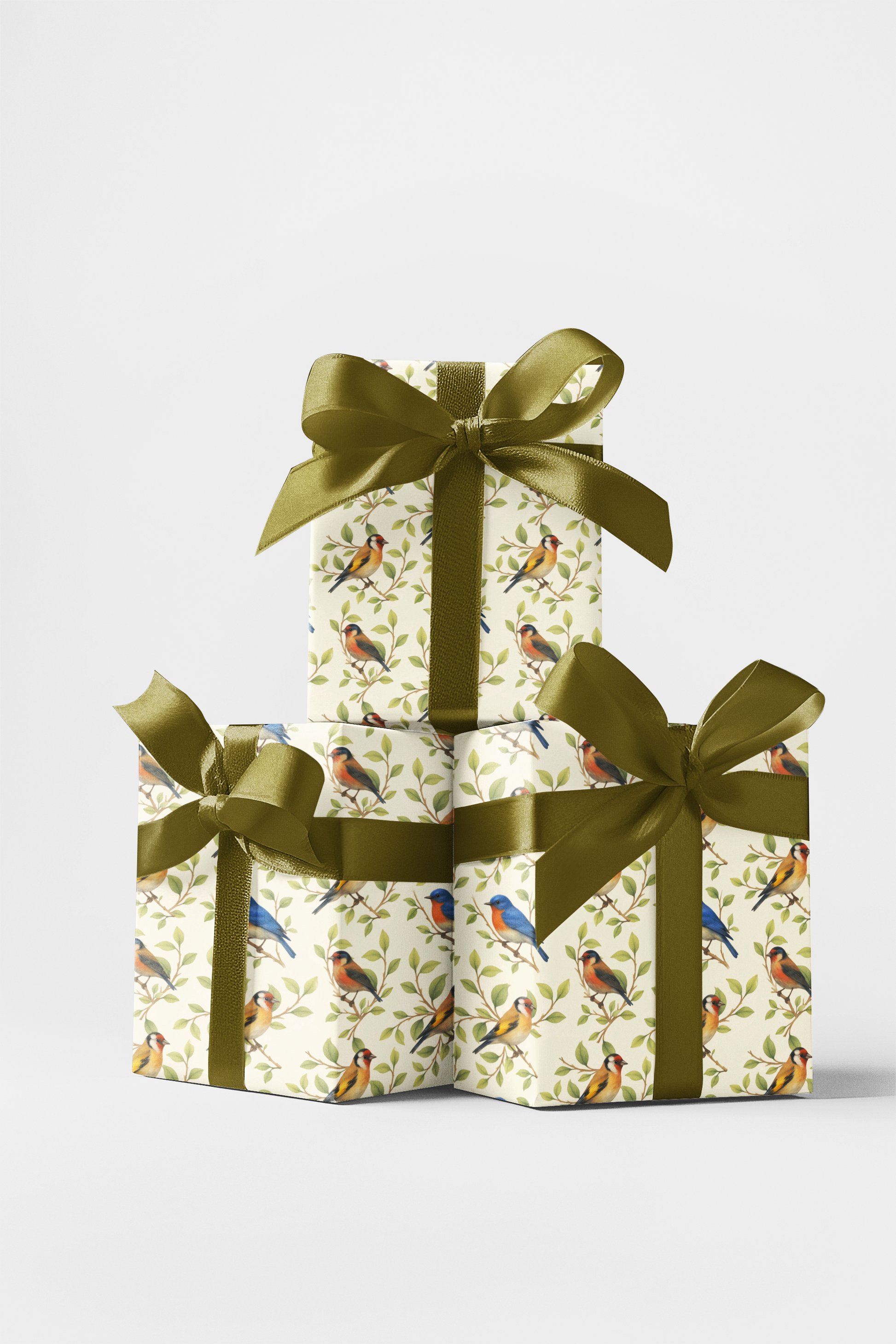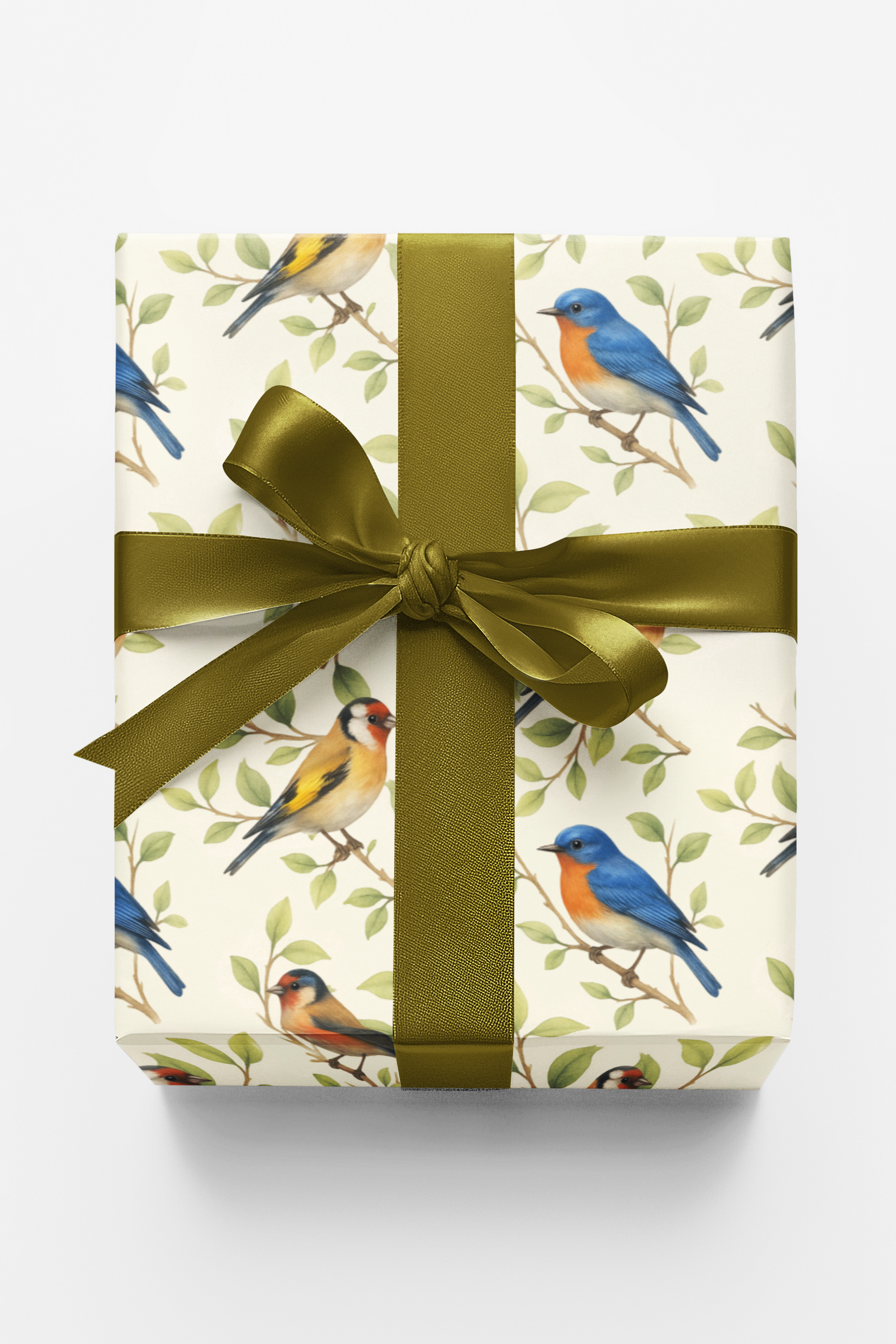 Bring the beauty of nature to your celebrations with this exquisite songbird design. Featuring finely detailed birds in vivid hues of blue, gold, and russet, resting gracefully among soft green branches, this wrapping paper exudes classic sophistication. Ideal for special occasions, it pairs the serenity of nature with refined artistry turning every gift into a moment of elegance.