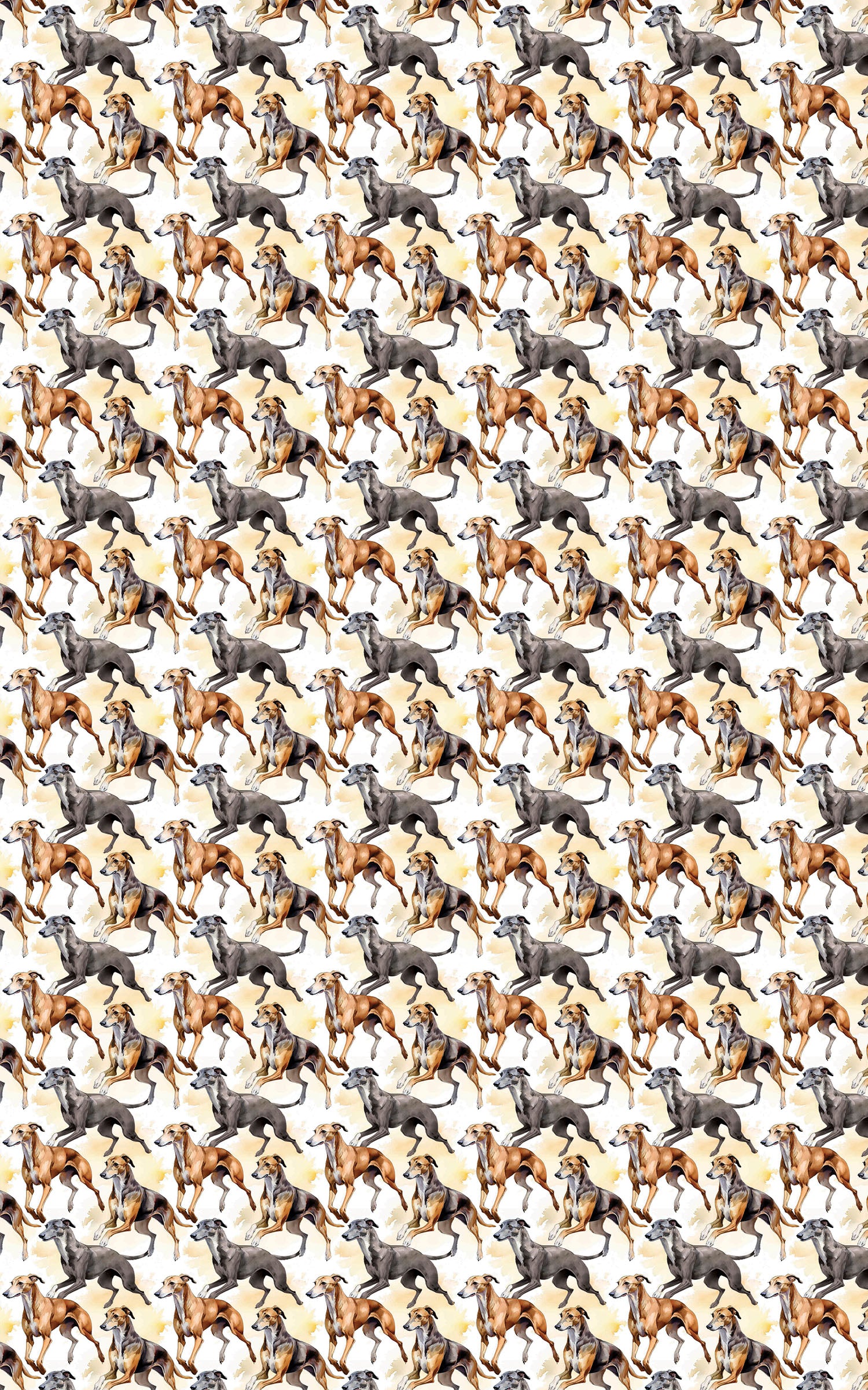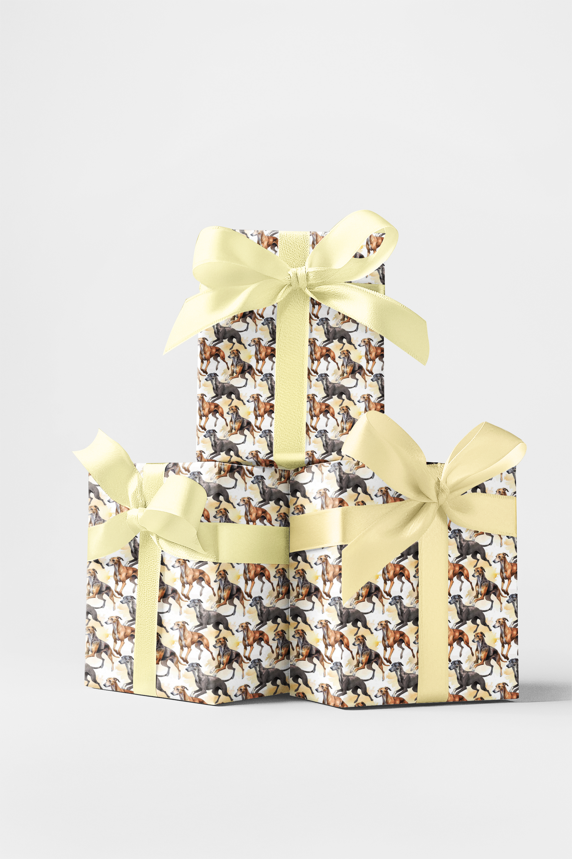 The Greyhound moves with grace and speed, sleek and elegant in every shade and shape—each one a swift spirit with a gentle heart. This design celebrates the beauty of every dog, from the noble stance of a Shepherd to the playful bounce of a Beagle. A wrapping paper made not just to cover gifts, but to honor the soul of every dog we've ever loved.