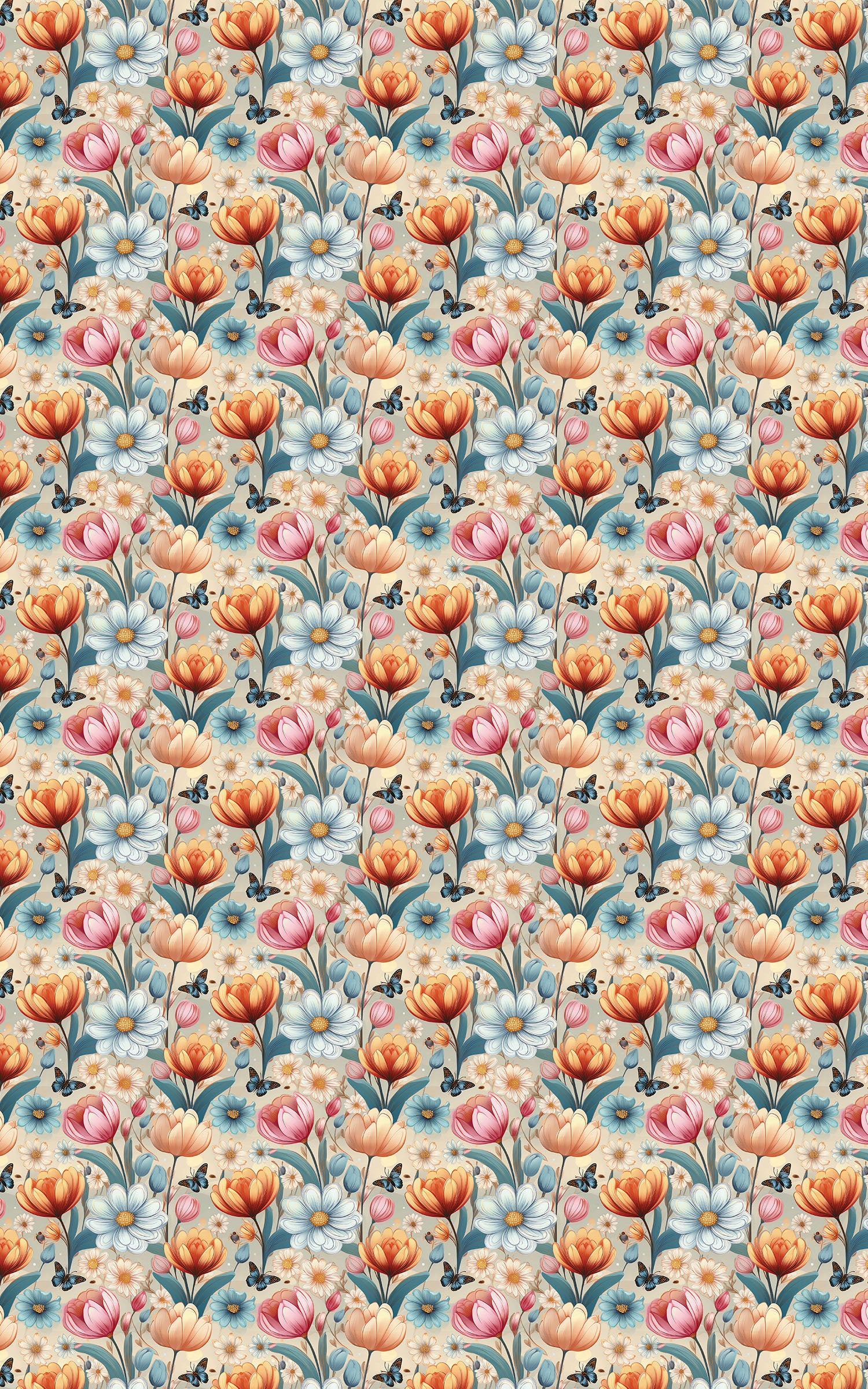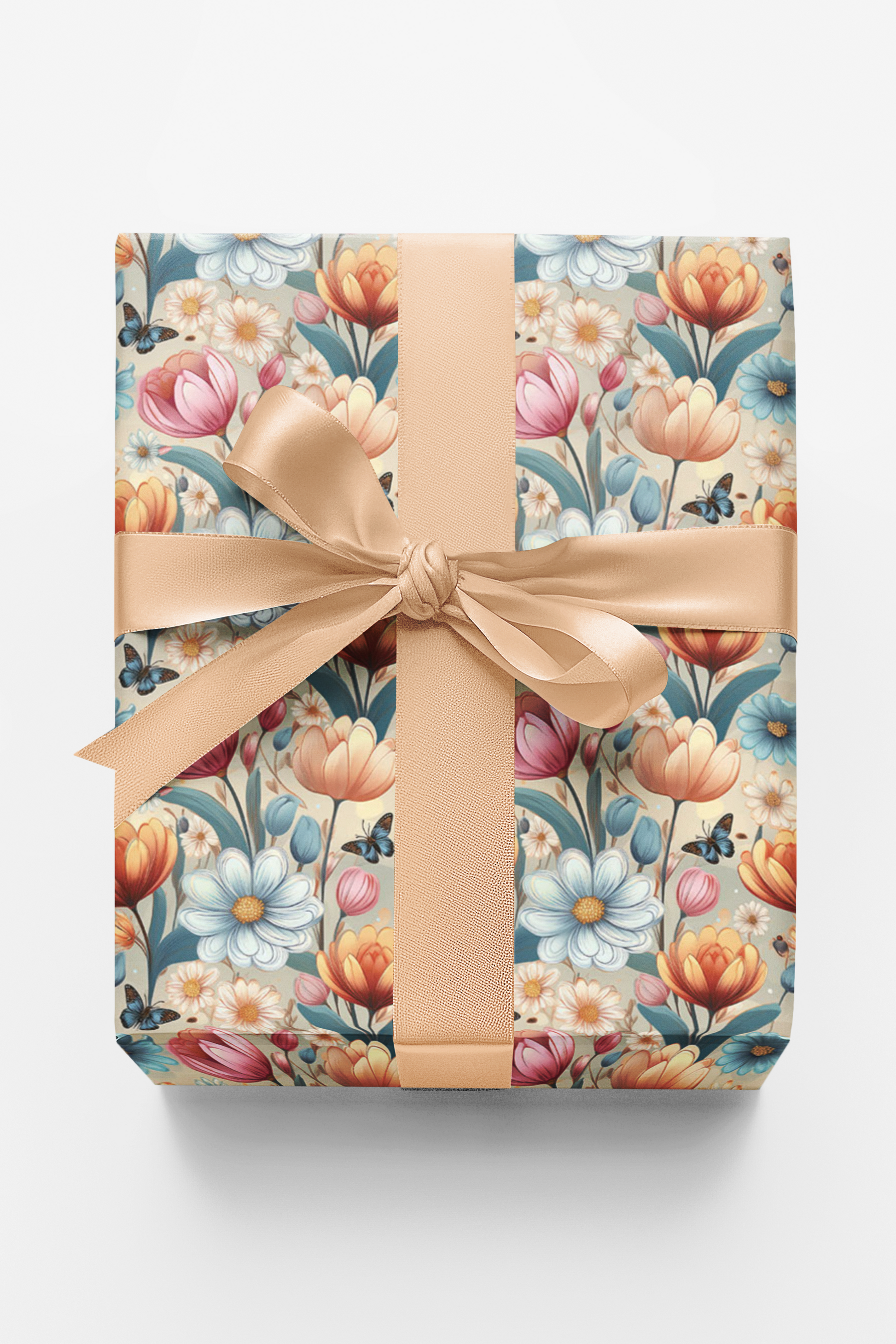 Celebrate the season of renewal with our Spring Equinox wrapping paper! This lush, seamless pattern captures the joyous beauty of a meadow bursting into bloom, featuring watercolor-style illustrations of tall tulips, cheerful daisies, and tiny blue and white wildflowers. Small butterflies flutter throughout the dense pattern, adding movement and life. The bright, cheerful palette includes shades of coral, sunny orange, pastel pink, and soft blue, all set against a neutral, calming background. It is the perfect wrap for Mother's Day, Easter, spring birthdays, housewarmings, or any occasion that calls for a fresh, optimistic, and beautiful presentation.