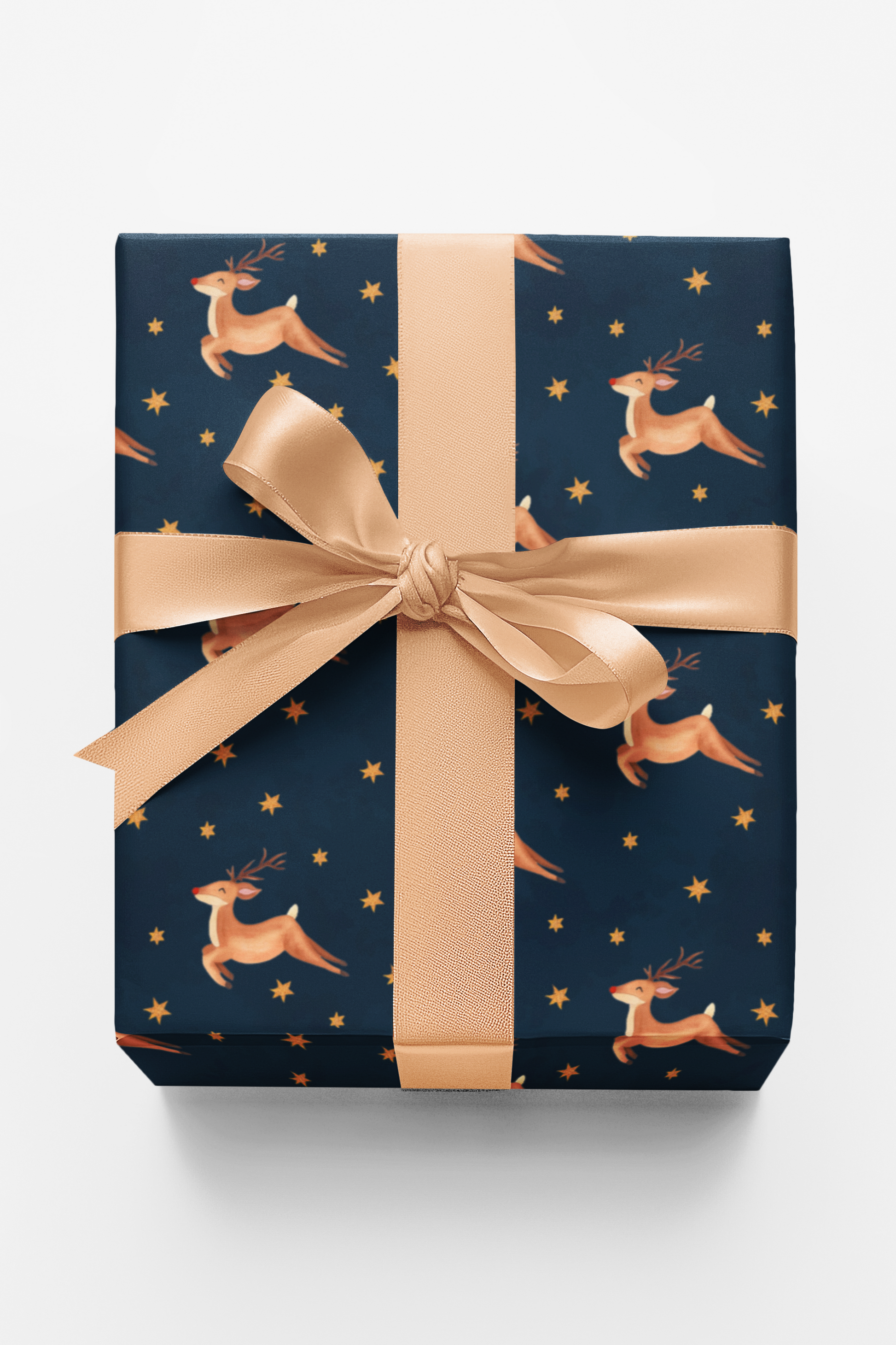 Leaping across a canvas of deep midnight blue, Midnight Reindeer glows with the golden magic of a winter’s night. Each reindeer soars among twinkling stars, their copper tones shimmering like firelight against the dark sky. The design captures the quiet wonder of Christmas Eve — graceful, timeless, and full of anticipation. Every fold tells a story of starlit journeys and festive dreams, wrapping your gifts in the luminous spirit of the season’s most enchanting flight.